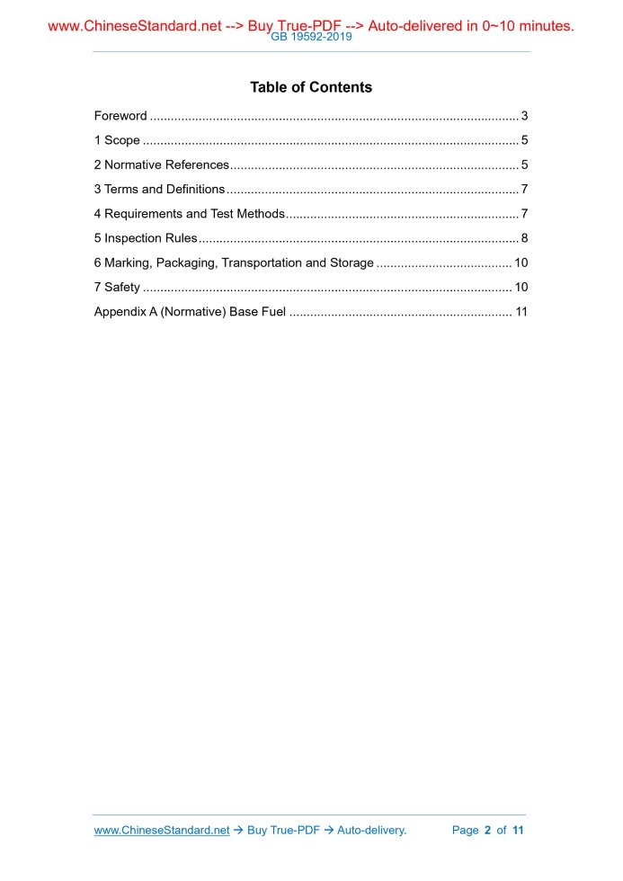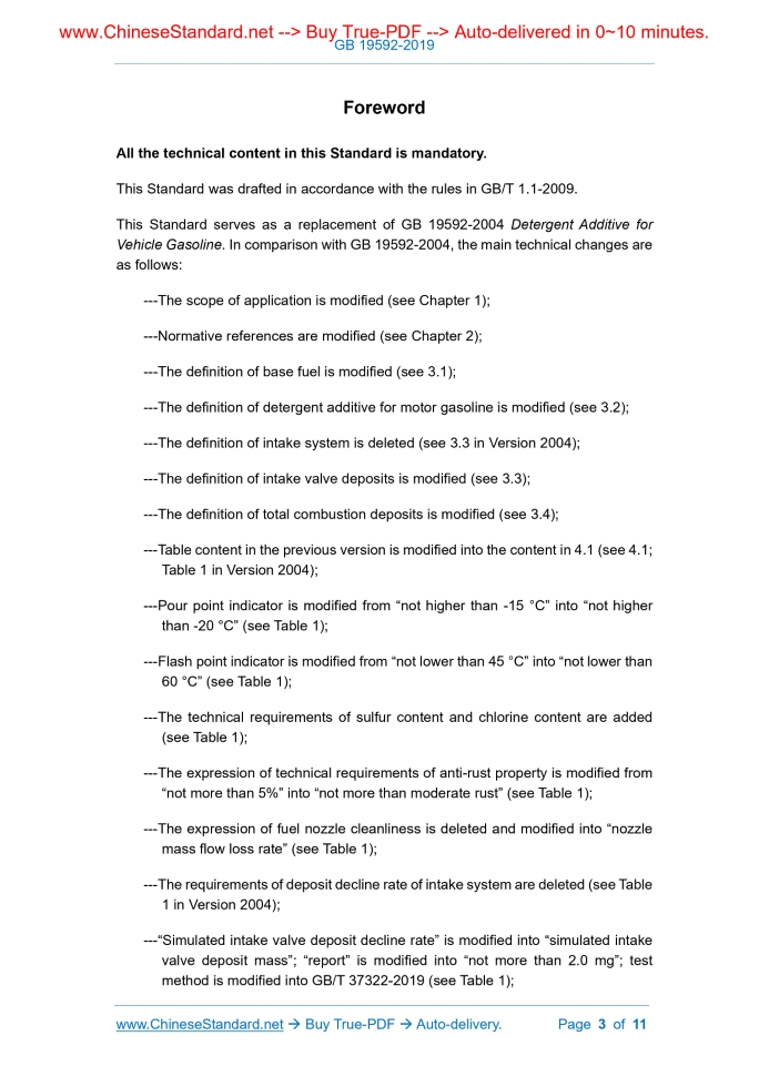 Similar standardsGB 19592-2019: Detergent Additive for Motor Gasoline---This is an excerpt. Full copy of true-PDF in English version (including equations, symbols, images, flow-chart, tables, and figures etc.), auto-downloaded/delivered in 9 seconds, can be purchased online: https://www.ChineseStandard.net/PDF.aspx/GB19592-2019NATIONAL STANDARD OF THE PEOPLE’S REPUBLIC OF CHINA ICS 75.140 E 61 Replacing GB 19592-2004 Detergent Additive for Motor Gasoline Issued on. OCTOBER 14, 2019 Implemented on. MAY 1, 2020 Issued by. State Administration for Market Regulation; Standardization Administration of the People’s Republic of China. Table of ContentsForeword... 3 1 Scope... 5 2 Normative References... 5 3 Terms and Definitions... 7 4 Requirements and Test Methods... 7 5 Inspection Rules... 8 6 Marking, Packaging, Transportation and Storage... 10 7 Safety... 10 Appendix A (Normative) Base Fuel... 11ForewordAll the technical content in this Standard is mandatory. This Standard was drafted in accordance with the rules in GB/T 1.1-2009. This Standard serves as a replacement of GB 19592-2004 Detergent Additive for Vehicle Gasoline. In comparison with GB 19592-2004, the main technical changes are as follows. ---The scope of application is modified (see Chapter 1); ---Normative references are modified (see Chapter 2); ---The definition of base fuel is modified (see 3.1); ---The definition of detergent additive for motor gasoline is modified (see 3.2); ---The definition of intake system is deleted (see 3.3 in Version 2004); ---The definition of intake valve deposits is modified (see 3.3); ---The definition of total combustion deposits is modified (see 3.4); ---Table content in the previous version is modified into the content in 4.1 (see 4.1; Table 1 in Version 2004); ---Pour point indicator is modified from “not higher than -15 °C” into “not higher than -20 °C” (see Table 1); ---Flash point indicator is modified from “not lower than 45 °C” into “not lower than 60 °C” (see Table 1); ---The technical requirements of sulfur content and chlorine content are added (see Table 1); ---The expression of technical requirements of anti-rust property is modified from “not more than 5%” into “not more than moderate rust” (see Table 1); ---The expression of fuel nozzle cleanliness is deleted and modified into “nozzle mass flow loss rate” (see Table 1); ---The requirements of deposit decline rate of intake system are deleted (see Table 1 in Version 2004); ---“Simulated intake valve deposit decline rate” is modified into “simulated intake valve deposit mass”; “report” is modified into “not more than 2.0 mg”; test method is modified into GB/T 37322-2019 (see Table 1); ---Technical indicators of average intake valve deposit mass are modified, in other words, Method 1 is modified from “not more than 70 mg” into “not more than 30 mg”; Method 2 is modified from “not more than 130 mg” into “not more than 50 mg” (see Table 1); ---“Total combustion chamber deposit increase” is modified into “total combustion chamber deposit mass increase”; technical indicator is modified from “not more than 40%” into “not more than 30%” (see Table 1); ---A part of content in Note b in the previous version is modified into NOTE e (see Table 1); the other part of content is placed into Appendix A (see Table A.1; Table 1 in Version 2004); ---Note f is added to Table 1 (see Table 1); ---Inspection rules are modified (see Chapter 5); ---The content of designation is deleted (see Chapter 6 in 2004); ---The content of safety is added (see Chapter 7); ---Appendix A Base Fuel is modified (see Appendix A); ---Appendix B Gasoline Engine Intake Valve Deposit Simulation Test Method in the previous version is deleted (see Appendix B in Version 2004). This Standard was proposed by and shall be under the jurisdiction of National Energy Administration. The drafting organizations of this Standard. SINOPEC Research Institute of Petroleum Processing; Lanzhou Lubricant Research and Development Center of PetroChina Company Limited; Chinese Research Academy of Environmental Sciences; Shenzhen JPLUS Chemical Technology Co., Ltd.; Shandong EFIRM Biochemistry and Environmental Protection Co., Ltd. The main drafters of this Standard. Zhangxin, Liu Quanshan, Miao Qile, Yuexin, Li Ruibo, Xie Jianhai, Chen Yumeng, Liang Wangen, Sunmeng. The issuing of the previous versions of the standard replaced by this Standard is as follows. ---GB 19592-2004. Detergent Additive for Motor Gasoline Warning. if appropriate precautions are not abided by, there might be dangers in the production, storage, transportation and usage process of products that belong to this Standard. This Standard does not intend to propose suggestions to all the safety issues related with the products. Before putting this Standard into effect, users shall undertake the responsibility of establishing appropriate safety and preventive measures; confirming the applicability of relevant stipulations and restrictions.1 ScopeThis Standard stipulates the terms and definitions, requirements, test methods, inspection rules, marking, packaging, transportation, storage and safety of detergent additive for motor gasoline. This Standard is applicable to detergent additives used in motor gasoline and motor ethanol gasoline.2 Normative ReferencesThe following documents are indispensable to the application of this document. In terms of references with a specified date, only versions with a specified date are applicable to this document. In terms of references without a specified date, the latest version (including all the modifications) is applicable to this document. GB 190 Packing Symbol of Dangerous Goods; GB/T 261 Determination of Flash Point - Pensky-Martens Closed Cup Method; GB/T 511 Petroleum, Petroleum Products and Additives - Method for Determination of Mechanical Admixtures; GB/T 3535 Petroleum Products - Determination of Pour Po