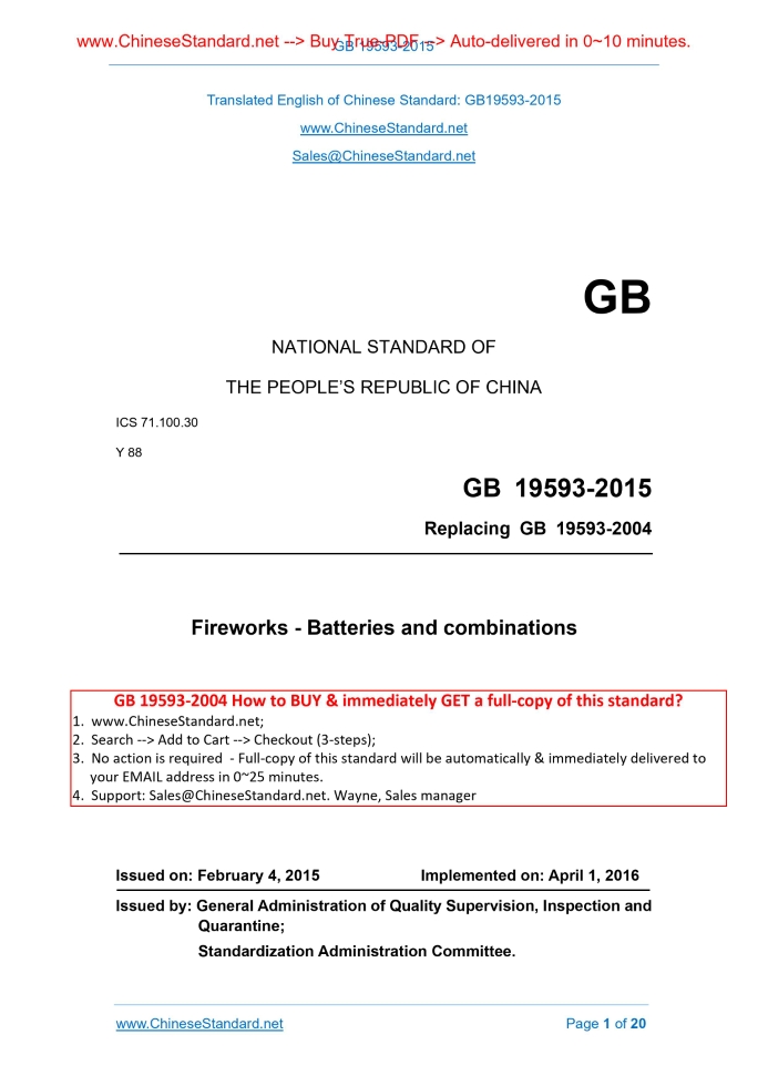 GB 19593-2015: Fireworks - Batteries and combinations Delivery: 9 seconds. True-PDF full-copy in English & invoice will be downloaded + auto-delivered via email. See step-by-step procedure Status: Valid GB 19593: Historical versions