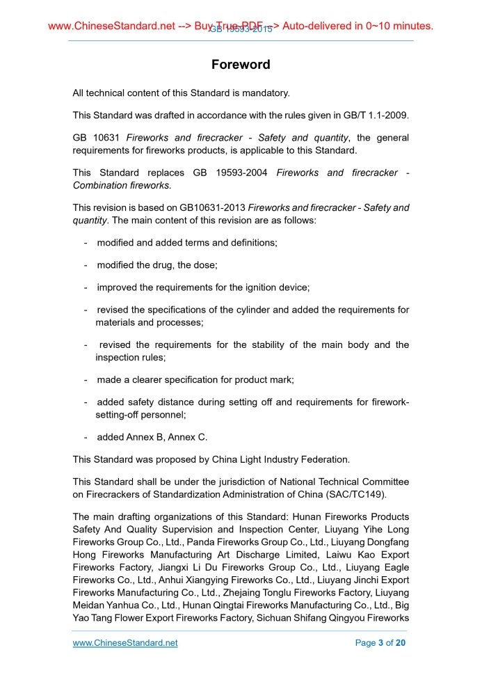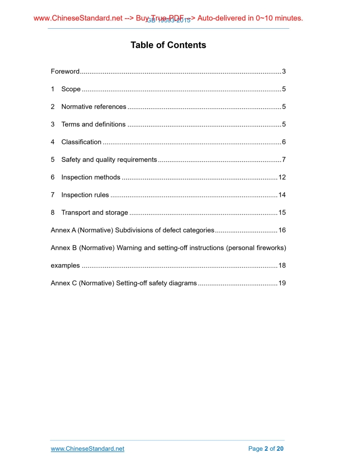 Similar standardsGB 19593-2015: Fireworks - Batteries and combinations---This is an excerpt. Full copy of true-PDF in English version (including equations, symbols, images, flow-chart, tables, and figures etc.), auto-downloaded/delivered in 9 seconds, can be purchased online: https://www.ChineseStandard.net/PDF.aspx/GB19593-2015GB NATIONAL STANDARD OF THE PEOPLE’S REPUBLIC OF CHINA ICS 71.100.30 Y 88 Replacing GB 19593-2004 Fireworks - Batteries and combinations 烟花爆竹 组合烟花 Issued on: FEBRUARY 4, 2015 Implemented on: APRIL 1, 2016 Issued by. General Administration of Quality Supervision, Inspection and Quarantine; Standardization Administration Committee. Table of ContentsForeword ... 3 1 Scope ... 5 2 Normative references ... 5 3 Terms and definitions ... 5 4 Classification ... 6 5 Safety and quality requirements ... 7 6 Inspection methods ... 12 7 Inspection rules ... 14 8 Transport and storage ... 15 Annex A (Normative) Subdivisions of defect categories ... 16 Annex B (Normative) Warning and setting-off instructions (personal fireworks) examples ... 18 Annex C (Normative) Setting-off safety diagrams ... 19ForewordAll technical content of this Standard is mandatory. This Standard was drafted in accordance with the rules given in GB/T 1.1-2009. GB 10631 Fireworks and firecracker - Safety and quantity, the general requirements for fireworks products, is applicable to this Standard. This Standard replaces GB 19593-2004 Fireworks and firecracker - Combination fireworks. This revision is based on GB10631-2013 Fireworks and firecracker - Safety and quantity. The main content of this revision are as follows. - modified and added terms and definitions; - modified the drug, the dose; - improved the requirements for the ignition device; - revised the specifications of the cylinder and added the requirements for materials and processes; - revised the requirements for the stability of the main body and the inspection rules; - made a clearer specification for product mark; - added safety distance during setting off and requirements for firework- setting-off personnel; - added Annex B, Annex C. This Standard was proposed by China Light Industry Federation. This Standard shall be under the jurisdiction of National Technical Committee on Firecrackers of Standardization Administration of China (SAC/TC149). The main drafting organizations of this Standard. Hunan Fireworks Products Safety And Quality Supervision and Inspection Center, Liuyang Yihe Long Fireworks Group Co., Ltd., Panda Fireworks Group Co., Ltd., Liuyang Dongfang Hong Fireworks Manufacturing Art Discharge Limited, Laiwu Kao Export Fireworks Factory, Jiangxi Li Du Fireworks Group Co., Ltd., Liuyang Eagle Fireworks Co., Ltd., Anhui Xiangying Fireworks Co., Ltd., Liuyang Jinchi Export Fireworks Manufacturing Co., Ltd., Zhejaing Tonglu Fireworks Factory, Liuyang Meidan Yanhua Co., Ltd., Hunan Qingtai Fireworks Manufacturing Co., Ltd., Big Yao Tang Flower Export Fireworks Factory, Sichuan Shifang Qingyou Fireworks Fireworks - Batteries and combinations1 ScopeThis Standard specifies the terms and definitions, classification, safety and quality requirements, inspection methods, inspection rules, transport and storage of batteries and combinations. This Standard is applicable to the manufacture and acceptance of batteries and combinations.2 Normative referencesThe following referenced documents are indispensable for the application of this document. For dated references, only the edition cited applies. For undated references, the latest edition of the referenced document (including any amendments) applies. GB 10631, Fireworks and firecracker - Safety and quantity; GB/T 10632, Rules of sampling and inspection for fireworks; GB/T 15814.1, Fireworks and firecracker - Qualitative determination of pyrotechnic compositions; GB/T 21242, Methods of qualitative determination of prohibitive and limitative reagent of fireworks and firecrackers; GB 24426, Fireworks and firecracker - Labeling; GB 31368, Packing for fireworks.3 Terms and definitionsThe terms and definitions specified in GB 10631 apply to this Standard. 3.1 batteries and combinations a combination of two or more small fireworks, spray fireworks, spit fireworks, or different types of fireworks 3.2 batteries 4.4 The combination of small fireworks is divided into cylinder type, sphere type, grain type, meal powder type and saturn missiles according to rising effect structure, shape and form of emission.5 Safety and quality requirements5.1 Marking, packaging 5.1.1 Transport packaging mark In addition to the implementation according to GB 10631 and GB 24426, it should also mark warning or warning sign as “inversion is not allowed”. 5.1.2 Sales packaging mark In addition to the implementation according to GB 10631 and GB 24426, it should also mark. a) combination type, combined launching number, setting-off effect (text or schematic); b) total drug content and single cylinder drug content (single cylinder drug content of different batteries and combinations shall be respectively marked); minimum age required for firework setting off. at least 18 years of age; c) for the product with external packaging box for ignition, the top cover can not be opened OR the warning or warning mark as “the product should be removed from the box after setting off” if the rising of effect piece is affected during setting off; d) the instructions and warnings on firework setting off should be contained in Annex B; e) the diagram shown in Annex C or the diagram equivalent to illustrate the effect should be marked for the purpose of warning and instruction. 5.1.3 Packaging In accordance with GB 10631 and GB 31368. 5.2 Appearance In accordance with GB 10631. 5.3 Parts 5.3.1 Base, plug In accordance with GB 10631. 5.3.2 Ignition device In addition to GB 10631, it shall also meet the following requirements. a) the insulation line surface should be clean, dry, without damage, without leakage medicine, wi