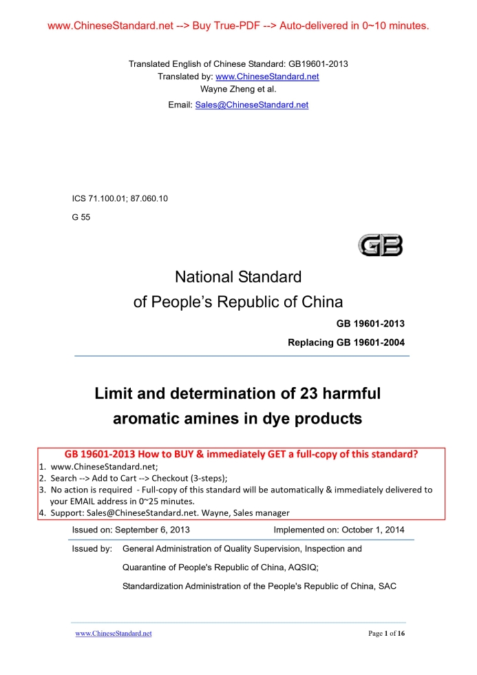 GB 19601-2013: Limit and determination of 23 harmful aromatic amines in dye products Delivery: 9 seconds. True-PDF full-copy in English & invoice will be downloaded + auto-delivered via email. See step-by-step procedure Status: Valid GB 19601: Historical versions