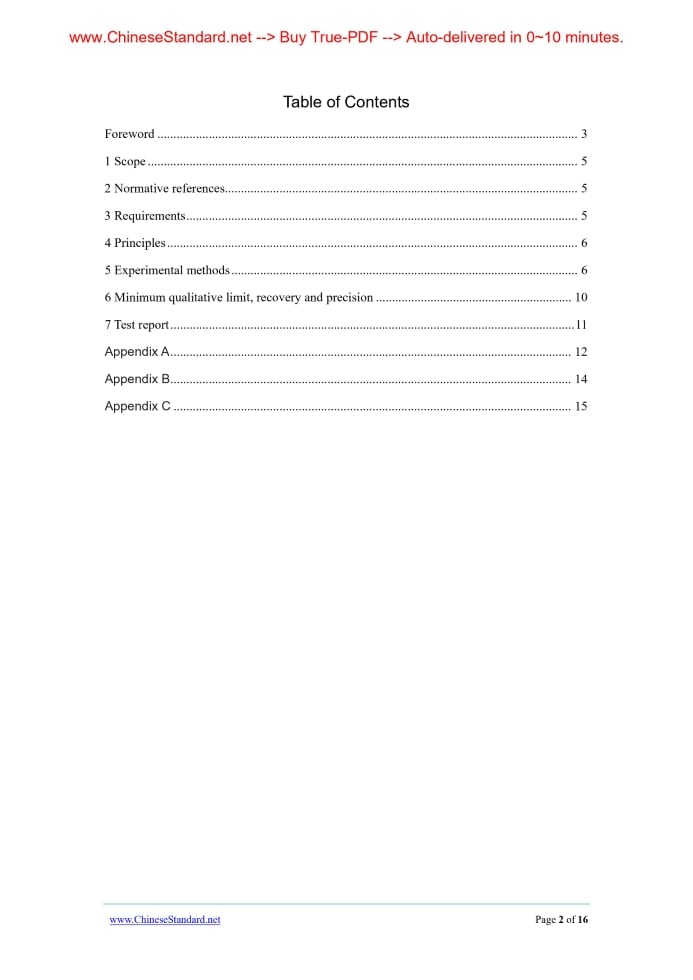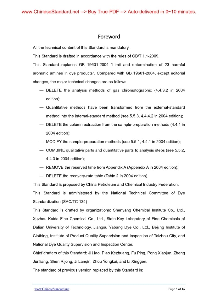 Similar standardsGB 19601-2013: Limit and determination of 23 harmful aromatic amines in dye products---This is an excerpt. Full copy of true-PDF in English version (including equations, symbols, images, flow-chart, tables, and figures etc.), auto-downloaded/delivered in 9 seconds, can be purchased online: https://www.ChineseStandard.net/PDF.aspx/GB19601-2013ICS 71.100.01; 87.060.10 G 55 National Standard of People’s Republic of China Replacing GB 19601-2004 Limit and determination of 23 harmful aromatic amines in dye products Issued on. SEPTEMBER 6, 2013 Implemented on. OCTOBER 1, 2014 Issued by. General Administration of Quality Supervision, Inspection and Quarantine of People's Republic of China, AQSIQ; Standardization Administration of the People's Republic of China, SAC Table of ContentsForeword... 3 1 Scope... 5 2 Normative references... 5 3 Requirements... 5 4 Principles... 6 5 Experimental methods... 6 6 Minimum qualitative limit, recovery and precision... 10 7 Test report... 11 Appendix A... 12 Appendix B... 14 Appendix C... 15ForewordAll the technical content of this Standard is mandatory. This Standard is drafted in accordance with the rules of GB/T 1.1-2009. This Standard replaces GB 19601-2004 "Limit and determination of 23 harmful aromatic amines in dye products". Compared with GB 19601-2004, except editorial changes, the major technical changes are as follows. — DELETE the analysis methods of gas chromatographic (4.4.3.2 in 2004 edition); — Quantitative methods have been transformed from the external-standard method into the internal-standard method (see 5.5.3, 4.4.4.2 in 2004 edition); — DELETE the column extraction from the sample-preparation methods (4.4.1 in 2004 edition); — MODIFY the sample-preparation methods (see 5.5.1, 4.4.1 in 2004 edition); — COMBINE qualitative parts and quantitative parts to analysis steps (see 5.5.2, 4.4.3 in 2004 edition); — REMOVE the reserved time from Appendix A (Appendix A in 2004 edition); — DELETE the recovery-rate table (Table 2 in 2004 edition). This Standard is proposed by China Petroleum and Chemical Industry Federation. This Standard is administered by the National Technical Committee of Dye Standardization (SAC/TC 134) This Standard is drafted by organizations. Shenyang Chemical Institute Co., Ltd., Xuzhou Kaida Fine Chemical Co., Ltd., State-Key Laboratory of Fine Chemicals of Dalian University of Technology, Jiangsu Yabang Dye Co., Ltd., Beijing Institute of Clothing, Institute of Product Quality Supervision and Inspection of Taizhou City, and National Dye Quality Supervision and Inspection Center. Chief drafters of this Standard. Ji Hao, Piao Kezhuang, Fu Ping, Peng Xiaojun, Zheng Junliang, Shen Rijong, Ji Lanqin, Zhou Yongkai, and Li Xinggen. The standard of previous version replaced by this Standard is. —GB 19601-2004. Limit and determination of 23 harmful aromatic amines in dye products Warning. Personnel using this Standard shall have practical working experience in qualified laboratory. This Standard does not point out all possible safety problems. Users are responsible for taking appropriate safety and healthy measures, and to ensure compliance with the relevant conditions of the national regulations.1 ScopeThis Standard specifies the allowable limit and determination methods of harmful aromatic amines in dye products (see Appendix A). This Standard is applicable to all kinds of commercial dyes, dye products, dye intermediates and textile-dye auxiliaries.2 Normative referencesThe following documents are indispensable for the application of this document. For dated references, only the dated edition is applicable for this document. For undated documents, the latest version (including all amendments) applies to this document. GB/T 6682-2008 Water for analytical laboratory use. Specification and test methods (ISO, 3696.1987, MOD) GB/T 8170-2008 Rules of rounding off for numerical values & expression and judgment of limiting values3 RequirementsThe content of harmful aromatic amines (see Appendix A) in dye products shall be less than 150mg (aromatic amines)/kg (product),4 PrinciplesIn dielectric of citrate buffer solution (pH=6.0), The dye sample uses sodium hyposulfite to achieve the reductive decomposition, and then uses the organic solvent to directly extract the aromatic amines from the lysis solution.5 Experimental methods5.1 General provisions Unless otherwise specified, it shall only use the reagents confirmed as analytical reagents and grade 3 water specified by GB/T 6682-2008.Judgment of the inspection results shall be conducted according to 4.3.3 rounding-value-comparison method in GB/T 8170–2008. 5.2 Reagents and materials 5.2.4 Glacial acetic acid. 5.2.5 Citrate buffer solution. 0.06 mol/L aqueous solution, pH = 6 (TAKE 12.526g citric acid and 6.320g sodium hydroxide, DISSOLVE them in water, and then DILUTE to 1000 mL). 5 2.6 Sodium hyposulfite. 200 g/L aqueous solution, when using, TAKE solid sodium hyposulfite (content of Na2S2O4 ≥ 85%) and DISSOLVE it in water for preparation. 5.3 Instruments and equipment. 5.3.1 Balance. precision is 0.00002g. 5.3.2 Gas chromatography - mass spectrometry (GC/MS). 5.3.3 Constant-temperature water bath. temperature ranges from room temperature to 100°C. 5.3.4 Rotating evaporator. 5.4 Preparation of standard solution 5.4.1 Preparation of single standard solution WEIGH each 0.01g (accurate to 0.00002g) of standard material and internal standard substance listed in Appendix A and Appendix B respectively, USE chloroform to dissolve them and DILUTE into 10 mL volumetric flask; 5.5 Analysis steps 5.5.1 Pre-treatment of samples WEIGH 0.2g of sample (accurate to 0.0002g), PLACE in a 100mL grinding-mouth conical flask, ADD 24mL of citrate buffer solution, ADD 1.0mL of internal standard solution, COVER the stopper. PUT the conical bottle into the water-bath pan in which the temperature is 70°C±2°C to preheat for about 15 min, KEEP shaking from time to time, LET 