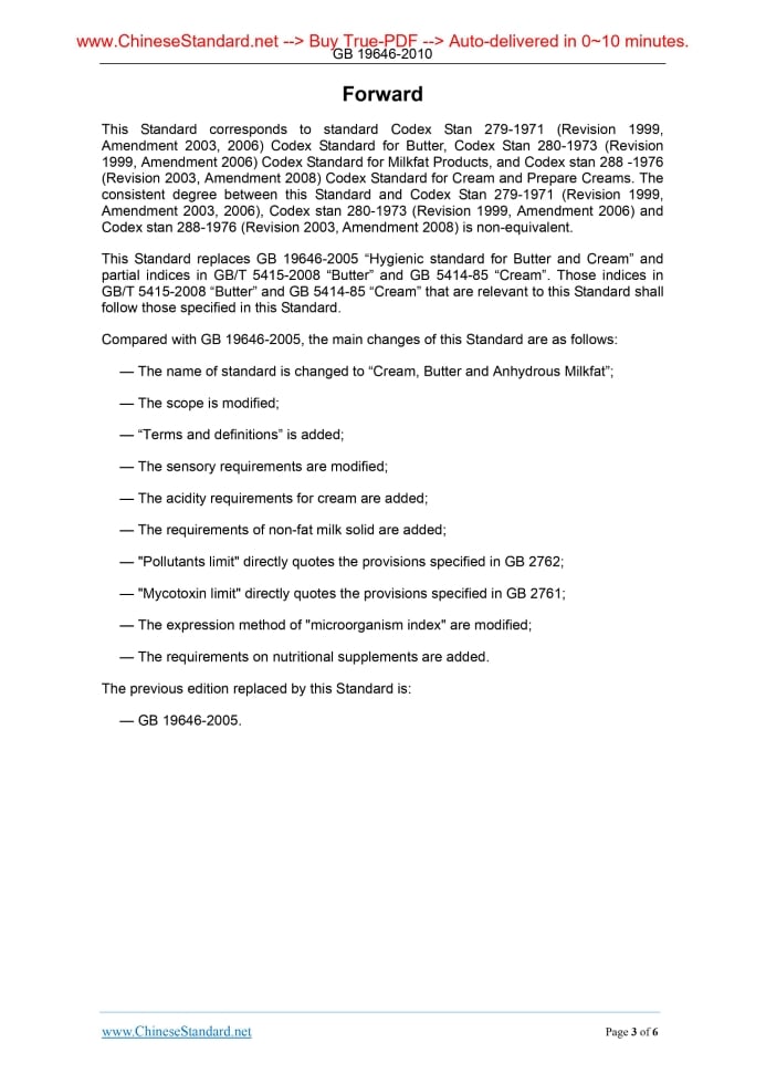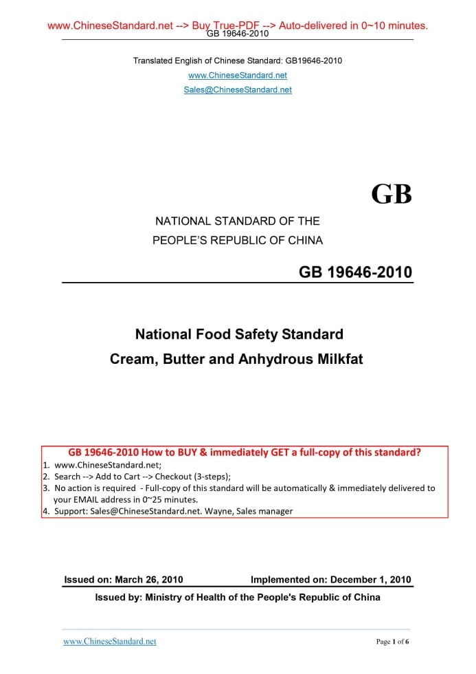 GB 19646-2010: National food safety standard -- Cream, butter and anhydrous milk fat Delivery: 9 seconds. True-PDF full-copy in English & invoice will be downloaded + auto-delivered via email. See step-by-step procedure Status: Valid GB 19646: Historical versions
