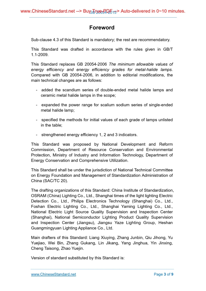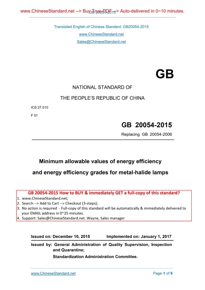 GB 20054-2015: Minimum allowable values of energy efficiency and energy efficiency grades for metal-halide lamps---This is an excerpt. Full copy of true-PDF in English version (including equations, symbols, images, flow-chart, tables, and figures etc.), auto-downloaded/delivered in 9 seconds, can be purchased online: https://www.ChineseStandard.net/PDF.aspx/GB20054-2015 GB NATIONAL STANDARD OF THE PEOPLE’S REPUBLIC OF CHINA ICS 27.010 F 01 Replacing GB 20054-2006 Minimum allowable values of energy efficiency and energy efficiency grades for metal-halide lamps Issued on: DECEMBER 10, 2015 Implemented on: JANUARY 1, 2017 Issued by. General Administration of Quality Supervision, Inspection and Quarantine; Standardization Administration Committee. Table of ContentsForeword ... 3 1 Scope ... 5 2 Normative references ... 5 3 Terms and definitions ... 5 4 Technical requirements ... 6 5 Test method ... 8 6 Inspection rules ... 9ForewordSub-clause 4.3 of this Standard is mandatory; the rest are recommendatory. This Standard was drafted in accordance with the rules given in GB/T 1.1-2009. This Standard replaces GB 20054-2006 The minimum allowable values of energy efficiency and energy efficiency grades for metal-halide lamps. Compared with GB 20054-2006, in addition to editorial modifications, the main technical changes are as follows. - added the scandium series of double-ended metal halide lamps and ceramic metal halide lamps in the scope; - expanded the power range for scalium sodium series of single-ended metal halide lamp; - specified the methods for initial values of each grade of lamps unlisted in the table; - strengthened energy efficiency 1, 2 and 3 indicators. This Standard was proposed by National Development and Reform Commission, Department of Resource Conservation and Environmental Protection, Ministry of Industry and Information Technology, Department of Energy Conservation and Comprehensive Utilization. This Standard shall be under the jurisdiction of National Technical Committee on Energy Foundation and Management of Standardization Administration of China (SAC/TC 20). The drafting organizations of this Standard. China Institute of Standardization, OSRAM (China) Lighting Co., Ltd., Shanghai times of the light lighting Electric Detection Co., Ltd., Philips Electronics Technology (Shanghai) Co., Ltd., Foshan Electric Lighting Co., Ltd., Shanghai Yaming Lighting Co., Ltd., National Electric Light Source Quality Supervision and Inspection Center (Shanghai), National Semiconductor Lighting Product Quality Supervision and Inspection Center (Jiangsu), Jiangsu Yaze Lighting Group, Heshan Guangmingyuan Lighting Appliance Co., Ltd. Main drafters of this Standard. Liang Xiuying, Zhang Junbin, Qiu Jihong, Yu Yuejiao, Wei Bin, Zhang Gukang, Lin Jikang, Yang Jinghua, Yin Jinxing, Cheng Taisong, Zhao Yuejin. Version of standard substituted by this Standard is. Minimum allowable values of energy efficiency and energy efficiency grades for metal-halide lamps1 ScopeThis Standard specifies the energy efficiency rating, energy efficiency limits, energy efficiency evaluation values, test methods and inspection rules for metal halide lamps. This Standard is applicable to transparent glass bulb scandium series metal halide lamp (single-ended 50W ~ 1500W, double-ended 70W ~ 250W), ceramic metal halide lamp (20W ~ 400W). This Standard is not applicable to powder blister or explosion-proof metal halide lamp.2 Normative referencesThe following referenced documents are indispensable for the application of this document. For dated references, only the edition cited applies. For undated references, the latest edition of the referenced document (including any amendments) applies. GB/T 2900.65, Electrotechnical terminology - Lighting GB/T 13434, Methods of measuring characteristics for discharge lamps (excluding fluorescent lamps) GB/T 18661, Metal-halide lamps (ScI3-NaI series) GB 19652, Discharge lamps (excluding fluorescent lamps) - Safety specifications GB/T 24458, Ceramic metal-halide lamps - Performance specifications3 Terms and definitionsFor the purposes of this document, the terms and definitions specified in GB/T 2900.65 and the following ones apply. 3.1 initial luminous efficacy for metal-halide lamps6 Inspection rules6.1 Acceptance inspection The manufacturer shall, in accordance with the requirements of the acceptance inspection, control the initial luminous efficiency of the metal halide lamps produced by its enterprise, so as to ensure that it meets the requirements of this Standard. During the acceptance inspection, the initial light efficiency sampling program, inspection level shall be carried out according to the provisions of GB/T 18661 or GB/T 24458. 6.2 Routine inspection The manufacturer shall carry out the routine inspection on the luminous flux maintenance rate of the metal halide lamps produced by its enterprise. The luminous maintenance rate sampling program, inspection level shall be carried out according to the provisions of GB/T 18661 or GB/T 24458. The routine inspection shall also be carried out in any of the following cases. a) for the product’s trial stereotypes identification; b) when production is resumed after the production has been discontinued for more than three months; c) when the design, process or material has significant changes that may affect product performance; d) when quality supervision agencies require to carry out the routine inspection. 6.3 Quality supervision The sampling shall be carried out according to relevant provisions. The criteria is as follows. Test the initial luminous efficiency of the three samples and calculate the average. If the average is not less than 3 or the product claims the energy efficiency rating limit, and no sample of the initial luminous efficiency below 90% of the limit, it shall be qualified. ......Source: Above contents are excerpted from the full-copy PDF -- translated/reviewed by: www.ChineseStandard.net / Wayne Zheng et a