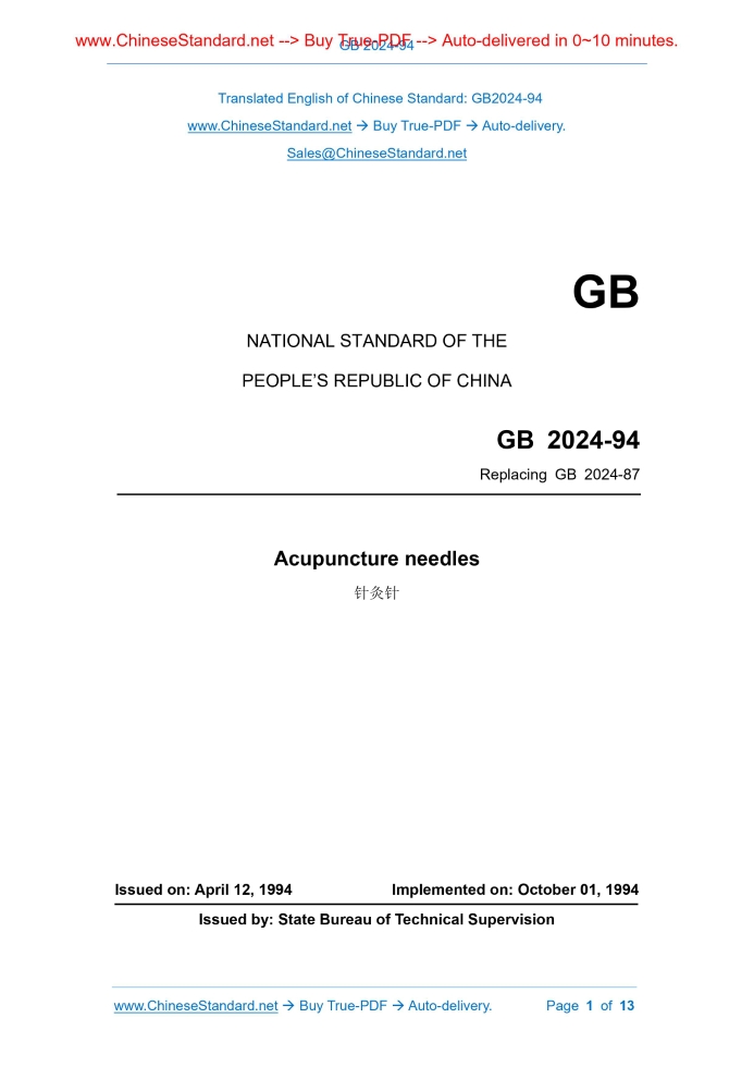GB 2024-1994: Acupuncture needles Delivery: 9 seconds. True-PDF full-copy in English & invoice will be downloaded + auto-delivered via email. See step-by-step procedure Status: Obsolete GB 2024: Historical versions