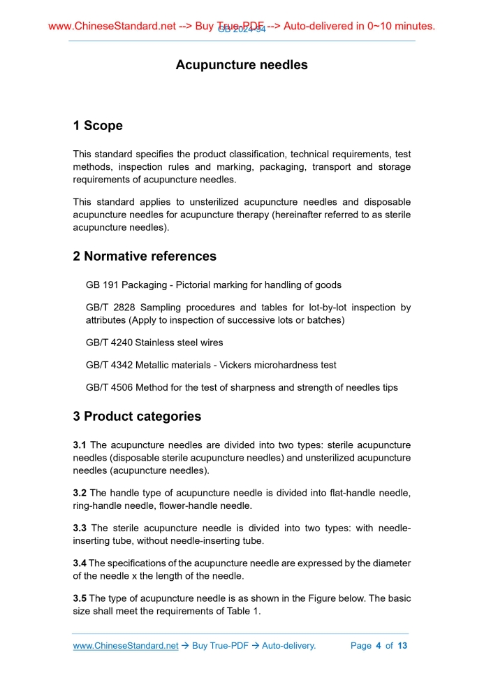 Similar standardsGB 2024-1994: Acupuncture needles---This is an excerpt. Full copy of true-PDF in English version (including equations, symbols, images, flow-chart, tables, and figures etc.), auto-downloaded/delivered in 9 seconds, can be purchased online: https://www.ChineseStandard.net/PDF.aspx/GB2024-1994GB NATIONAL STANDARD OF THE PEOPLE’S REPUBLIC OF CHINA Replacing GB 2024-87 Acupuncture needles 针灸针 Issued on: APRIL 12, 1994 Implemented on: OCTOBER 01, 1994 Issued by. State Bureau of Technical Supervision Table of ContentsForeword... 3 1 Scope... 4 2 Normative references... 4 3 Product categories... 4 4 Technical requirements... 7 5 Test methods... 9 6 Inspection rules... 11 7 Marking, packaging, transport, storage... 11 8 Others... 13 Acupuncture needles1 ScopeThis standard specifies the product classification, technical requirements, test methods, inspection rules and marking, packaging, transport and storage requirements of acupuncture needles. This standard applies to unsterilized acupuncture needles and disposable acupuncture needles for acupuncture therapy (hereinafter referred to as sterile acupuncture needles).2 Normative referencesGB 191 Packaging - Pictorial marking for handling of goods GB/T 2828 Sampling procedures and tables for lot-by-lot inspection by attributes (Apply to inspection of successive lots or batches) GB/T 4240 Stainless steel wires GB/T 4342 Metallic materials - Vickers microhardness test GB/T 4506 Method for the test of sharpness and strength of needles tips3 Product categories3.1 The acupuncture needles are divided into two types. sterile acupuncture needles (disposable sterile acupuncture needles) and unsterilized acupuncture needles (acupuncture needles). 3.2 The handle type of acupuncture needle is divided into flat-handle needle, ring-handle needle, flower-handle needle. 3.3 The sterile acupuncture needle is divided into two types. with needle- inserting tube, without needle-inserting tube. 3.4 The specifications of the acupuncture needle are expressed by the diameter of the needle x the length of the needle. 3.5 The type of acupuncture needle is as shown in the Figure below. The basic size shall meet the requirements of Table 1. the provisions of clause 4.4. 5.4.2 Sharpness test of needle’s tip It is performed according to the requirements of GB/T 4506.It shall comply with the provisions of clause 4.5. 5.4.3 Toughness test of needle’s body Wind the needle’s body in a tight spiral around the mandrel having a diameter of 3 times the diameter of the needle’s body along the spiral direction. If the length of the needle’s body is 13 mm, wind the needle for two circles; for the needle’s body of other lengths, wind it for five circles. The results shall comply with the provisions of clause 4.6. 5.4.4 Test of the connection firmness between the needle’s body and the needle’s handle First measure the length of the needle’s body, then fix the needle’s body in the clamp. On the end face of the needle’s handle, use the force as specified in clause 4.8 to perform shockless pulling test along the axial direction of the needle’s body, then measure the length of the needle’s body. The results shall meet the requirements of clause 4.8. 5.4.5 Test of needle handle’s burr Use hands to touch the handle of the acupuncture needle, it shall not have the sense of burrs. 5.4.6 Test of corrosion resistance of needle’s body Remove the oil from the needle’s body. Immerse it in 10% citric acid solution for 5 h at room temperature. Take it out. Place it in steaming water to boil it for 30 min. Cool it at room temperature for 48 h. Then remove it and let it evaporate naturally in the air; or use hot air to dry it. Visually observe the surface of the needle’s body. It shall be free from rusting. 5.4.7 Sterility test From each batch of sterile products, randomly take 40 samples. Randomly divide them into two groups, each group contains 20 samples. Perform parallel test. The sterility test shall be carried out in accordance with the sterility test method in the Appendix of the 1990 version of the Pharmacopoeia of the People's Republic of China. The results shall comply with the provisions of clause 4.14. c. Type, specifications. 7.3 Acupuncture needles of the same specification shall be packed in a medium-sized carton. The inspection certificate shall be placed in the carton. The carton shall have the following markings. a. Manufacturer’s name and trademark; b. Product name; c. Type, specification, quantity; d. This standard number. 7.3.1 The medium-sized packaging box for the sterile acupuncture needles shall also have the following markings. a. It is prohibited to use if the small package is damaged; b. Date of sterilization; c. Effective period of sterilization. 7.3.2 The inspection certificate shall have the following markings. a. Manufacturer’s name; b. Inspector’s code; c. Date of inspection. 7.3.3 There shall be a seal on the box, there shall be a packer’s code on the seal. 7.4 Acupuncture needles of the same specifications are packed into large-sized corrugated boxes. 7.4.1 The carton shall have the following markings. a. Manufacturer’s name and address; b. Product name; c. Model, specification, quantity; d. Date of manufacture and exit-factory batch number; e. Gross weight; f. Volume (length x width x height); g. This standard number; h. Words or signs such as “Handle with care”, “Avoid heat”, which shall comply with the provisions of GB 191. The words or signs on the carton shall be guaranteed not to be obscured after long-time. 7.4.2 The large-sized packing carton for sterile acupuncture needles shall also has the following markings. a. Date of sterilization (instead of date of manufacture); b. Method of sterilization; c. Effective period of sterilization. 7.4.3 The carton shall be affixed with a seal, on which there shall be the packer’s code. 7.5 Packaging quantity and the packaging with special needs are a
