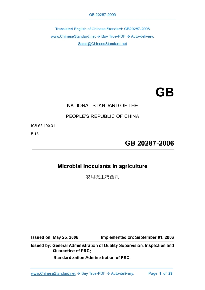 GB 20287-2006: Microbial inoculants in agriculture Delivery: 9 seconds. True-PDF full-copy in English & invoice will be downloaded + auto-delivered via email. See step-by-step procedure Status: Valid