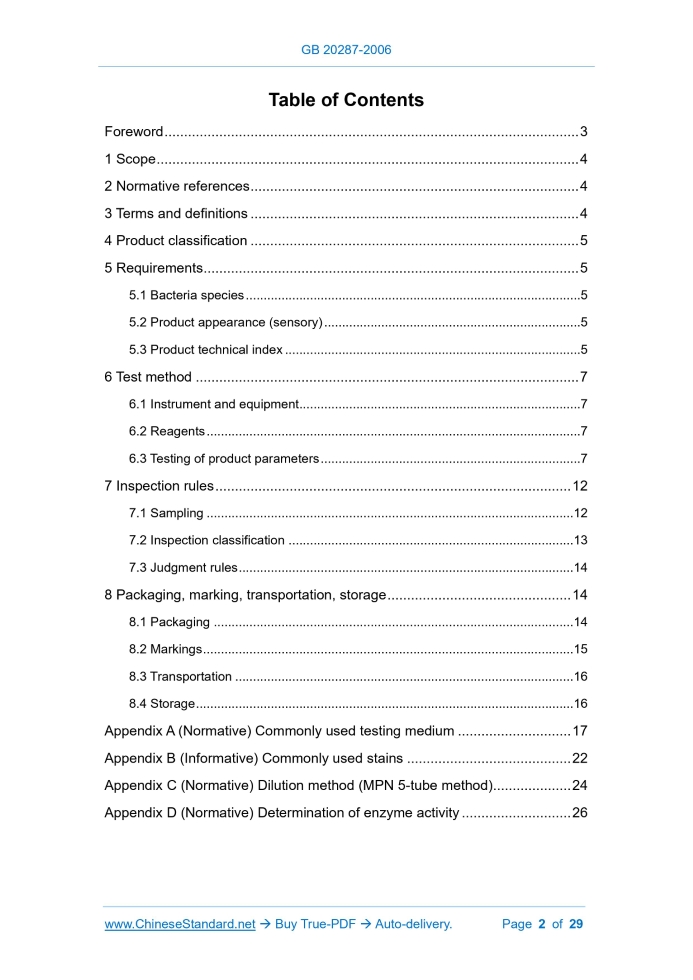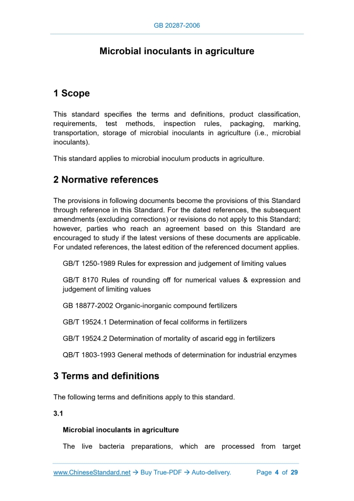 Similar standardsGB 20287-2006: Microbial inoculants in agriculture---This is an excerpt. Full copy of true-PDF in English version (including equations, symbols, images, flow-chart, tables, and figures etc.), auto-downloaded/delivered in 9 seconds, can be purchased online: https://www.ChineseStandard.net/PDF.aspx/GB20287-2006GB NATIONAL STANDARD OF THE PEOPLE’S REPUBLIC OF CHINA ICS 65.100.01 B 13 Microbial inoculants in agriculture Issued on. MAY 25, 2006 Implemented on. SEPTEMBER 01, 2006 Issued by. General Administration of Quality Supervision, Inspection and Quarantine of PRC; Standardization Administration of PRC. Table of ContentsForeword... 3 1 Scope... 4 2 Normative references... 4 3 Terms and definitions... 4 4 Product classification... 5 5 Requirements... 5 5.1 Bacteria species... 5 5.2 Product appearance (sensory)... 5 5.3 Product technical index... 5 6 Test method... 7 6.1 Instrument and equipment... 7 6.2 Reagents... 7 6.3 Testing of product parameters... 7 7 Inspection rules... 12 7.1 Sampling... 12 7.2 Inspection classification... 13 7.3 Judgment rules... 14 8 Packaging, marking, transportation, storage... 14 8.1 Packaging... 14 8.2 Markings... 15 8.3 Transportation... 16 8.4 Storage... 16 Appendix A (Normative) Commonly used testing medium... 17 Appendix B (Informative) Commonly used stains... 22 Appendix C (Normative) Dilution method (MPN 5-tube method)... 24 Appendix D (Normative) Determination of enzyme activity... 26ForewordClauses 5.1, 5.3, Chapter 8 of this standard are mandatory clauses. The rest are recommended clauses. Appendix A, Appendix C, Appendix D of this standard are normative appendixes. Appendix B is an informative appendix. This standard was proposed by AND shall be under the jurisdiction of the Ministry of Agriculture of the People's Republic of China. Drafting organizations of this standard. Microbial Fertilizer Quality Supervision, Inspection and Testing Center of Ministry of Agriculture, Soil and Fertilizer Research Institute of Chinese Academy of Agricultural Sciences. The main drafters of this standard. Shen Delong, Li Jun, Jiang Xin, Zhang Yujie, Li Li, Feng Ruihua, Cao Fengming, Yang Xiaohong, Guan Dawei. Microbial inoculants in agriculture1 ScopeThis standard specifies the terms and definitions, product classification, requirements, test methods, inspection rules, packaging, marking, transportation, storage of microbial inoculants in agriculture (i.e., microbial inoculants). This standard applies to microbial inoculum products in agriculture.2 Normative referencesThe provisions in following documents become the provisions of this Standard through reference in this Standard. For the dated references, the subsequent amendments (excluding corrections) or revisions do not apply to this Standard; however, parties who reach an agreement based on this Standard are encouraged to study if the latest versions of these documents are applicable. For undated references, the latest edition of the referenced document applies. GB/T 1250-1989 Rules for expression and judgement of limiting values GB/T 8170 Rules of rounding off for numerical values & expression and judgement of limiting values GB 18877-2002 Organic-inorganic compound fertilizers GB/T 19524.1 Determination of fecal coliforms in fertilizers GB/T 19524.2 Determination of mortality of ascarid egg in fertilizers QB/T 1803-1993 General methods of determination for industrial enzymes3 Terms and definitionsThe following terms and definitions apply to this standard. 3.1 Microbial inoculants in agriculture The live bacteria preparations, which are processed from target microorganisms (effective bacteria), through industrialized production and propagation.4 Product classificationAccording to the types or functional characteristics of the contained microorganisms, it can be divided into rhizobia inoculants, nitrogen-fixing bacteria inoculants, phosphate-dissolving microbial inoculants, silicate microbial inoculants, photosynthetic bacteria inoculants, decomposing agent for organic materials, growth-promoting bacteria, mycorrhizal inoculants, bioremediation inoculants, etc.5 Requirements5.1 Bacteria species The microbial strains, which are used in production, shall be safe and effective. The producer shall provide the classification and identification report of the bacterial species, including complete information such as the scientific name of the genera and species, morphology, 5.2 Product appearance (sensory) Powder products shall be loose. Granular products shall have no obvious mechanical impurities, be uniform in size, have water absorption. 5.3 Product technical index 5.3.1 The technical index of agricultural microbial inoculants products is as shown in Table 1, wherein the technical index of organic material decomposing agents are implemented in accordance with Table 2. 5.3.2 See Table 3 for harmlessness index of the microbial inoculants in agriculture.6 Test method6.1 Instrument and equipment 6.1.1 Biological microscope. 6.1.2 Constant temperature incubator. 6.1.3 Constant temperature drying oven. 6.1.4 Ultra-clean workbench or clean room. 6.1.5 Electronic balance (or precision balance). 6.1.6 Shaker. 6.1.7 Steam sterilization pot. 6.1.8 Test sieve. 6.1.9 Acidity meter. 6.2 Reagents 6.3 Testing of product parameters 6.3.1 Determination of appearance (sensory) Take a small amount of samples. Place them in a white enamel tray (or white plastic palette). Carefully observe the color, shape, texture of the sample. 6.3.2 Determination of effective viable bacteria count Use the plate counting method. Select an appropriate medium, according to the type of microorganisms tested. If the dilution method [Most Probable Number (MPN) 5 pipe method] is used, it is performed in accordance with the provisions of Appendix C. 6.3.2.4 Colony count Take the dilution plate, which appears 20 ~ 300 colonies, as the counting criteria (10 ~ 150 colonies for filamentous fungi). Respectively count the number of effective via