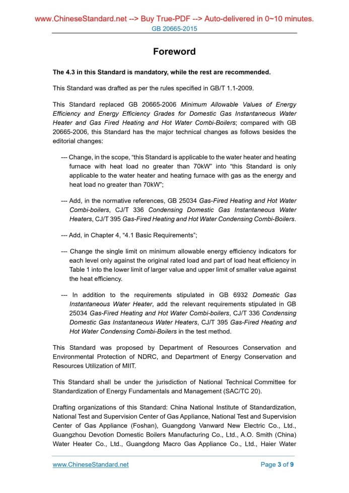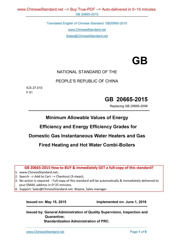 GB 20665-2015: Minimum allowable values of energy efficiency and energy efficiency grades for domestic gas instantaneous water heaters and gas fired heating and hot water combi-boilers---This is an excerpt. Full copy of true-PDF in English version (including equations, symbols, images, flow-chart, tables, and figures etc.), auto-downloaded/delivered in 9 seconds, can be purchased online: https://www.ChineseStandard.net/PDF.aspx/GB20665-2015 GB NATIONAL STANDARD OF THE PEOPLE’S REPUBLIC OF CHINA ICS 27.010 F 01 Replacing GB 20665-2006 Minimum Allowable Values of Energy Efficiency and Energy Efficiency Grades for Domestic Gas Instantaneous Water Heaters and Gas Fired Heating and Hot Water Combi-Boilers Issued on. MAY 15, 2015 Implemented on. JUNE 1, 2016 Issued by. General Administration of Quality Supervision, Inspection and Quarantine; Standardization Administration of PRC. Table of ContentsForeword... 3 1 Scope... 5 2 Normative References... 5 3 Terms and Definitions... 6 4 Technical Requirements... 6 5 Test Methods... 7 6 Inspection Rules... 9ForewordThe 4.3 in this Standard is mandatory, while the rest are recommended. This Standard was drafted as per the rules specified in GB/T 1.1-2009. This Standard replaced GB 20665-2006 Minimum Allowable Values of Energy Efficiency and Energy Efficiency Grades for Domestic Gas Instantaneous Water Heater and Gas Fired Heating and Hot Water Combi-Boilers; compared with GB 20665-2006, this Standard has the major technical changes as follows besides the editorial changes. --- Change, in the scope, “this Standard is applicable to the water heater and heating furnace with heat load no greater than 70kW” into “this Standard is only applicable to the water heater and heating furnace with gas as the energy and heat load no greater than 70kW”; --- Add, in the normative references, GB 25034 Gas-Fired Heating and Hot Water Combi-boilers, CJ/T 336 Condensing Domestic Gas Instantaneous Water Heaters, CJ/T 395 Gas-Fired Heating and Hot Water Condensing Combi-Boilers. --- Add, in Chapter 4, “4.1 Basic Requirements”; --- Change the single limit on minimum allowable energy efficiency indicators for each level only against the original rated load and part of load heat efficiency in Table 1 into the lower limit of larger value and upper limit of smaller value against the heat efficiency. --- In addition to the requirements stipulated in GB 6932 Domestic Gas Instantaneous Water Heater, add the relevant requirements stipulated in GB 25034 Gas-Fired Heating and Hot Water Combi-boilers, CJ/T 336 Condensing Domestic Gas Instantaneous Water Heaters, CJ/T 395 Gas-Fired Heating and Hot Water Condensing Combi-Boilers in the test method. This Standard was proposed by Department of Resources Conservation and Environmental Protection of NDRC, and Department of Energy Conservation and Resources Utilization of MIIT. This Standard shall be under the jurisdiction of National Technical Committee for Standardization of Energy Fundamentals and Management (SAC/TC 20). Drafting organizations of this Standard. China National Institute of Standardization, National Test and Supervision Center of Gas Appliance, National Test and Supervision Center of Gas Appliance (Foshan), Guangdong Vanward New Electric Co., Ltd., Guangzhou Devotion Domestic Boilers Manufacturing Co., Ltd., A.O. Smith (China) Water Heater Co., Ltd., Guangdong Macro Gas Appliance Co., Ltd., Haier Water Heater Co., Ltd., Guangdong Midea Kitchen Appliances Manufacturing Co., Ltd., Vaillant (Beijing) Heating Equipment Co., Ltd., Shanghai Linnei Co., Ltd., International Copper Association (China), Vatti Corporation Limited, Ningbo Fotile Kitchen Ware Co., Ltd., and Noritz (China) Co., Ltd.. Chief drafting staffs of this Standard. Liu Wei, Chen Haigong, Liu Tong, Lin Li, Zhong Jiasong, Bi Dayan, Hu Dinggang, Zhen Tao, Liu Guorong, Gai Xinfeng, Xu Weichun, Shen Jun, Yi Hongbin, Xu Deming, and Zhang Kundong. The historical edition replaced by this Standard is as follows. --- GB 20665-2006. Minimum Allowable Values of Energy Efficiency and Energy Efficiency Grades for Domestic Gas Instantaneous Water Heaters and Gas Fired Heating and Hot Water Combi-Boilers1 ScopeThis Standard specifies the minimum allowable values of energy efficiency, energy- conservation evaluating value, energy efficiency grades, test methods and inspection rules for domestic gas instantaneous water heater (including condensing domestic gas instantaneous water heater, hereinafter referred to as water heater), and gas fired heating and hot water combi-boilers. This Standard is applicable to the water heater and heating furnace with gas as the only energy and heat load no greater than 70kW. This Standard is not applicable to the gas storage water heater. The gas indicated in this Standard shall conform to the provisions of GB/T 13611.2 Normative ReferencesThe following documents are essential to the application of this document. For the dated documents, only the versions with the dates indicated are applicable to this document; for the undated documents, only the latest version (including all the amendments) are applicable to this document. GB 6932-2001 Domestic Gas Instantaneous Water Heater GB/T 13611 Classification and Essential Property of City Gas GB 25034-2010 Gas-Fired Heating and Hot Water Combi-Boilers3 Terms and DefinitionsThe following terms and definitions and the ones stipulated in GB 6932, GB 25034, CJ/T 336, CJ/T 395 are applicable to this document. 3.1 Minimum allowable values of energy efficiency for domestic gas instantaneous water heater and gas fired heating and hot water combi-boilers According to the prescribed test conditions, the minimum thermal efficiency value reached by domestic gas instantaneous water heater and gas fired heating and hot water combi-boilers.4 Technical Requirements4.1 Basic requirements The water heater and heating furnace applicable to this Standard shall conform to the provisions of GB 6932-2001, GB 250