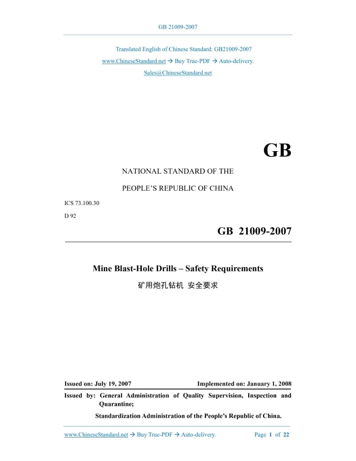 GB 21009-2007: Mine blast-hole drills - Safety requirements Delivery: 9 seconds. True-PDF full-copy in English & invoice will be downloaded + auto-delivered via email. See step-by-step procedure Status: Valid