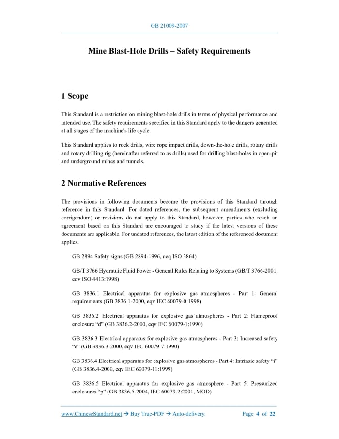 Similar standardsGB 21009-2007: Mine blast-hole drills - Safety requirements---This is an excerpt. Full copy of true-PDF in English version (including equations, symbols, images, flow-chart, tables, and figures etc.), auto-downloaded/delivered in 9 seconds, can be purchased online: https://www.ChineseStandard.net/PDF.aspx/GB21009-2007GB NATIONAL STANDARD OF THE PEOPLE’S REPUBLIC OF CHINA ICS 73.100.30 D 92 Mine Blast-Hole Drills – Safety Requirements ISSUED ON: JULY 19, 2007 IMPLEMENTED ON: JANUARY 1, 2008 Issued by: General Administration of Quality Supervision, Inspection and Quarantine; Standardization Administration of the People’s Republic of China. Table of ContentsForeword ... 3 1 Scope ... 4 2 Normative References ... 4 3 Terms and Definitions ... 6 4 List of Dangers ... 7 5 Safety Requirements and/or Measures and Judgments ... 8 6 Usage Information ... 18 Mine Blast-Hole Drills – Safety Requirements1 ScopeThis Standard is a restriction on mining blast-hole drills in terms of physical performance and intended use. The safety requirements specified in this Standard apply to the dangers generated at all stages of the machine's life cycle. This Standard applies to rock drills, wire rope impact drills, down-the-hole drills, rotary drills and rotary drilling rig (hereinafter referred to as drills) used for drilling blast-holes in open-pit and underground mines and tunnels.2 Normative ReferencesThe provisions in following documents become the provisions of this Standard through reference in this Standard. For dated references, the subsequent amendments (excluding corrigendum) or revisions do not apply to this Standard, however, parties who reach an agreement based on this Standard are encouraged to study if the latest versions of these documents are applicable. For undated references, the latest edition of the referenced document applies. GB 2894 Safety signs (GB 2894-1996, neq ISO 3864) GB/T 3766 Hydraulic Fluid Power - General Rules Relating to Systems (GB/T 3766-2001, eqv ISO 4413:1998) GB 3836.1 Electrical apparatus for explosive gas atmospheres - Part 1: General requirements (GB 3836.1-2000, eqv IEC 60079-0:1998) GB 3836.2 Electrical apparatus for explosive gas atmospheres - Part 2: Flameproof enclosure “d” (GB 3836.2-2000, eqv IEC 60079-1:1990) GB 3836.3 Electrical apparatus for explosive gas atmospheres - Part 3: Increased safety “e” (GB 3836.3-2000, eqv IEC 60079-7:1990) GB 3836.4 Electrical apparatus for explosive gas atmospheres - Part 4: Intrinsic safety “i” (GB 3836.4-2000, eqv IEC 60079-11:1999) GB 3836.5 Electrical apparatus for explosive gas atmosphere - Part 5: Pressurized enclosures “p” (GB 3836.5-2004, IEC 60079-2:2001, MOD) reconnection will endanger people around, they shall be able to lock. After the drill cuts off the energy, it shall be able to safely release the energy left or stored in the circuit so that people around it are not in danger. Some circuits can remain connected to the energy in order to clamp workpieces, save information, and internal lighting. In this case, special measures shall be taken to protect the safety of the operator. 5.2 Safety requirements for operating positions 5.2.1 The operation of the drill shall be carried out in a state where the surrounding environment is not dangerous to personnel. The position and standing space required by the operator shall meet the requirements of GB/T 8420 and JB/T 3683. 5.2.2 For drill used for underground or tunnel operations, protective measures shall be taken as needed to prevent the danger caused by splashing objects. 5.2.3 The driving and operating positions of the drill shall have good visibility to ensure that there is no danger to personnel. 5.2.4 The drill can be equipped with an operator's cab as needed. The operator's cab shall meet the following requirements: a) The operator's cab shall be equipped with air conditioning or safe heating and cooling devices according to the working conditions to ensure that the temperature in the operator's cab is within the range of 15℃~31℃; b) An air purification device shall be equipped; and the dust concentration in the air in the operator's cab shall meet the requirements of 5.13.1 in this Standard; c) When the drill is operating with the doors and windows closed and the air conditioning and purification devices turned on, the noise in the operator's cab shall not exceed 85dB (A), and the noise shall be tested in accordance with the provisions of GB/T 13325; d) Necessary vibration reduction measures shall be taken, and the weighted root mean square acceleration correction value at the seat cushion shall not exceed 1.25m/s2. The vibration test shall be carried out in accordance with the method of GB/T 8419; e) The direction of the door opening shall enable the operator to quickly leave the operator's cab in case of danger; f) The decorative materials in the operator's cab shall meet the fire protection requirements of 5.12.1 in this Standard; g) The illumination in the operator's cab shall meet the requirements of 5.11.3 in this Standard; h) The glass between the operator's cab and the machine room shall be vibration-resistant and shall not injure the operator after breaking. 5.3 Control system 5.3.1 The safety part of the drill control system shall meet the requirements of GB/T 16855.1. 5.3.2 The main transmission system of the drill shall be manually started through the starting device. If the drill has multiple devices for starting, these devices shall be linked to each other so that one of them can be used to complete the start. For pneumatically driven drill, a shut-off valve shall be set on the main circuit to connect or disconnect the power unit and the main machine, and to release the system pressure. 5.3.3 The drill shall have a normal shutdown command device to enable it to stop safely during operation. The drill shall be equipped with a total stop switch; and each operating position for operation and driving shall have
