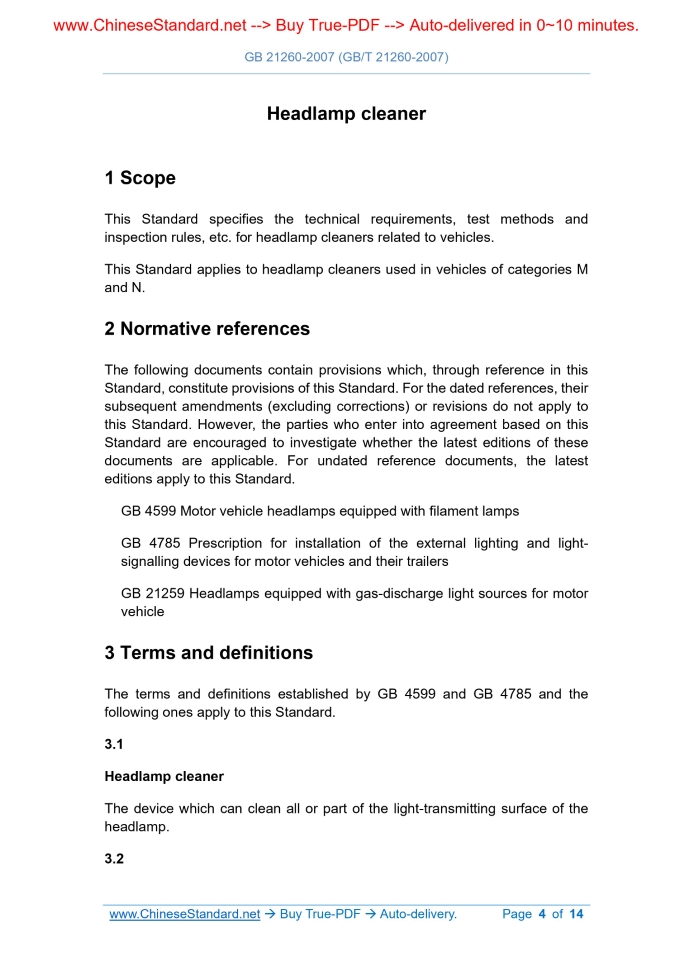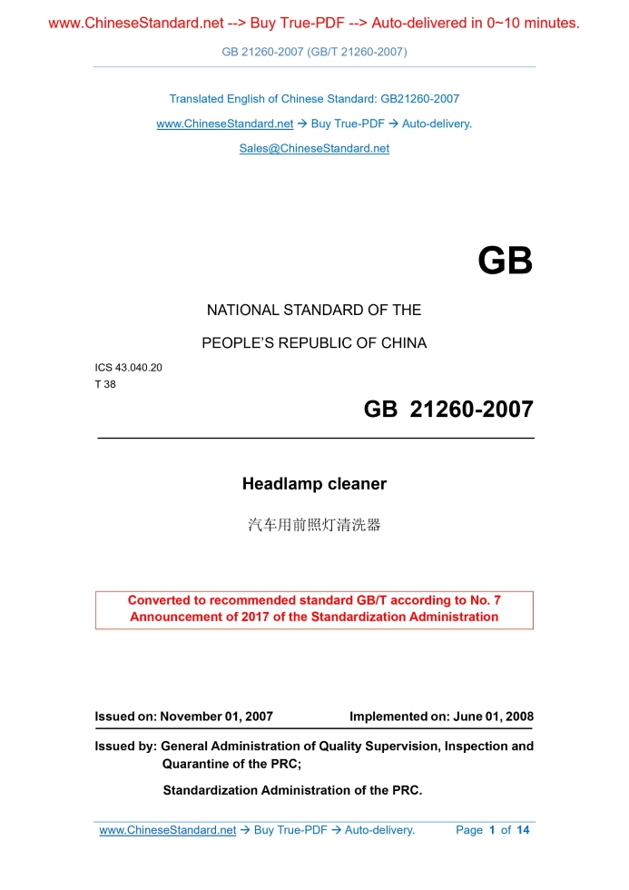 GB 21260-2007: [GB/T 21260-2007] Headlamp cleaner Delivery: 9 seconds. True-PDF full-copy in English & invoice will be downloaded + auto-delivered via email. See step-by-step procedure Status: Valid
