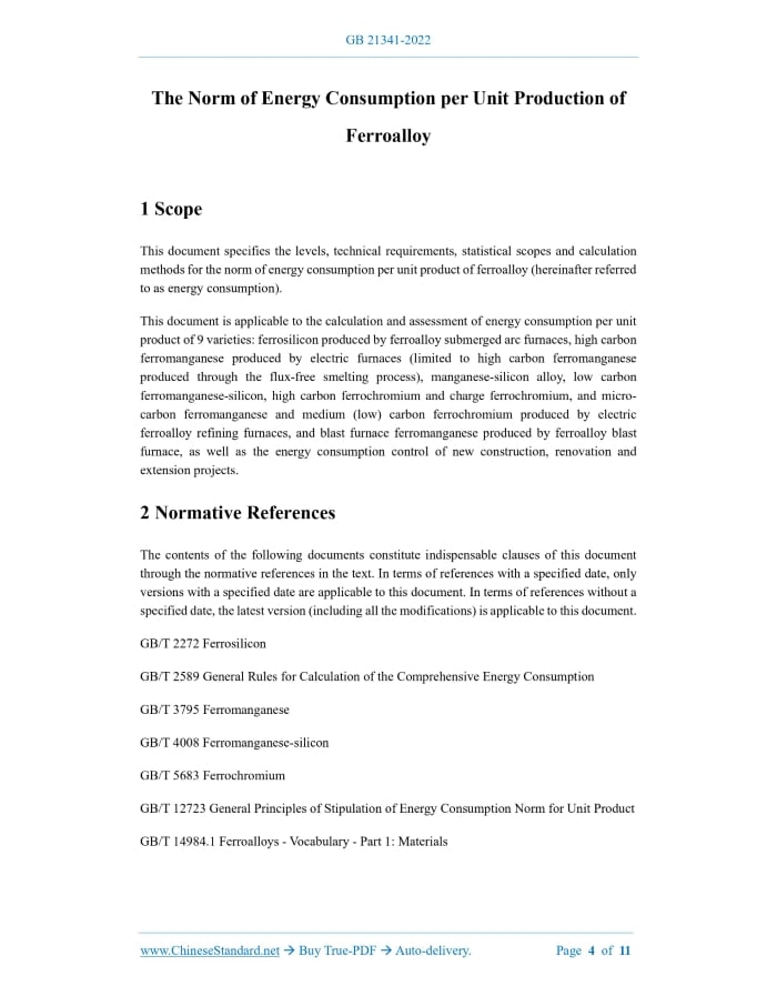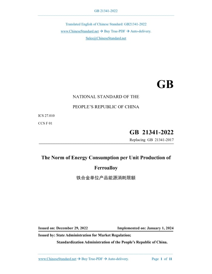 GB 21341-2022: The norm of energy consumption per unit production of ferroalloy---This is an excerpt. Full copy of true-PDF in English version (including equations, symbols, images, flow-chart, tables, and figures etc.), auto-downloaded/delivered in 9 seconds, can be purchased online: https://www.ChineseStandard.net/PDF.aspx/GB21341-2022GB NATIONAL STANDARD OF THE PEOPLE’S REPUBLIC OF CHINA ICS 27.010 CCS F 01 Replacing GB 21341-2017 The Norm of Energy Consumption per Unit Production of Ferroalloy ISSUED ON: DECEMBER 29, 2022 IMPLEMENTED ON: JANUARY 1, 2024 Issued by: State Administration for Market Regulation; Standardization Administration of the People’s Republic of China. Table of ContentsForeword ... 3 1 Scope ... 4 2 Normative References ... 4 3 Terms and Definitions ... 5 4 Levels of the Norm of Energy Consumption ... 5 5 Technical Requirements ... 7 6 Statistical Scopes and Calculation Methods ... 7 Appendix A (informative) Standard Coal Conversion Reference Coefficients of Various Energy Sources ... 10 Appendix B (normative) Table of Benchmark Composition of Ferroalloy Products .. 11 The Norm of Energy Consumption per Unit Production of Ferroalloy1 ScopeThis document specifies the levels, technical requirements, statistical scopes and calculation methods for the norm of energy consumption per unit product of ferroalloy (hereinafter referred to as energy consumption). This document is applicable to the calculation and assessment of energy consumption per unit product of 9 varieties: ferrosilicon produced by ferroalloy submerged arc furnaces, high carbon ferromanganese produced by electric furnaces (limited to high carbon ferromanganese produced through the flux-free smelting process), manganese-silicon alloy, low carbon ferromanganese-silicon, high carbon ferrochromium and charge ferrochromium, and micro- carbon ferromanganese and medium (low) carbon ferrochromium produced by electric ferroalloy refining furnaces, and blast furnace ferromanganese produced by ferroalloy blast furnace, as well as the energy consumption control of new construction, renovation and extension projects.2 Normative ReferencesThe contents of the following documents constitute indispensable clauses of this document through the normative references in the text. In terms of references with a specified date, only versions with a specified date are applicable to this document. In terms of references without a specified date, the latest version (including all the modifications) is applicable to this document. GB/T 2272 Ferrosilicon GB/T 2589 General Rules for Calculation of the Comprehensive Energy Consumption GB/T 3795 Ferromanganese GB/T 4008 Ferromanganese-silicon GB/T 5683 Ferrochromium GB/T 12723 General Principles of Stipulation of Energy Consumption Norm for Unit Product GB/T 14984.1 Ferroalloys - Vocabulary - Part 1: Materials3 Terms and DefinitionsThe terms and definitions defined in GB/T 12723, and the following terms and definitions are applicable to this document. 3.1 comprehensive energy consumption per unit product of ferroalloy Comprehensive energy consumption per unit product of ferroalloy refers to the amount of various energy sources consumed by ferroalloy enterprises to produce 1 benchmark ton (converted in accordance with the benchmark composition of the main elements) of qualified ferroalloy products during the reporting period. 3.2 smelting electricity consumption per unit product of ferroalloy Smelting electricity consumption per unit product of ferroalloy refers to the electricity consumption in the smelting process by ferroalloy enterprises to produce 1 benchmark ton (converted in accordance with the benchmark composition of the main elements) of qualified ferroalloy products during the reporting period. 3.3 coke consumption per unit product of ferroalloy Coke consumption per unit product of ferroalloy refers to the amount of coke (dry tons) consumed by ferroalloy blast furnace production enterprises to produce 1 benchmark ton (converted in accordance with the benchmark composition of the main elements) of qualified ferroalloy products during the reporting period. 3.4 low carbon ferromanganese-silicon Low carbon ferromanganese-silicon refers to ferromanganese-silicon whose carbon content is not greater than 0.3%. 3.5 charge ferrochromium Charge ferrochromium refers to ferrochromium whose chromium content is 45% ~ 52% and carbon content is below 10%.4 Levels of the Norm of Energy ConsumptionThe indicators of the norm of energy consumption per unit product of ferroalloy production enterprises include smelting electricity consumption per unit product of ferroalloy, coke consumption per unit product of ferroalloy and comprehensive energy consumption per unit product of ferroalloy. The levels of the norm of energy consumption are shown in Table 1 and Table 2, in which, Level-1 represents the lowest energy consumption.5 Technical Requirements5.1 Limit Values of Energy Consumption per Unit Product of Existing Ferroalloy Production Enterprises The indicators of the limit values of energy consumption per unit product of existing ferroalloy production enterprises include smelting electricity consumption per unit product, coke consumption per unit product and comprehensive energy consumption per unit product. The limit values shall be not greater than the Level-3 energy consumption indicators in Table 1 and Table 2. 5.2 Access Values of Energy Consumption per Unit Product of Newly Constructed, Reconstructed and Extended Ferroalloy Production Enterprises The indicators of the access values of energy consumption per unit product of newly constructed, reconstructed and extended ferroalloy production enterprises include smelting electricity consumption per unit product, coke consumption per unit product and comprehensive energy consumption per unit product. The limit values shall be not greater than the Level-2 energy consumption indicators in Table 1 and Table 2.6 Statistical Scopes and Calculati
