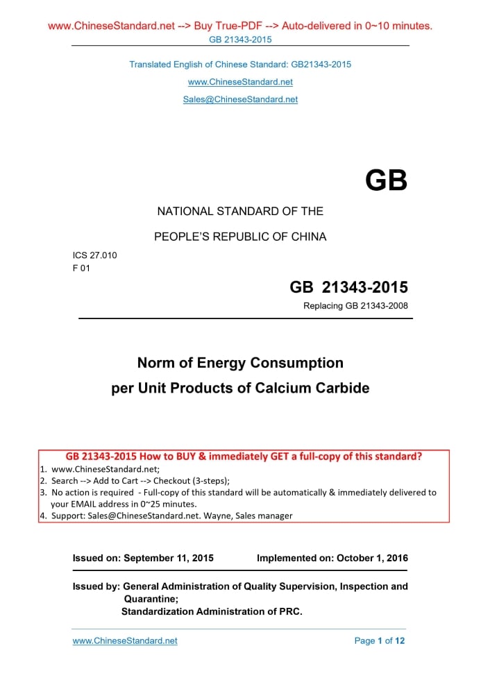 GB 21343-2015: Norm of Energy Consumption per Unit Products of Calcium Carbide Delivery: 9 seconds. True-PDF full-copy in English & invoice will be downloaded + auto-delivered via email. See step-by-step procedure Status: Obsolete GB 21343: Historical versions