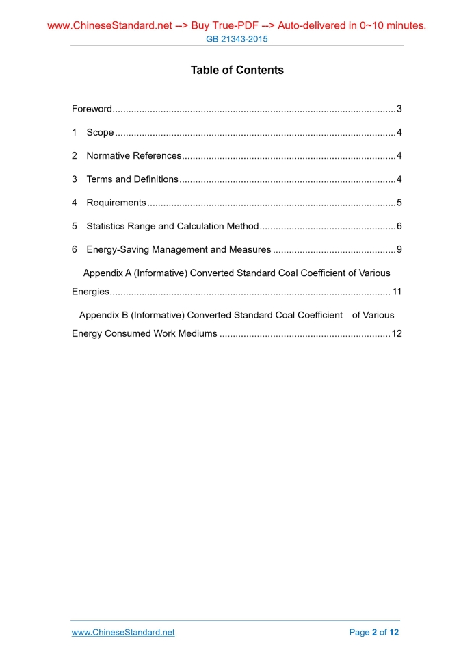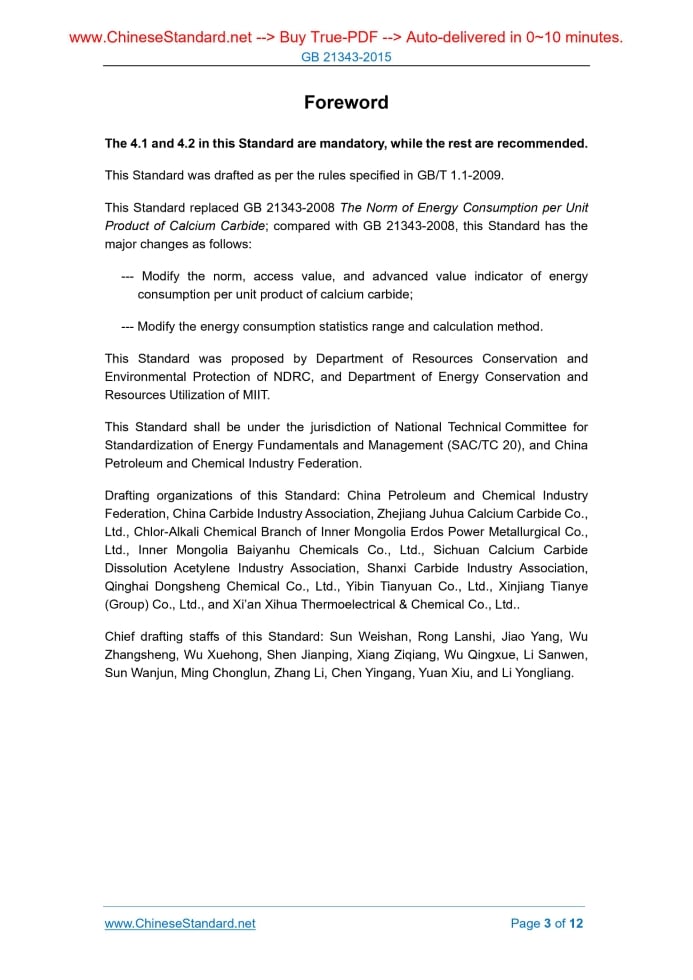 GB 21343-2015: Norm of Energy Consumption per Unit Products of Calcium Carbide---This is an excerpt. Full copy of true-PDF in English version (including equations, symbols, images, flow-chart, tables, and figures etc.), auto-downloaded/delivered in 9 seconds, can be purchased online: https://www.ChineseStandard.net/PDF.aspx/GB21343-2015GB NATIONAL STANDARD OF THE PEOPLE’S REPUBLIC OF CHINA ICS 27.010 F 01 Replacing GB 21343-2008 Norm of Energy Consumption per Unit Products of Calcium Carbide Issued on: SEPTEMBER 11, 2015 Implemented on: OCTOBER 1, 2016 Issued by. General Administration of Quality Supervision, Inspection and Quarantine; Standardization Administration of PRC. Table of ContentsForeword... 3 1 Scope... 4 2 Normative References... 4 3 Terms and Definitions... 4 4 Requirements... 5 5 Statistics Range and Calculation Method... 6 6 Energy-Saving Management and Measures... 9 Appendix A (Informative) Converted Standard Coal Coefficient of Various Energies... 11 Appendix B (Informative) Converted Standard Coal Coefficient of Various Energy Consumed Work Mediums... 12ForewordThe 4.1 and 4.2 in this Standard are mandatory, while the rest are recommended. This Standard was drafted as per the rules specified in GB/T 1.1-2009. This Standard replaced GB 21343-2008 The Norm of Energy Consumption per Unit Product of Calcium Carbide; compared with GB 21343-2008, this Standard has the major changes as follows. --- Modify the norm, access value, and advanced value indicator of energy consumption per unit product of calcium carbide; --- Modify the energy consumption statistics range and calculation method. This Standard was proposed by Department of Resources Conservation and Environmental Protection of NDRC, and Department of Energy Conservation and Resources Utilization of MIIT. This Standard shall be under the jurisdiction of National Technical Committee for Standardization of Energy Fundamentals and Management (SAC/TC 20), and China Petroleum and Chemical Industry Federation. Drafting organizations of this Standard. China Petroleum and Chemical Industry Federation, China Carbide Industry Association, Zhejiang Juhua Calcium Carbide Co., Ltd., Chlor-Alkali Chemical Branch of Inner Mongolia Erdos Power Metallurgical Co., Ltd., Inner Mongolia Baiyanhu Chemicals Co., Ltd., Sichuan Calcium Carbide Dissolution Acetylene Industry Association, Shanxi Carbide Industry Association, Qinghai Dongsheng Chemical Co., Ltd., Yibin Tianyuan Co., Ltd., Xinjiang Tianye (Group) Co., Ltd., and Xi’an Xihua Thermoelectrical & Chemical Co., Ltd.. Chief drafting staffs of this Standard. Sun Weishan, Rong Lanshi, Jiao Yang, Wu Zhangsheng, Wu Xuehong, Shen Jianping, Xiang Ziqiang, Wu Qingxue, Li Sanwen, Sun Wanjun, Ming Chonglun, Zhang Li, Chen Yingang, Yuan Xiu, and Li Yongliang. Norm of Energy Consumption per Unit Products of Calcium Carbide1 ScopeThis Standard specifies the terms and definitions, requirements, statistics range and calculation method, energy conservation management and measures for the energy consumption per unit product of calcium carbide (hereinafter referred to as energy consumption). This Standard is applicable to the calcium carbide enterprises for the energy consumption calculation and evaluation; as well as the control of energy consumption for the new and rebuilt devices.2 Normative ReferencesThe following documents are essential to the application of this document. For the dated documents, only the versions with the dates indicated are applicable to this document; for the undated documents, only the latest version (including all the amendments) are applicable to this document. GB 10665 Calcium Carbide GB/T 12723 General Principles of Stipulation of Energy Consumption Norm for Unit Product GB/T 17167 Guides for Providing and Managing of the Measuring Instruments of Energy in Enterprise3 Terms and DefinitionsThe following terms and definitions stipulated in GB/T 12723 are applicable to this document. 3.1 Comprehensive energy consumption of calcium carbide In the report period, the total amount of various energy consumed actually in the production process of calcium carbide product. room, lounge, locker room, bathhouse, as well as the devices for central control analysis, product inspection, maintenance section etc. 5.1.2 The comprehensive energy consumption shall deduct the output of energy; the following energy transferring externally beyond the production area of calcium carbide, such as closed furnace gas, steam, nitrogen, compressed air and waste heat etc. shall be calculated as the output of energy. 5.1.3 The comprehensive energy consumption of calcium carbide shall specially include the following items. a) The electricity consumption includes the one consumed in the production area like furnace electricity consumption, power electricity consumption, lighting electricity consumption, dust-removing facilities electricity consumption etc.; b) The carbon raw materials consumed for the production of calcium carbide include coke, blue carbon, petroleum coke, blind coal, other carbon as the reducing agent etc. The calculation shall begin from the fist working process entering into the production area; when calculating, deducting the moisture within the carbon; c) The fuel consumed by dry carbon materials, and its calorific value and calculation method are the same as b). If using calcium carbide to produce the waste heat dry carbon materials, its waste heat shall not calculate the fuel consumption; d) The energy-consumed medium that is suppled outside of the production area, such as cooling water (soft water, desalted water), oxygen, nitrogen, compressed air etc.; their calorific values shall be calculated as the specified equivalent ones. 5.1.4 The energy consumption quantity and loss quantity in auxiliary and ancillary production systems shall be distributed to the product. 5.1.5 The calorific values of various energies shall be converted into the uniform measurement unit of standard co