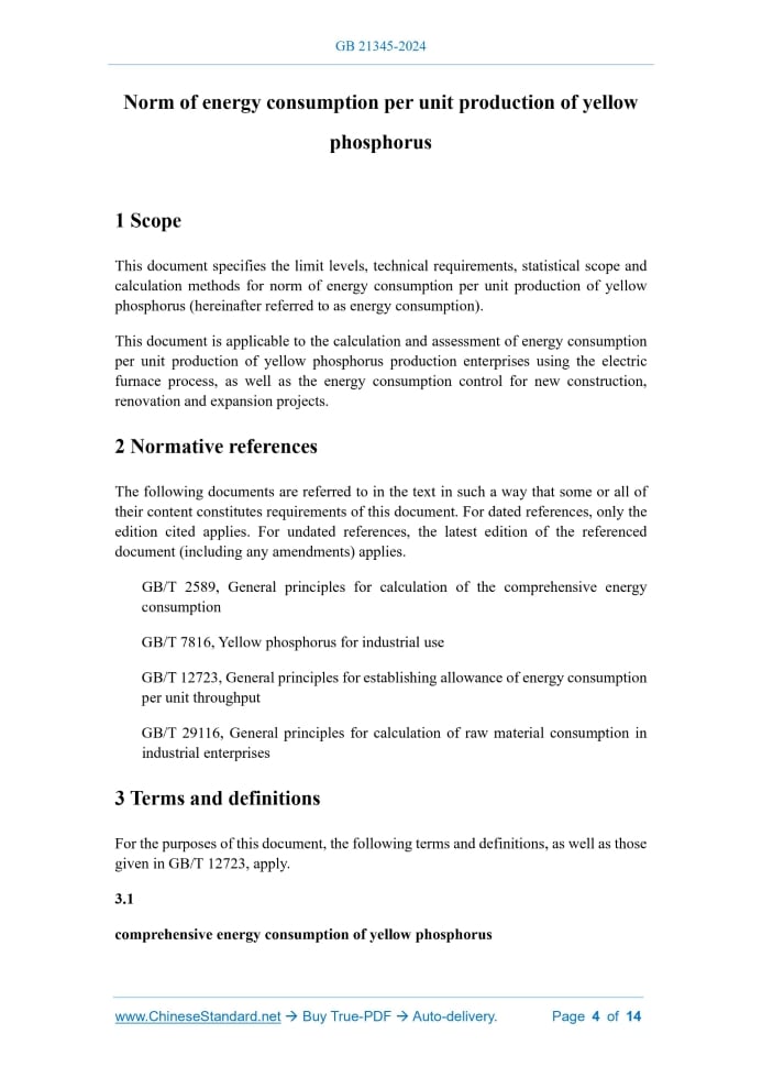 GB 21345-2024: Norm of energy consumption per unit production of yellow phosphorus---This is an excerpt. Full copy of true-PDF in English version (including equations, symbols, images, flow-chart, tables, and figures etc.), auto-downloaded/delivered in 9 seconds, can be purchased online: https://www.ChineseStandard.net/PDF.aspx/GB21345-2024GB NATIONAL STANDARD OF THE PEOPLE’S REPUBLIC OF CHINA ICS 27.010 CCS F 01 Replacing GB 21345-2015 Norm of energy consumption per unit production of yellow phosphorus Issued on: APRIL 29, 2024 Implemented on: MAY 01, 2025 Issued by. State Administration for Market Regulation; Standardization Administration of the People’s Republic of China. Table of ContentsForeword... 3 1 Scope... 4 2 Normative references... 4 3 Terms and definitions... 4 4 Energy consumption norm grade... 5 5 Technical requirements... 5 6 Statistical scope and calculation method... 6 Appendix A (Informative) Reference coefficients of various energy sources for standard coal... 13 Norm of energy consumption per unit production of yellow phosphorus1 ScopeThis document specifies the limit levels, technical requirements, statistical scope and calculation methods for norm of energy consumption per unit production of yellow phosphorus (hereinafter referred to as energy consumption). This document is applicable to the calculation and assessment of energy consumption per unit production of yellow phosphorus production enterprises using the electric furnace process, as well as the energy consumption control for new construction, renovation and expansion projects.2 Normative referencesThe following documents are referred to in the text in such a way that some or all of their content constitutes requirements of this document. For dated references, only the edition cited applies. For undated references, the latest edition of the referenced document (including any amendments) applies. GB/T 2589, General principles for calculation of the comprehensive energy consumption GB/T 7816, Yellow phosphorus for industrial use GB/T 12723, General principles for establishing allowance of energy consumption per unit throughput GB/T 29116, General principles for calculation of raw material consumption in industrial enterprises3 Terms and definitionsFor the purposes of this document, the following terms and definitions, as well as those given in GB/T 12723, apply. 3.1 comprehensive energy consumption of yellow phosphorus Total energy consumption in the entire production process of yellow phosphorus products during the reporting period. 3.2 comprehensive energy consumption per unit production of yellow phosphorus Comprehensive energy consumption of yellow phosphorus expressed by unit output of yellow phosphorus. 3.3 the electric consumption of electric furnace for yellow phosphorus The comprehensive energy consumption of direct heating by electric furnaces expressed by the output of yellow phosphorus during the reporting period. 3.4 comprehensive energy consumption of carbon as the reducing agent in the yellow phosphorus electric furnace The carbonaceous reducing agent (coke, anthracite, etc.) used in the electric furnace reduction reaction is converted into the total energy contained in the coke with 84% fixed carbon in the entire production process of yellow phosphorus during the reporting period according to its carbon content.4 Energy consumption norm gradeThe norm grade of energy consumption per unit production of yellow phosphorus shall be in accordance with the provisions of Table 1, among which Grade 1 is of the lowest energy consumption.5 Technical requirements5.1 Energy consumption limit per unit production of yellow phosphorus The energy consumption limit per unit production of existing yellow phosphorus production equipment shall comply with the requirements for Grade 3 in Table 1. 5.2 Energy consumption access value per unit production of yellow phosphorus The energy consumption access value per unit production of newly constructed and renovated and expanded yellow phosphorus production facilities shall comply with the requirements for Grade 2 in Table 1.6 Statistical scope and calculation method6.1 Statistical scope 6.1.1 Comprehensive energy consumption of yellow phosphorus The statistical scope of comprehensive energy consumption of yellow phosphorus includes various primary energy, secondary energy (electricity, heat, petroleum products, coke, gas, etc.) consumed by production systems, auxiliary production systems, and ancillary production systems, as well as energy-consumed medium used in production (energy consumed by water, oxygen, nitrogen, compressed air, etc.). The energy consumption and loss of the auxiliary production systems and ancillary production systems of enterprises within the production boundary are apportioned to the products according to the consumption ratio method, excluding energy used in the construction and renovation process and living energy (referring to energy used in dormitories, schools, cultural entertainment, medical care, commercial services, childcare and early childhood education within the enterprise system). 6.1.2 Energy consumption of production system The electric furnace production system shall include the energy consumption of the process including raw material crushing, drying, screening, batching unit, phosphate rock reduction unit, crude phosphorus preparation unit (including dust removal/washing and condensation of phosphorus-containing furnace gas), finished product refining and packaging unit, phosphorus sludge recovery, sewage treatment, and tail gas purification. For independent phosphate rock powder pelletizing equipment, its energy consumption is not included in the statistical scope of comprehensive energy consumption of yellow phosphorus. The consumption of coke (or anthracite) shall be calculated based on the actual amount put into the furnace plus the loss. The coke (coal) powder transferred out shall not be included in the total energy c