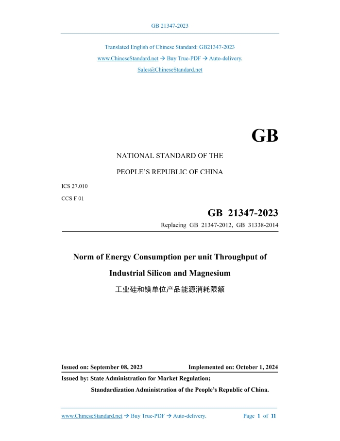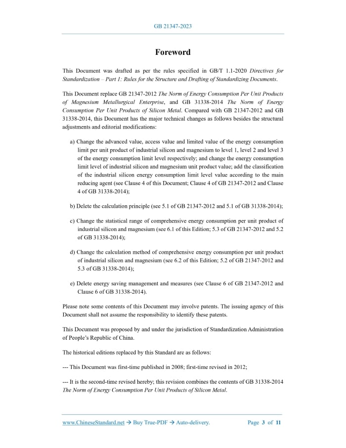 GB 21347-2023: Norm of energy consumption per unit throughput of industrial silicon and magnesium---This is an excerpt. Full copy of true-PDF in English version (including equations, symbols, images, flow-chart, tables, and figures etc.), auto-downloaded/delivered in 9 seconds, can be purchased online: https://www.ChineseStandard.net/PDF.aspx/GB21347-2023 GB NATIONAL STANDARD OF THE PEOPLE’S REPUBLIC OF CHINA ICS 27.010 CCS F 01 Replacing GB 21347-2012, GB 31338-2014 Norm of Energy Consumption per unit Throughput of Industrial Silicon and Magnesium ISSUED ON: SEPTEMBER 08, 2023 IMPLEMENTED ON: OCTOBER 1, 2024 Issued by: State Administration for Market Regulation; Standardization Administration of the People’s Republic of China. Table of ContentsForeword ... 3 1 Scope ... 4 2 Normative References ... 4 3 Terms and Definitions ... 4 4 Norm Level of Energy Consumption ... 5 5 Technical Requirements ... 5 6 Statistical Range and Calculation Method of Energy Consumption ... 5 Appendix A (Informative) Conversion Coefficients of Various Energy Sources to Standard Coal ... 8 Appendix B (Informative) Conversion Coefficient to Standard Coal of Main Energy- Consuming Working Fluid (in Energy Indifference Value) (Reference Value) ... 11ForewordThis Document was drafted as per the rules specified in GB/T 1.1-2020 Directives for Standardization – Part 1: Rules for the Structure and Drafting of Standardizing Documents. This Document replace GB 21347-2012 The Norm of Energy Consumption Per Unit Products of Magnesium Metallurgical Enterprise, and GB 31338-2014 The Norm of Energy Consumption Per Unit Products of Silicon Metal. Compared with GB 21347-2012 and GB 31338-2014, this Document has the major technical changes as follows besides the structural adjustments and editorial modifications: a) Change the advanced value, access value and limited value of the energy consumption limit per unit product of industrial silicon and magnesium to level 1, level 2 and level 3 of the energy consumption limit level respectively; and change the energy consumption limit level of industrial silicon and magnesium unit product value; add the classification of the industrial silicon energy consumption limit level value according to the main reducing agent (see Clause 4 of this Document; Clause 4 of GB 21347-2012 and Clause 4 of GB 31338-2014); b) Delete the calculation principle (see 5.1 of GB 21347-2012 and 5.1 of GB 31338-2014); c) Change the statistical range of comprehensive energy consumption per unit product of industrial silicon and magnesium (see 6.1 of this Edition; 5.3 of GB 21347-2012 and 5.2 of GB 31338-2014); d) Change the calculation method of comprehensive energy consumption per unit product of industrial silicon and magnesium (see 6.2 of this Edition; 5.2 of GB 21347-2012 and 5.3 of GB 31338-2014); e) Delete energy saving management and measures (see Clause 6 of GB 21347-2012 and Clause 6 of GB 31338-2014). Please note some contents of this Document may involve patents. The issuing agency of this Document shall not assume the responsibility to identify these patents. This Document was proposed by and under the jurisdiction of Standardization Administration of People’s Republic of China. The historical editions replaced by this Standard are as follows: --- This Document was first-time published in 2008; first-time revised in 2012; --- It is the second-time revised hereby; this revision combines the contents of GB 31338-2014 The Norm of Energy Consumption Per Unit Products of Silicon Metal. Norm of Energy Consumption per unit Throughput of Industrial Silicon and Magnesium1 ScopeThis Document stipulates the grade, technical requirements, energy consumption statistical range and calculation method for norm of energy consumption per unit throughput of industrial silicon and magnesium. This Document is applicable to the calculation and assessment of energy consumption per unit throughput of industrial silicon and magnesium, as well as the energy consumption control of new construction, renovation and expansion projects. Among them, the energy consumption per unit throughput of magnesium is applicable to the silicothermal magnesium smelting process and is not applicable to other processes such as electrolysis.2 Normative ReferencesThe provisions in following documents become the essential provisions of this Document through reference in this Document. For the dated documents, only the versions with the dates indicated are applicable to this Document; for the undated documents, only the latest version (including all the amendments) is applicable to this Document. GB/T 2589 General principles for calculation of the comprehensive energy consumption GB/T 2881 Silicon metal GB/T 3499 Magnesium ingots GB/T 12723 General principles for establishing allowance of energy consumption per unit throughput3 Terms and DefinitionsFor the purposes of this Document, the terms and definitions given in GB/T 2589 and GB/T 12723 apply. a) Main production system: including the amount of energy consumed by the smelting process, refining process, casting, crushing and screening. It mainly includes the energy consumptions by the following objects, such as the smelting power consumption of the production system (including furnace charge heating, smelting to maintain furnace conditions, oven electricity, furnace washing electricity, power electricity, lighting electricity), carbonaceous reducing agents for ore reduction (including petroleum coke, coal, charcoal, etc., biomass energy such as wood chips is excluded) and energy- consuming working fluids (water, oxygen, compressed air, etc.). Electrode losses are not included in the energy consumption of the production system. b) Auxiliary production system: including raw material preparation, transportation, pouring, finishing, environmental protection facilities, circulating water system and the amount of energy consumed in the transportation of materials and industrial silicon. The ca