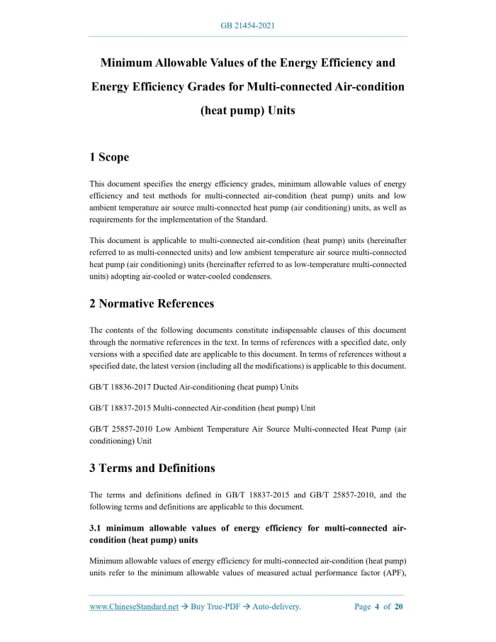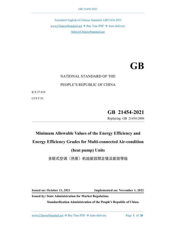 GB 21454-2021: Minimum allowable values of the energy efficiency and energy efficiency grades for multi-connected air-condition (heat pump) units---This is an excerpt. Full copy of true-PDF in English version (including equations, symbols, images, flow-chart, tables, and figures etc.), auto-downloaded/delivered in 9 seconds, can be purchased online: https://www.ChineseStandard.net/PDF.aspx/GB21454-2021 GB NATIONAL STANDARD OF THE PEOPLE’S REPUBLIC OF CHINA ICS 27.010 CCS F 01 Replacing GB 21454-2008 Minimum Allowable Values of the Energy Efficiency and Energy Efficiency Grades for Multi-connected Air-condition (heat pump) Units ISSUED ON: OCTOBER 11, 2021 IMPLEMENTED ON: NOVEMBER 1, 2022 Issued by: State Administration for Market Regulation; Standardization Administration of the People’s Republic of China. Table of ContentsForeword ... 3 1 Scope ... 4 2 Normative References ... 4 3 Terms and Definitions ... 4 4 Energy Efficiency Grades ... 5 5 Technical Requirements ... 7 6 Test Methods ... 8 7 Implementation of the Standard ... 10 Appendix A (normative) Test and Calculation Method for Heating Seasonal Performance Factor of Low Ambient Temperature Air Source Multi-connected Heat Pump (air conditioning) Units ... 11 Minimum Allowable Values of the Energy Efficiency and Energy Efficiency Grades for Multi-connected Air-condition (heat pump) Units1 ScopeThis document specifies the energy efficiency grades, minimum allowable values of energy efficiency and test methods for multi-connected air-condition (heat pump) units and low ambient temperature air source multi-connected heat pump (air conditioning) units, as well as requirements for the implementation of the Standard. This document is applicable to multi-connected air-condition (heat pump) units (hereinafter referred to as multi-connected units) and low ambient temperature air source multi-connected heat pump (air conditioning) units (hereinafter referred to as low-temperature multi-connected units) adopting air-cooled or water-cooled condensers.2 Normative ReferencesThe contents of the following documents constitute indispensable clauses of this document through the normative references in the text. In terms of references with a specified date, only versions with a specified date are applicable to this document. In terms of references without a specified date, the latest version (including all the modifications) is applicable to this document. GB/T 18836-2017 Ducted Air-conditioning (heat pump) Units GB/T 18837-2015 Multi-connected Air-condition (heat pump) Unit GB/T 25857-2010 Low Ambient Temperature Air Source Multi-connected Heat Pump (air conditioning) Unit3 Terms and DefinitionsThe terms and definitions defined in GB/T 18837-2015 and GB/T 25857-2010, and the following terms and definitions are applicable to this document. 3.1 minimum allowable values of energy efficiency for multi-connected air- condition (heat pump) units Minimum allowable values of energy efficiency for multi-connected air-condition (heat pump) units refer to the minimum allowable values of measured actual performance factor (APF), cooling seasonal energy efficiency ratio (SEER), integrated part load value (cooling) [IPLV(C)] or cooling energy efficiency ratio (EER) during the cooling and heating operation under the specified operating conditions. For single-cooling products, only the SEER is assessed. 3.2 minimum allowable values of energy efficiency for low ambient temperature air source multi-connected heat pump (air conditioning) units Minimum allowable values of energy efficiency for low ambient temperature air source multi- connected heat pump (air conditioning) units refer to the minimum allowable values of heating seasonable performance factor (HSPF) and coefficient of performance (COP) of multi- connected heat pump (air conditioning) units that adopt a motor-driven compressor and can generate hot air at an ambient temperature not lower than 25 C during the heating operation under the specified operating conditions. 3.3 energy efficiency ratio at the minimum-load operating conditions for multi- connected air-condition (heat pump) units EERmin Energy efficiency ratio at the minimum-load operating conditions for multi-connected air- condition (heat pump) units refer to the ratio of the cooling capacity to the total electric power consumption of the units when turning on an indoor unit with the minimum cooling capacity for continuous and stable cooling operation under the specified cooling capacity test conditions.4 Energy Efficiency Grades4.1 The energy efficiency of multi-connected units and low-temperature multi-connected units is classified into three grades, in which, Grade-1 represents the highest energy efficiency. 4.2 The energy efficiency of air-cooled single-cooling multi-connectors is classified in accordance with the measured SEER of the products. The measured SEER of each energy efficiency grade shall not be less than the stipulations of Table 1. temperature multi-connectors outdoor units with a nominal heating capacity of less than or equal to 18,000 W, the standby power shall not be greater than 15 W (additional functions that can be turned off during the test shall be turned off). 5.3 Products adopting electric auxiliary heating shall be able to manually turn on and off the electric auxiliary heating system. Meanwhile, the working status of the electric auxiliary heating system shall be indicated in an obvious position. 5.4 When the outdoor dry-bulb temperature of the multi-connectors is higher than or equal to 0 C, the electric auxiliary heating shall not be automatically turned on. 5.5 When the outdoor dry-bulb temperature of the low-temperature multi-connectors is higher than or equal to 20 C, the electric auxiliary heating shall not be automatically turned on. For the low-temperature multi-connectors whose electric auxiliary heating is selected by the user, a port is reserved for the controller, and the start and stop of the auxiliary 