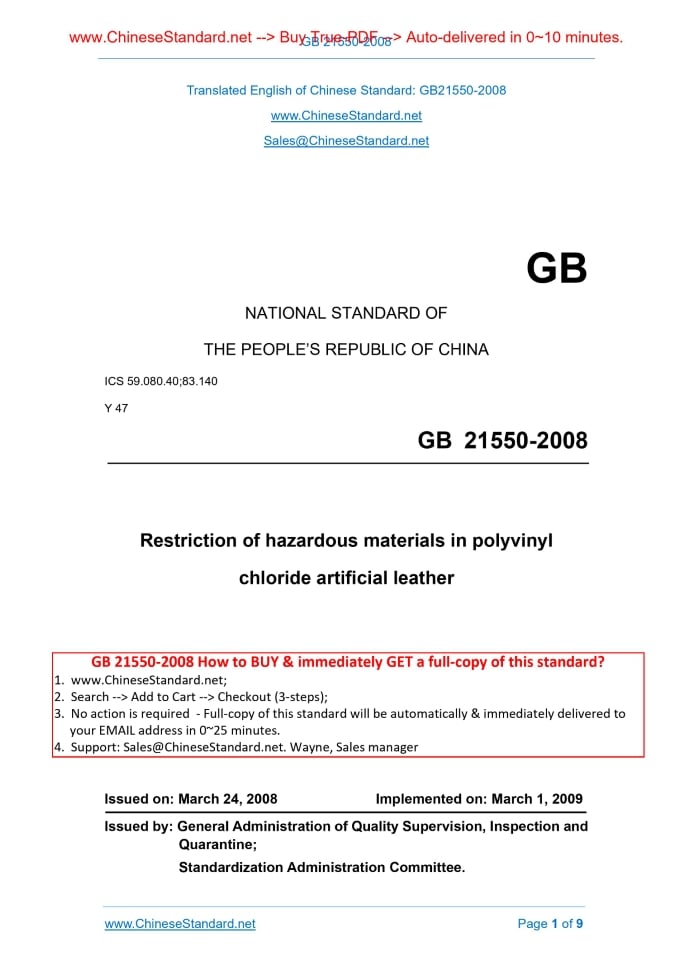 GB 21550-2008: Restriction of hazardous materials in polyvinyl chloride artificial leather Delivery: 9 seconds. True-PDF full-copy in English & invoice will be downloaded + auto-delivered via email. See step-by-step procedure Status: Valid