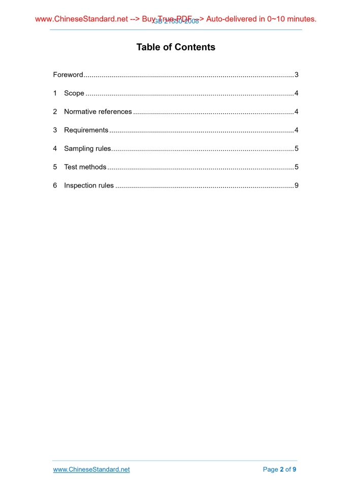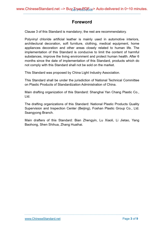 Similar standardsGB 21550-2008: Restriction of hazardous materials in polyvinyl chloride artificial leather---This is an excerpt. Full copy of true-PDF in English version (including equations, symbols, images, flow-chart, tables, and figures etc.), auto-downloaded/delivered in 9 seconds, can be purchased online: https://www.ChineseStandard.net/PDF.aspx/GB21550-2008GB NATIONAL STANDARD OF THE PEOPLE’S REPUBLIC OF CHINA ICS 59.080.40;83.140 Y 47 Restriction of hazardous materials in polyvinyl chloride artificial leather Issued on. MARCH 24, 2008 Implemented on. MARCH 1, 2009 Issued by. General Administration of Quality Supervision, Inspection and Quarantine; Standardization Administration Committee. Table of ContentsForeword... 3 1 Scope... 4 2 Normative references... 4 3 Requirements... 4 4 Sampling rules... 5 5 Test methods... 5 6 Inspection rules... 9ForewordClause 3 of this Standard is mandatory; the rest are recommendatory. Polyvinyl chloride artificial leather is mainly used in automotive interiors, architectural decoration, soft furniture, clothing, medical equipment, home appliances decoration and other areas closely related to human life. The implementation of this Standard is conducive to limit the content of harmful substances, improve the living environment and protect human health. After 6 months since the date of implementation of this Standard, products which do not comply with this Standard shall not be sold on the market. This Standard was proposed by China Light Industry Association. This Standard shall be under the jurisdiction of National Technical Committee on Plastic Products of Standardization Administration of China. Main drafting organization of this Standard. Shanghai Yan Chang Plastic Co., Ltd. The drafting organizations of this Standard. National Plastic Products Quality Supervision and Inspection Center (Beijing), Foshan Plastic Group Co., Ltd. Ssangyong Branch. Main drafters of this Standard. Bian Zhengyin, Lu Xiaoli, Li Jietao, Yang Baohong, Shen Shihua, Zhang Huaihai. Restriction of hazardous materials in polyvinyl chloride artificial leather1 ScopeThis Standard specifies the restriction, test methods, sampling and inspection rules for vinyl chloride monomer, soluble lead, soluble cadmium and other volatiles in polyvinyl chloride artificial leather. This Standard applies to polyvinyl chloride artificial leather (hereinafter referred to as artificial leather) of which takes polyvinyl chloride resin as the main raw material and is added with the appropriate additives, with or without substrate, foam or non-foaming, processed by coating, calendering, composite production process.2 Normative referencesThe following standards contain the provisions which, through reference in this Standard, constitute the provisions of this Standard. For dated references, subsequent amendments (excluding corrections) or revisions do not apply to this Standard. However, the parties who enter into agreement based on this Standard are encouraged to investigate whether the latest versions of these documents are applicable. For undated reference documents, the latest versions apply to this Standard. GB/T 2918-1998 Plastics -- Standard atmospheres for conditioning and testing (idt ISO 291.1997)3 Requirements3.1 Restriction of vinyl chloride monomer The vinyl chloride monomer content in the polyvinyl chloride layer of artificial leather shall not exceed 5 mg/kg. 3.2 Restriction of soluble heavy metals The content of soluble lead in artificial leather shall not exceed 90 mg/kg.4 Sampling rules4.1 In accordance with the provisions of the relevant product standards. It shall be carried out according to 4.2 ~ 4.4 of this Standard in the absence of sampling rules of relevant product standards. 4.2 One roll of samples shall be taken from each batch of products at random. 4.4 After extraction, the samples shall be sealed in a non-polyvinyl chloride plastic bag and placed in a cool place. No special treatment shall be carried out.5 Test methods5.1 Effectiveness Since the date of production, the test shall be carried out after 7 d storage. 5.2 Sampling The test specimen shall be cut at least 50 mm from the edge of the sample. 5.4 Determination of soluble heavy metal content 5.4.1 Apparatus 5.4.2 Reagents and solutions 5.4.2.1 Hydrochloric acid (analytically pure) 5.4.2.6 Deionized water 5.4.3 Specimen preparation Make the artificial leather in a flat state. Evenly extract 2 10 mm × 100 mm specimens along with the direction of width. After respectively weighing, cut it into 10 10 mm × 10 mm specimens. Respectively add 25 mL of hydrochloric acid solution (5.4.2.4). After soaking for 24 h, use deionized water to set the volume to 50 mL. Filter and test the soaking solution. Prepare the blank solution simultaneously. 5.4.4 Apparatus conditions 5.4.5 Drawing of lead standard curve 5.4.5.1 0.1 mg/mL lead standard stock solution Weigh 0.1600 g of lead nitrate (5.4.2.2). Use hydrochloric acid solution (5.4.2.5) to dissolve. Transfer it to 1 L volumetric flask and dilute to scale. Shake it well. 0.1 mg of lead is contained in 1 mL of this solution. 5.4.6 Drawing of cadmium standard curve 5.4.6.1 0.1 mg/mL cadmium standard stock solution Weigh 0.2371 g of cadmium acetate (5.4.2.3). Use hydrochloric acid solution (5.4.2.5) to dissolve it into 1 L volumetric flask. Dilute it to scale. Shake it well. 0.1 mg of cadmium shall be contained in 1 mL of this solution. 5.4.6.2 Cadmium standard solution Respectively pipette 0 mL, 0.5 mL, 1.0 mL, 2.0 mL, 5.0 mL of cadmium standard stock solution (5.4.6.1) into 100 mL volumetric flask. Use hydrochloric acid solution (5.4.2.5) to dilute to scale. Prepare standard solutions of which the cadmium contents are 0 mg/L, 0.5 mg/L, 1.0 mg/L, 2.0 mg/L and 5.0 mg/L. 5.5 Determination of the contents of other volatiles 5.5.1 Instruments and equipment 5.5.2 Specimen preparation and determination method 5.5.3 Calculation Calculate the contents of volatiles according to equation