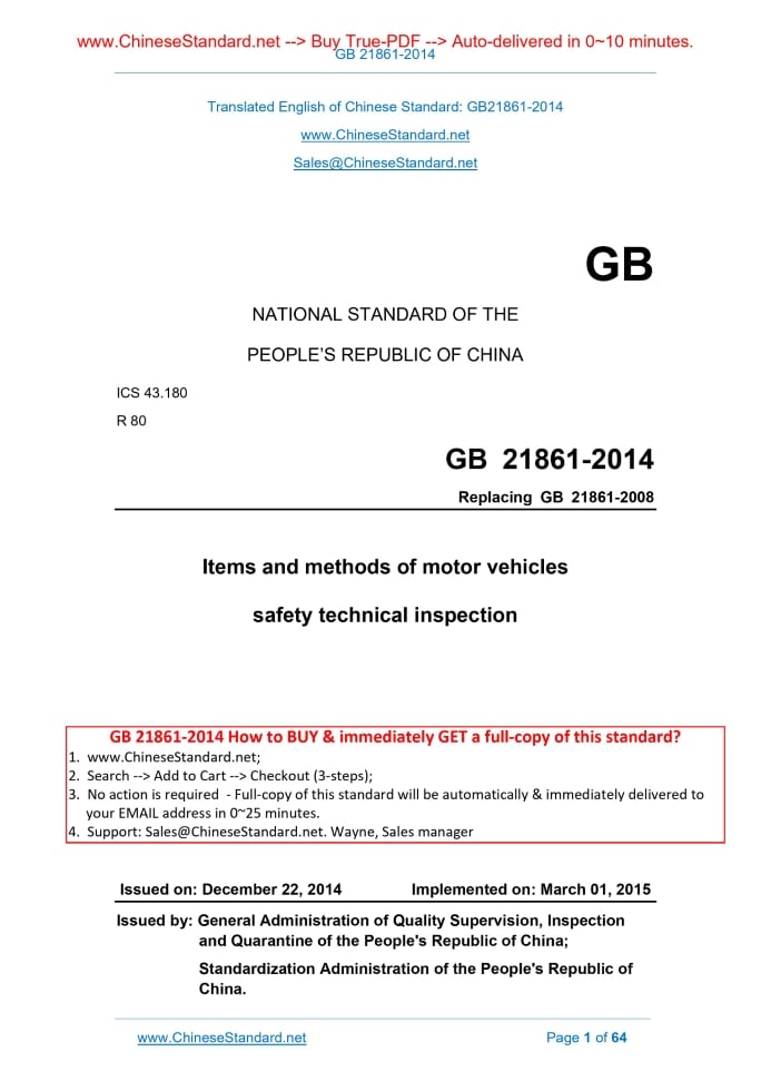 GB 21861-2014: Items and methods of power-driven vehicles safety technology inspection Delivery: 9 seconds. True-PDF full-copy in English & invoice will be downloaded + auto-delivered via email. See step-by-step procedure Status: Obsolete GB 21861: Historical versions