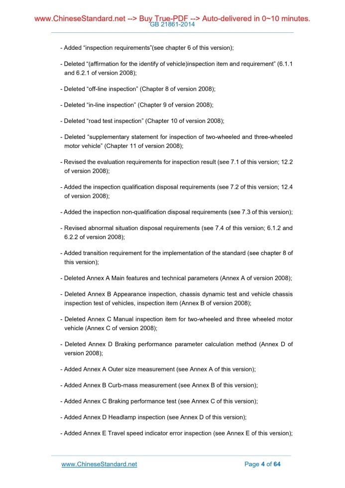 Similar standardsGB 21861-2014: Items and methods of power-driven vehicles safety technology inspection---This is an excerpt. Full copy of true-PDF in English version (including equations, symbols, images, flow-chart, tables, and figures etc.), auto-downloaded/delivered in 9 seconds, can be purchased online: https://www.ChineseStandard.net/PDF.aspx/GB21861-2014GB NATIONAL STANDARD OF THE PEOPLE’S REPUBLIC OF CHINA ICS 43.180 R 80 Replacing GB 21861-2008 Items and methods of motor vehicles safety technical inspection Issued on: DECEMBER 22, 2014 Implemented on: MARCH 01, 2015 Issued by. General Administration of Quality Supervision, Inspection and Quarantine of the People's Republic of China; Standardization Administration of the People's Republic of China. Table of ContentsForeword ... 3 Introduction ... 6 1 Scope ... 8 2 Normative references ... 8 3 Terms and definitions ... 9 4 Inspection items ... 10 5 Inspection method ... 13 6 Inspection requirements ... 19 7 Handling of inspection result ... 36 8 Transitional period of implementation of standards ... 38 Annex A ... 39 Annex B ... 42 Annex C ... 43 Annex D ... 49 Annex E ... 51 Annex F ... 52 Annex G ... 53 Annex H ... 57 Annex I ... 59 Bibliography ... 64 - Added “inspection requirements”(see chapter 6 of this version); - Deleted “(affirmation for the identify of vehicle)inspection item and requirement” (6.1.1 and 6.2.1 of version 2008); - Deleted “off-line inspection” (Chapter 8 of version 2008); - Deleted “in-line inspection” (Chapter 9 of version 2008); - Deleted “road test inspection” (Chapter 10 of version 2008); - Deleted “supplementary statement for inspection of two-wheeled and three-wheeled motor vehicle” (Chapter 11 of version 2008); - Revised the evaluation requirements for inspection result (see 7.1 of this version; 12.2 of version 2008); - Added the inspection qualification disposal requirements (see 7.2 of this version; 12.4 of version 2008); - Added the inspection non-qualification disposal requirements (see 7.3 of this version); - Revised abnormal situation disposal requirements (see 7.4 of this version; 6.1.2 and 6.2.2 of version 2008); - Added transition requirement for the implementation of the standard (see chapter 8 of this version); - Deleted Annex A Main features and technical parameters (Annex A of version 2008); - Deleted Annex B Appearance inspection, chassis dynamic test and vehicle chassis inspection test of vehicles, inspection item (Annex B of version 2008); - Deleted Annex C Manual inspection item for two-wheeled and three wheeled motor vehicle (Annex C of version 2008); - Deleted Annex D Braking performance parameter calculation method (Annex D of version 2008); - Added Annex A Outer size measurement (see Annex A of this version); - Added Annex B Curb-mass measurement (see Annex B of this version); - Added Annex C Braking performance test (see Annex C of this version); - Added Annex D Headlamp inspection (see Annex D of this version); - Added Annex E Travel speed indicator error inspection (see Annex E of this version); Items and methods of motor vehicle safety technical inspection1 ScopeThis Standard specified the inspection items, inspection method, inspection requirements and disposal of inspection results of the motor vehicle safety technical inspection. This Standard is applicable to motor vehicle safety technical inspection institutions for motor vehicle safety technical inspection. This Standard also applies to the entry inspection and quarantine institution for entry of motor vehicle safety technical inspection. Motor vehicles which are approved to conduct actual road test and motor vehicle of temporary entry can conduct safety technical inspection with reference to this Standard. This Standard does not apply to safety technical inspection of tractor on road for tractor transportation unit.2 Normative referencesThe following documents are indispensable for application of this document. For the dated documents so quoted, only the dated versions apply to this document. For the undated documents so quoted, the latest versions (including all modification sheets) apply to this document. GB 1589 Limits of dimensions, axle load and masses for road vehicles GB/T 3730.2 Road vehicle – Masses - Vocabulary and codes GB/T 3730.3 Motor vehicles and towed vehicles - Dimensions of vehicles - Terms and definitions GB 4785 Prescription for installation of the external lighting and light-signalling devices for motor vehicles and their trailers GB 7258-2012 Safe specification for power-driven vehicles operating on roads GB 11567.1 Motor vehicles and trailers - Lateral protection requirements GB 11567.2 Motor vehicles and trailers - Rear underrun protection requirements GB 13094 The safety requirements for bus construction GB 13392 The vehicle mark for road transportation dangerous goods GB 16735 Road vehicle-Vehicle identification number (VIN) GB/T 17676 Natural gas vehicle and liquefied petroleum gas vehicle Identification marks GB 18564.1 Road tanker for dangerous liquid goods transportation - Part 1. Technical requirements of atmospheric pressure metal tank GB 18986 The safety requirements for light bus construction GB/T 19056 Vehicle travelling data recorder GB 19151 Warning triangles for motor vehicle GB 20300 Safety specifications for road transportation vehicle of explosive substance and chemical toxic substance GB 24315 The marker of school bus GB 24407 The safety technique specifications of special school buses GB 25990 Rear-marking plates for vehicles and their trailers GB/T 26765 Specifications for power-driven vehicle safety inspection business information system and networking GA 36 License plate of motor vehicle of the people’s republic of china GA 802 Types of motor vehicle - Terms and definitions GA 804 Special fixing device for license plate of motor vehicle GA 1186 General technical specifications for monitoring system of vehicle safety inspection3 Terms and defin