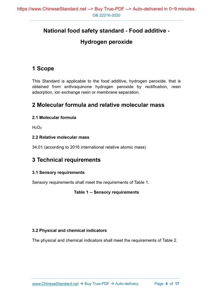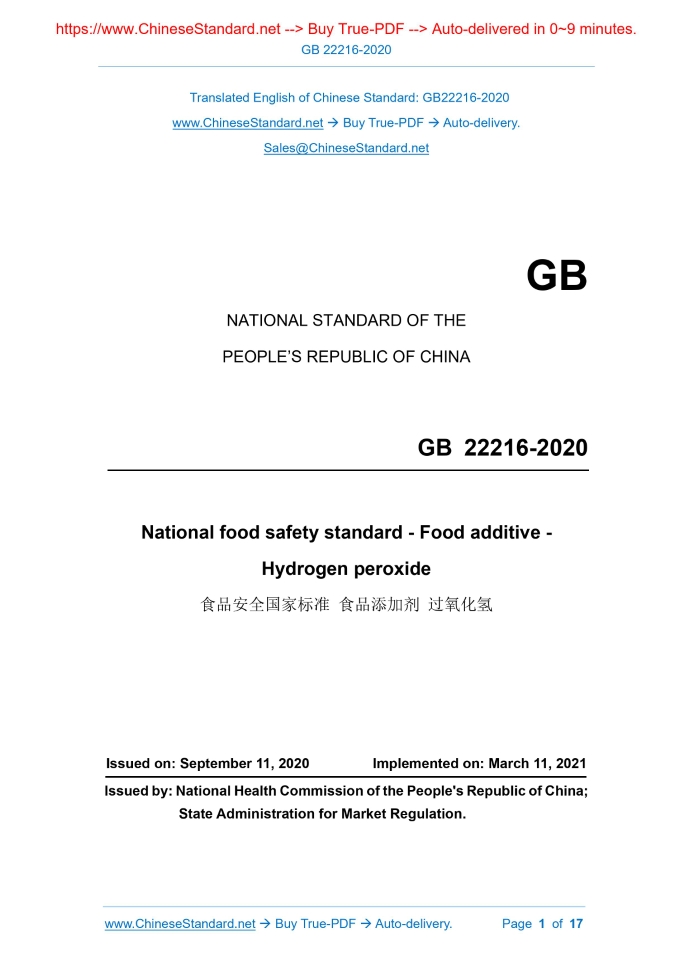GB 22216-2020: National food safety standard - Food additives - Hydrogen peroxide Delivery: 9 seconds. True-PDF full-copy in English & invoice will be downloaded + auto-delivered via email. See step-by-step procedure Status: Valid GB 22216: Historical versions