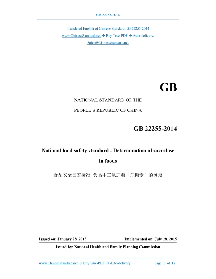 GB 22255-2014: National Food Safety Standard -- Determination of Sucralose in Foods Delivery: 9 seconds. True-PDF full-copy in English & invoice will be downloaded + auto-delivered via email. See step-by-step procedure Status: Obsolete GB 22255: Historical versions