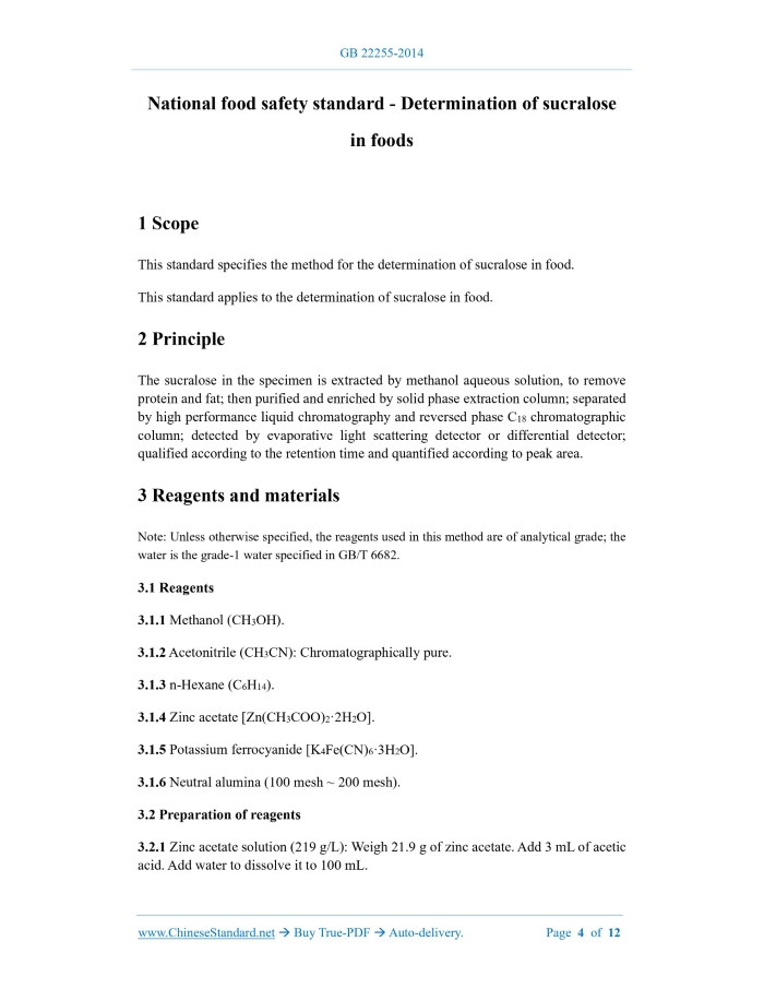 Similar standardsGB 22255-2014: National Food Safety Standard -- Determination of Sucralose in Foods---This is an excerpt. Full copy of true-PDF in English version (including equations, symbols, images, flow-chart, tables, and figures etc.), auto-downloaded/delivered in 9 seconds, can be purchased online: https://www.ChineseStandard.net/PDF.aspx/GB22255-2014GB NATIONAL STANDARD OF THE PEOPLE’S REPUBLIC OF CHINA National food safety standard - Determination of sucralose in foods ISSUED ON: JANUARY 28, 2015 IMPLEMENTED ON: JULY 28, 2015 Issued by: National Health and Family Planning Commission Table of ContentsForeword ... 3 1 Scope ... 4 2 Principle ... 4 3 Reagents and materials ... 4 4 Instruments and equipment ... 5 5 Analytical procedures ... 6 6 Presentation of analysis results ... 9 7 Precision ... 9 8 Others ... 9 Appendix A LC elution procedure in complex cases (applicable to evaporative light scattering detector) ... 11 Appendix B HPLC of sucralose ... 12 National food safety standard - Determination of sucralose in foods1 ScopeThis standard specifies the method for the determination of sucralose in food. This standard applies to the determination of sucralose in food.2 PrincipleThe sucralose in the specimen is extracted by methanol aqueous solution, to remove protein and fat; then purified and enriched by solid phase extraction column; separated by high performance liquid chromatography and reversed phase C18 chromatographic column; detected by evaporative light scattering detector or differential detector; qualified according to the retention time and quantified according to peak area.3 Reagents and materialsNote: Unless otherwise specified, the reagents used in this method are of analytical grade; the water is the grade-1 water specified in GB/T 6682. 3.1 Reagents 3.1.1 Methanol (CH3OH). 3.1.2 Acetonitrile (CH3CN): Chromatographically pure. 3.1.3 n-Hexane (C6H14). 3.1.4 Zinc acetate [Zn(CH3COO)2·2H2O]. 3.1.5 Potassium ferrocyanide [K4Fe(CN)6·3H2O]. 3.1.6 Neutral alumina (100 mesh ~ 200 mesh). 3.2 Preparation of reagents 3.2.1 Zinc acetate solution (219 g/L): Weigh 21.9 g of zinc acetate. Add 3 mL of acetic acid. Add water to dissolve it to 100 mL. 3.2.2 Potassium ferrocyanide solution (106 g/L): Weigh 10.6 g of potassium ferrocyanide. Add water to dissolve to 100 mL. 3.2.3 Methanol aqueous solution (75 + 25): Measure 75 mL of methanol. Add 25 mL of water. Mix well. 3.2.4 Acetonitrile aqueous solution (11 + 89): Measure 11 mL of acetonitrile. Add 89 mL of water. Mix well. 3.3 Standards Sucralose standard (C12H19C13O8): CAS No. 56038-13-2, purity ≥ 99%. 3.4 Preparation of standard solution 3.4.1 Standard stock solution of sucralose (10.0 mg/mL): Weigh 0.25 g (accurate to 0.0001 g) of sucralose standard product, in a 25 mL volumetric flask. Use water to dilute to the mark. Mix well. The concentration of sucralose is 10.0 mg/mL. The stock solution is stored in a refrigerator at 4 °C. The shelf life is 6 months. 3.4.2 Standard intermediate solution of sucralose (1.00 mg/mL): Pipette 5.00 mL of sucralose standard stock solution, into a 50 mL volumetric flask. Use water to dilute it to the mark. Mix well. The concentration of sucralose is 1.00 mg/mL. It is stored in a refrigerator at 4 °C. The shelf life is 3 months. 3.4.3 Standard working solution of sucralose: Pipette 0.200 mL, 0.500 mL, 1.00 mL, 2.00 mL, 4.00 mL of sucralose intermediate solution, into a 10 mL volumetric flask. Use water to dilute to the mark. The concentration of sucralose working solution is 0.0200 mg/mL, 0.0500 mg/mL, 0.100 mg/mL, 0.200 mg/mL, 0.400 mg/mL, respectively. 3.5 Materials Solid-phase extraction cartridges (200 mg, type N-vinylpyrrolidone and divinylbenzene hydrophilic-lipophilic balanced packing) are activated, by 4 mL of methanol and 4 mL of water sequentially, before use.4 Instruments and equipment4.1 High performance liquid chromatography: Equipped with a differential detector or an evaporative light scattering detector. 4.2 Balance: Sensitivity is 0.1 mg and 1 mg. 4.3 Vortex mixer. 4.4 Centrifuge: speed ≥ 3000 r/min. Weigh 2 g of the mixed specimen (accurate to 0.001 g). Put it in a 50 mL centrifuge tube. Add 1.0 g of neutral alumina. Add 3 mL of water. Oscillate it on a vortex mixer for 3 min. Then add 15 mL of methanol. The following steps are same as from 5.1.1.1 "Continue to oscillate for 30 s. Ultrasonically extract for 20 min. Centrifuge at 3000 r/min for 10 min", to 5.1.1.3 "The filtrate is the prepared specimen solution, which is set aside". 5.1.3 Alcohol-containing specimens (fermented wine, blended wine) Weigh 5 g of the mixed specimen (accurate to 0.001 g). Place it in a 50 mL evaporating dish. Evaporate to dryness on a boiling water bath. Use 1.00 mL of acetonitrile aqueous solution (11 + 89), to dissolve the residue. Make the solution pass through a 0.45 μm filter membrane. The filtrate is the prepared specimen solution, which is set aside. 5.1.4 Beverages Weigh 5 g of the mixed specimen (accurate to 0.001 g). Place it in a 15 mL centrifuge tube. Add 5 mL of water. Oscillate on a vortex mixer for 30 s. Centrifuge at 3000 r/min for 10 min. The following steps are processed according to 5.1.1.3. 5.1.5 Flavored fermented milk and milk tea Weigh 1 g ~ 5 g of the mixed specimen (accurate to 0.001 g). Place it in a 50 mL centrifuge tube. Add 5 mL of water. Oscillate on a vortex mixer for 3 min. Then add 15 mL of methanol, 0.50 mL of zinc acetate solution, 0.50 mL of potassium ferrocyanide solution. The following steps are same as from 5.1.1.1 "Continue to oscillate for 30 s. Ultrasonically extract for 20 min. Centrifuge at 3000 r/min for 10 min", to 5.1.1.3 "The filtrate is the prepared specimen solution, which is set aside". The pretreatment of different specimens requires a specimen blank test at the same time. 5.2 Instrument reference conditions 5.2.1 Chromatographic column: C18 column (4.6 mm × 150 mm, 5 μm) or equivalent performance. 5.2.2 Mobile phase: water + acetonitr