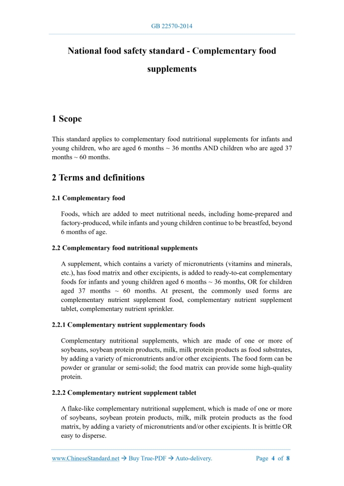 Similar standardsGB 22570-2014: National Food Safety Standard -- Complementary food supplements---This is an excerpt. Full copy of true-PDF in English version (including equations, symbols, images, flow-chart, tables, and figures etc.), auto-downloaded/delivered in 9 seconds, can be purchased online: https://www.ChineseStandard.net/PDF.aspx/GB22570-2014NATIONAL STANDARD OF THE PEOPLE’S REPUBLIC OF CHINA National food safety standard - Complementary food supplements ISSUED ON: APRIL 29, 2014 IMPLEMENTED ON: NOVEMBER 01, 2014 Issued by: National Health and Family Planning Commission of PRC Table of ContentsForeword ... 3 1 Scope ... 4 2 Terms and definitions... 4 3 Technical requirements ... 5 4 Identification ... 8 National food safety standard - Complementary food supplements1 ScopeThis standard applies to complementary food nutritional supplements for infants and young children, who are aged 6 months ~ 36 months AND children who are aged 37 months ~ 60 months.2 Terms and definitions2.1 Complementary food Foods, which are added to meet nutritional needs, including home-prepared and factory-produced, while infants and young children continue to be breastfed, beyond 6 months of age. 2.2 Complementary food nutritional supplements A supplement, which contains a variety of micronutrients (vitamins and minerals, etc.), has food matrix and other excipients, is added to ready-to-eat complementary foods for infants and young children aged 6 months ~ 36 months, OR for children aged 37 months ~ 60 months. At present, the commonly used forms are complementary nutrient supplement food, complementary nutrient supplement tablet, complementary nutrient sprinkler. 2.2.1 Complementary nutrient supplementary foods Complementary nutritional supplements, which are made of one or more of soybeans, soybean protein products, milk, milk protein products as food substrates, by adding a variety of micronutrients and/or other excipients. The food form can be powder or granular or semi-solid; the food matrix can provide some high-quality protein. 2.2.2 Complementary nutrient supplement tablet A flake-like complementary nutritional supplement, which is made of one or more of soybeans, soybean protein products, milk, milk protein products as the food matrix, by adding a variety of micronutrients and/or other excipients. It is brittle OR easy to disperse. 2.2.3 Complementary nutrient sprinklers Powdered or granular complementary nutrient supplements, which are mixed with a variety of micronutrients. It may not contain food substrates.3 Technical requirements3.1 Recommended daily servings of complementary nutrient supplements Complementary nutrient supplement food is 10.0 g ~ 20.0 g. Complementary nutrient supplement tablet is 1.5 g ~ 3.0 g. Complementary nutrient sprinkler is 0.8 g ~ 2.0 g. 3.2 Raw material requirements 3.2.1 The food substrate shall be ready-to-eat food raw materials. Its quality shall meet the corresponding standards and/or relevant provisions. 3.2.2 Soybeans and their processed products shall be treated at high temperature, to eliminate anti-nutritional factors, such as trypsin inhibitors. 3.2.3 Complementary materials shall comply with corresponding standards and/or relevant provisions. 3.3 Sensory requirements The color, taste, smell, texture state of complementary nutritional supplements shall conform to the characteristics of the corresponding product. There shall be no foreign objects visible with normal vision. 3.4 Essential ingredients In the complementary nutrient supplement food, the protein content shall not be less than 25 g/100 g; the inspection method shall meet the requirements of GB 5009.5; the protein content shall be calculated as nitrogen (N) × 6.25. The content of other nutrients, in the complementary nutritional supplements, shall meet the requirements in Table 1, when converted into daily servings. ......Source: Above contents are excerpted from the full-copy PDF -- translated/reviewed by: www.ChineseStandard.net / Wayne Zheng et al. Tips & Frequently Asked Questions:Question 1: How long will the true-PDF of English version of GB 22570-2014 be delivered?Answer: The full copy PDF of English version of GB 22570-2014 can be downloaded in 9 seconds, and it will also be emailed to you in 9 seconds (double mechanisms to ensure the delivery reliably), with PDF-invoice.Question 2: Can I share the purchased PDF of GB 22570-2014_English with my colleagues?Answer: Yes. The purchased PDF of GB 22570-2014_English will be deemed to be sold to your employer/organization who actually paid for it, including your colleagues and your employer's intranet.Question 3: Does the price include tax/VAT?Answer: Yes. Our tax invoice, downloaded/delivered in 9 seconds, includes all tax/VAT and complies with 100+ countries' tax regulations (tax exempted in 100+ countries) -- See Avoidance of Double Taxation Agreements (DTAs): List of DTAs signed between Singapore and 100+ countriesQuestion 4: Do you accept my currency other than USD?Answer: Yes. www.ChineseStandard.us -- GB 22570-2014 -- Click this link and select your country/currency to pay, the exact amount in your currency will be printed on the invoice. Full PDF will also be downloaded/emailed in 9 seconds.Question 5: Should I purchase the latest version GB 22570-2014?Answer: Yes. Unless special scenarios such as technical constraints or academic study, you should always prioritize to purchase the latest version GB 22570-2014 even if the enforcement date is in future. Complying with the latest version means that, by default, it also complies with all the earlier versions, technically.How to buy and download a true PDF of English version of GB 22570-2014?A step-by-step guide to download PDF of GB 22570-2014_EnglishStep 1: Visit website https://www.ChineseStandard.net (Pay in USD), or https://www.ChineseStandard.us (Pay in any currencies such as Euro, KRW, JPY, AUD).Step 2: Search keyword "GB 22570-2014". Step 3: Click "Add to Cart". If multiple PDFs a
