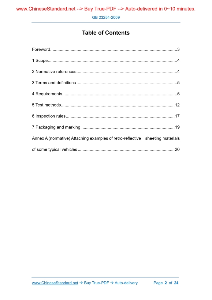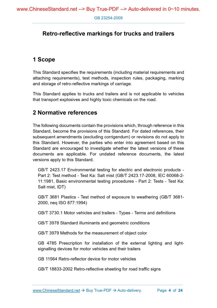 Similar standardsGB 23254-2009: Retro-reflective markings for trucks and trailers---This is an excerpt. Full copy of true-PDF in English version (including equations, symbols, images, flow-chart, tables, and figures etc.), auto-downloaded/delivered in 9 seconds, can be purchased online: https://www.ChineseStandard.net/PDF.aspx/GB23254-2009GB NATIONAL STANDARD OF THE PEOPLE’S REPUBLIC OF CHINA ICS 43.040.20 T 38 Retro-reflective markings for trucks and trailers Issued on: MARCH 06, 2009 Implemented on: JULY 01, 2009 Issued by. General Administration of Quality Supervision, Inspection and Quarantine of the People's Republic of China; Standardization Administration of the People's Republic of China. Table of ContentsForeword ... 3 1 Scope ... 4 2 Normative references ... 4 3 Terms and definitions ... 5 4 Requirements... 5 5 Test methods ... 12 6 Inspection rules ... 17 7 Packaging and marking ... 19 Annex A (normative) Attaching examples of retro-reflective sheeting materials of some typical vehicles ... 20 Retro-reflective markings for trucks and trailers1 ScopeThis Standard specifies the requirements (including material requirements and attaching requirements), test methods, inspection rules, packaging, marking and storage of retro-reflective markings of carriage. This Standard applies to trucks and trailers and is not applicable to vehicles that transport explosives and highly toxic chemicals on the road.2 Normative referencesThe following documents contain the provisions which, through reference in this Standard, become the provisions of this Standard. For dated references, their subsequent amendments (excluding corrigendum) or revisions do not apply to this Standard. However, the parties who enter into agreement based on this Standard are encouraged to investigate whether the latest versions of these documents are applicable. For undated reference documents, the latest versions apply to this Standard. GB/T 2423.17 Environmental testing for electric and electronic products - Part 2. Test method - Test Ka. Salt mist (GB/T 2423.17-2008, IEC 60068-2- 11.1981, Basic environmental testing procedures - Part 2. Tests - Test Ka. Salt mist, IDT) GB/T 3681 Plastics - Test method of exposure to weathering (GB/T 3681- 2000, neq ISO 877.1994) GB/T 3730.1 Motor vehicles and trailers - Types - Terms and definitions GB/T 3978 Standard illuminants and geometric conditions GB/T 3979 Methods for the measurement of object color GB 4785 Prescription for installation of the external lighting and light- signalling devices for motor vehicles and their trailers GB 11564 Retro-reflector device for motor vehicles GB/T 18833-2002 Retro-reflective sheeting for road traffic signs3 Terms and definitionsFor the purpose of this Standard, the terms and definitions defined in GB/T 3730.1, GB 11564 and GB/T 18833-2002 and the following apply. 3.1 retro-reflective markings of carriage A combination of retro-reflective materials that are attached or affixed to the surface of carriage to enhance the recognizability of the vehicle. 3.2 luminance factor A ratio of the luminance of the sample to the luminance of the ideal diffuser under the same illumination and viewing conditions.4 Requirements4.1 Material requirements 4.1.1 Classification According to different materials of retro-reflective markings of carriage, it is divided into retro-reflector device type retro-reflective markings of carriage (hereinafter referred to as retro-reflector device type) and retro-reflective sheeting type retro-reflective markings of carriage (hereinafter referred to as retro-reflective sheeting type). According to different coefficients of retroreflection, retro-reflective sheeting is classified into Class I and Class II. 4.1.2 Retro-reflector device type Retro-reflector device consists of white and red units, and all the performances shall meet the requirements of Category IV A in GB 11564. 4.1.3 Retro-reflective sheeting type 4.1.3.1 Shape and appearance requirements Retro-reflective sheeting consists of strips of white and red units. The white unit of retro-reflective sheeting shall be printed, watermarked, laser- Arbitrarily select 5 red units and 5 white units, wherein the coefficient of retroreflection R’ of any one unit of the same color shall not be greater than 120 % of the average value of the coefficient of retroreflection of all the units of the same color, and shall not be less than 80 % of the average value of the coefficient of retroreflection of all the units. 4.1.3.4.3 Retroreflection in wet state Under the condition that the observation angle is 12' and the entrance angle is -4°, the coefficient of retroreflection R’ of retro-reflective sheeting in wet state shall not be less than 80 % of the values specified in Table 2. 4.1.3.5 Weather resistance After the natural exposure test or the artificial climate accelerated aging test, the surface of retro-reflective sheeting shall have no obvious cracks, nicks, dents, bubbles, wrinkles, erosion, peeling, chalking or deformation, no shrinkage or expansion of more than 1 mm from either side, and no degumming from the edge of the bottom plate. Under the condition where the observation angle is 12' and the entrance angle is -4°, the coefficient of retroreflection R’ shall not be less than 70 % of the corresponding value in Table 2, and the chromaticity coordinates shall still be within the range specified in Table 1. When the results of the natural exposure test conflict with the results of the artificial climate accelerated aging test, the results of the natural exposure test shall prevail. 4.1.3.6 Adhesion performance After the adhesion test, the 180° peel strength of retro-reflective sheeting backing shall not be less than 25 N. 4.1.3.7 Salt mist corrosion resistance After the salt mist test, the retro-reflective sheeting shall not have signs of softening, bubbles, wrinkles, dissolution, discoloration or erosion. Under the condition where the observation angle is 12' and th