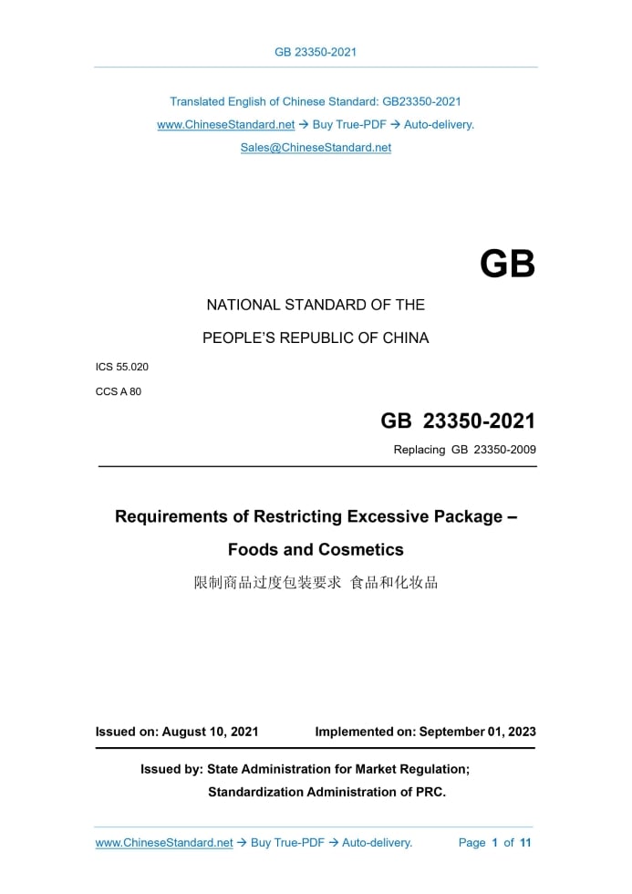 GB 23350-2021: Requirements of restricting excessive package - Foods and cosmetics Delivery: 9 seconds. True-PDF full-copy in English & invoice will be downloaded + auto-delivered via email. See step-by-step procedure Status: Valid GB 23350: Historical versions