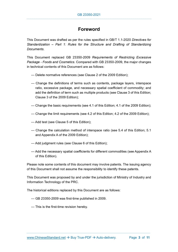 Similar standardsGB 23350-2021: Requirements of restricting excessive package - Foods and cosmetics---This is an excerpt. Full copy of true-PDF in English version (including equations, symbols, images, flow-chart, tables, and figures etc.), auto-downloaded/delivered in 9 seconds, can be purchased online: https://www.ChineseStandard.net/PDF.aspx/GB23350-2021NATIONAL STANDARD OF THE PEOPLE’S REPUBLIC OF CHINA ICS 55.020 CCS A 80 Replacing GB 23350-2009 Requirements of Restricting Excessive Package – Foods and Cosmetics [Including Amendment 1 (2022XG1)] Issued on. AUGUST 10, 2021 Implemented on. SEPTEMBER 01, 2023 Issued by. State Administration for Market Regulation; Standardization Administration of PRC. Table of ContentsForeword... 3 1 Scope... 4 2 Normative References... 4 3 Terms and Definitions... 4 4 Requirements... 5 5 Test... 6 6 Judgment Rules... 8 Appendix A (Normative) Necessary Spatial Coefficient of Commodity... 9 Amendment 1... 12ForewordThis Document was drafted as per the rules specified in GB/T 1.1-2020 Directives for Standardization – Part 1.Rules for the Structure and Drafting of Standardizing Documents. This Document replaced GB 23350-2009 Requirements of Restricting Excessive Package - Foods and Cosmetics. Compared with GB 23350-2009, the major changes in technical contents of this Document are as follows. --- Delete normative references (see Clause 2 of the 2009 Edition); --- Change the definitions of terms such as contents, package layers, interspace ratio, excessive package, and necessary spatial coefficient of commodity; and add the definition of term such as multiple products (see Clause 3 of this Edition; Clause 3 of the 2009 Edition); --- Change the basic requirements (see 4.1 of this Edition; 4.1 of the 2009 Edition); --- Change the limit requirements (see 4.2 of this Edition; 4.2 of the 2009 Edition); --- Add test (see Clause 5 of this Edition); --- Change the calculation method of interspace ratio (see 5.4 of this Edition; 5.1 and Appendix A of the 2009 Edition); --- Add judgment rules (see Clause 6 of this Edition); --- Add the necessary spatial coefficients for different commodities (see Appendix A of this Edition). Please note some contents of this document may involve patents. The issuing agency of this Document shall not assume the responsibility to identify these patents. This Document was proposed by and under the jurisdiction of Ministry of Industry and Information Technology of the PRC. The historical editions replaced by this Document are as follows. --- GB 23350-2009 was first-time published in 2009. --- This is the first-time revision hereby. Requirements of Restricting Excessive Package – Foods and Cosmetics1 ScopeThis Document specifies the requirements, testing and judgment rules for restricting excessive packaging of foods and cosmetics. This Document is applicable to food and cosmetics sales packaging, not to gifts or non-sale items.2 Normative ReferencesThis document has no normative references.3 Terms and DefinitionsFor the purposes of this Document, the following terms and definitions apply. 3.1 Excessive package The package whose interspace ratio, package layers, and package cost exceed the requirements. 3.2 Sales package The package that mainly aims to sell and reaches the consumers together with the contents. 3.3 Contents The foods or cosmetics contained in the package. 3.6 Single piece Items with independent package and that are clearly marked net content. 3.7 Package layers The physically detachable package layers that completely wrap the contents. 3.8 Necessary spatial coefficient of commodity A correction factor for the measurement of space that is required to protect food or cosmetics.4 Requirements4.1 Interspace ratio The interspace ratio of food and cosmetics shall comply with the provisions of Table 1. 4.2 Package layers Grain and its processed products shall not exceed three layers, and other commodities shall not exceed four layers. 4.3 Package cost The production organization shall take measures to control the cost of all packages, except for the package directly in contact with the contents, not to exceed 20% of the product's sales price.5 Test5.1 Sampling For foods and cosmetics of the same variety and package style, the sampling quantity is one piece. 5.2 Equipment and tools Testing equipment and tools such as rulers, callipers, volume measuring instruments, etc. for measurement shall meet the testing requirements and be accurate to 1mm or 1mm3. 5.3 Method of measuring sales package volume 5.3.1 The first method. instrument method (arbitration method) After calibrating the volume measuring instrument in accordance with the operating procedures under normal temperature and pressure, place the product sales package on the instrument measurement platform; start the measurement program; measure the product sales package; and repeat three times; take the arithmetic average value to calculate the product sales package volume. 5.3.3 The third method. other methods When measuring the volume of product sales package by the drainage method or similar methods, under normal temperature and pressure, immerse the sales package in a container that has accurately measured the volume of water (or other uniform fine particles); 5.4 Calculation method of interspace ratio 5.4.1 Calculation Calculate according to formula (1). 5.4.2 Repeatability The absolute difference between two independent determination results obtained under repeatability conditions shall not exceed 10% of the arithmetic mean. 5.5 The calculation method of the package layers 5.5.1 The package that directly touches the contents is the first layer, and so on, the outermost package is the Nth layer, and N is the package layers. 5.6 Calculation method of package cost Calculate according to formula (2).6 Judgment RulesIf one item of the commodity package does not meet the requirements specified in Clause 4, the package of the commodity shall be judged to be excessive pa