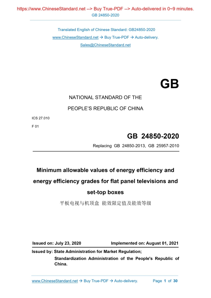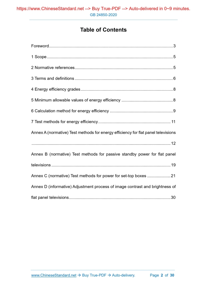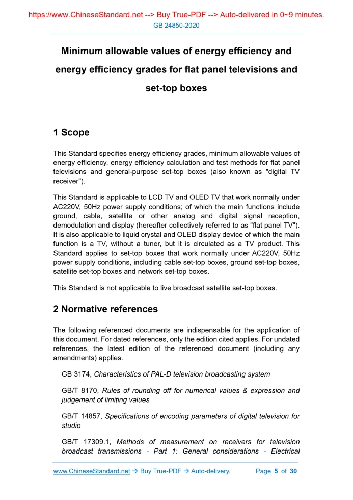 Similar standardsGB 24850-2020: Minimum allowable values of energy efficiency and energy efficiency grades for flat panel televisions and set-top boxes---This is an excerpt. Full copy of true-PDF in English version (including equations, symbols, images, flow-chart, tables, and figures etc.), auto-downloaded/delivered in 9 seconds, can be purchased online: https://www.ChineseStandard.net/PDF.aspx/GB24850-2020 GB NATIONAL STANDARD OF THE PEOPLE’S REPUBLIC OF CHINA ICS 27.010 F 01 Replacing GB 24850-2013, GB 25957-2010 Minimum allowable values of energy efficiency and energy efficiency grades for flat panel televisions and set-top boxes ISSUED ON: JULY 23, 2020 IMPLEMENTED ON: AUGUST 01, 2021 Issued by: State Administration for Market Regulation; Standardization Administration of the People's Republic of China. Table of ContentsForeword ... 3 1 Scope ... 5 2 Normative references ... 5 3 Terms and definitions ... 6 4 Energy efficiency grades ... 8 5 Minimum allowable values of energy efficiency ... 8 6 Calculation method for energy efficiency ... 9 7 Test methods for energy efficiency ... 11 Annex A (normative) Test methods for energy efficiency for flat panel televisions ... 12 Annex B (normative) Test methods for passive standby power for flat panel televisions ... 19 Annex C (normative) Test methods for power for set-top boxes ... 21 Annex D (informative) Adjustment process of image contrast and brightness of flat panel televisions ... 30 Minimum allowable values of energy efficiency and energy efficiency grades for flat panel televisions and set-top boxes1 ScopeThis Standard specifies energy efficiency grades, minimum allowable values of energy efficiency, energy efficiency calculation and test methods for flat panel televisions and general-purpose set-top boxes (also known as "digital TV receiver"). This Standard is applicable to LCD TV and OLED TV that work normally under AC220V, 50Hz power supply conditions; of which the main functions include ground, cable, satellite or other analog and digital signal reception, demodulation and display (hereafter collectively referred to as "flat panel TV"). It is also applicable to liquid crystal and OLED display device of which the main function is a TV, without a tuner, but it is circulated as a TV product. This Standard applies to set-top boxes that work normally under AC220V, 50Hz power supply conditions, including cable set-top boxes, ground set-top boxes, satellite set-top boxes and network set-top boxes. This Standard is not applicable to live broadcast satellite set-top boxes.2 Normative referencesThe following referenced documents are indispensable for the application of this document. For dated references, only the edition cited applies. For undated references, the latest edition of the referenced document (including any amendments) applies. GB 3174, Characteristics of PAL-D television broadcasting system GB/T 8170, Rules of rounding off for numerical values & expression and judgement of limiting values GB/T 14857, Specifications of encoding parameters of digital television for studio GB/T 17309.1, Methods of measurement on receivers for television broadcast transmissions - Part 1: General considerations - Electrical 3.2 passive standby mode the flat panel TV is connected to power supply and produces neither sound nor image, but it can be switched to on mode by remote control or other external signals low power state that the set-top box is connected to power supply and does not provide the main function NOTE: The set-top box can enter this mode only after receiving external excitation signals such as remote control and buttons. Through excitation by remote control device, internal signal, the set-top box can return to on mode from this mode. 3.3 passive standby power under the test methods specified in this Standard, the active power of flat panel TVs and set-top boxes measured in passive standby mode 3.4 on mode static power for flat panel televisions under the test methods specified in this Standard, the active power measured when a flat panel TV is playing a static test image under on mode 3.5 on mode dynamic power for flat panel televisions under the test method specified in this Standard, the active power measured when a flat panel TV is playing dynamic test signals under on mode 3.6 on mode power for flat panel televisions active power used to calculate and evaluate the energy efficiency of flat panel TVs NOTE: The on mode power for flat panel televisions is determined from the on mode static power and the on mode dynamic power, see 6.2. 3.7 fluctuation values of power for flat panel televisions the ratio of the absolute value of the difference between the on mode static power and the on mode dynamic power TO the on mode static power 3.8 minimum allowable values of energy efficiency for flat panel televisions under the test methods specified in this Standard, the minimum energy efficiency value and the maximum passive standby power value allowed for flat panel TVs The minimum energy efficiency required by minimum allowable values of energy efficiency for the flat panel television, of which the resolution is not greater than 1920×1080, is grade 3 of energy efficiency grades in Table 1. The minimum energy efficiency required by minimum allowable values of energy efficiency for the flat panel television, of which the resolution is greater than 1920×1080 but not greater than 3840×2160, is grade 4 of energy efficiency grades in Table 1. The minimum energy efficiency required by minimum allowable values of energy efficiency for the flat panel television, of which the resolution is greater than 3840×2160, is grade 5 of energy efficiency grades in Table 1. The passive standby power of all flat panel televisions shall be less than or equal to 0.50W (be round off according to the relevant provisions of GB/T 8170; keep two significant digits). For flat panel televisions that use external power, the external power supply used shall also 