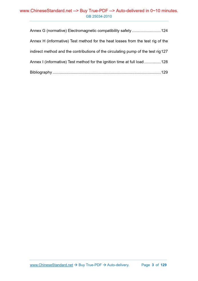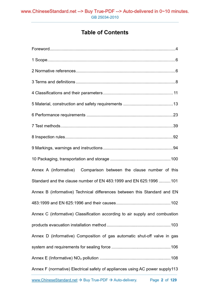 Similar standardsGB 25034-2010: Gas-fired heating and hot water combi-boilers---This is an excerpt. Full copy of true-PDF in English version (including equations, symbols, images, flow-chart, tables, and figures etc.), auto-downloaded/delivered in 9 seconds, can be purchased online: https://www.ChineseStandard.net/PDF.aspx/GB25034-2010GB NATIONAL STANDARD OF THE PEOPLE’S REPUBLIC OF CHINA ICS 91.140.99 P 46 Gas-fired heating and hot water combi-boilers Issued on: SEPTEMBER 02, 2010 Implemented on: JULY 01, 2011 Issued by. General Administration of Quality Supervision, Inspection and Quarantine of the People's Republic of China; Standardization Administration of the People's Republic of China. Table of ContentsForeword... 4 1 Scope... 6 2 Normative references... 6 3 Terms and definitions... 8 4 Classifications and their parameters... 11 5 Material, construction and safety requirements... 13 6 Performance requirements... 23 7 Test methods... 39 8 Inspection rules... 92 9 Markings, warnings and instructions... 94 10 Packaging, transportation and storage... 100 Annex A (informative) Comparison between the clause number of this Standard and the clause number of EN 483.1999 and EN 625.1996... 101 Annex B (informative) Technical differences between this Standard and EN 483.1999 and EN 625.1996 and their causes... 102 Annex C (informative) Classification according to air supply and combustion products evacuation installation method... 103 Annex D (informative) Composition of gas automatic shut-off valve in gas system and requirements for sealing force... 106 Annex E (Informative) NOx pollution... 108 Annex F (normative) Electrical safety of appliances using AC power supply113 Annex G (normative) Electromagnetic compatibility safety... 124 Annex H (informative) Test method for the heat losses from the test rig of the indirect method and the contributions of the circulating pump of the test rig 127 Annex I (informative) Test method for the ignition time at full load... 128 Bibliography... 129Foreword5.3.8, 5.4.3, 5.5.1, 5.5.2, 6.2.1, 6.3.4, 6.4.4, 6.5.3.2, 6.5.5.1 a), b), c), 6.5.5.2 a), b), c), d), e), 6.5.7.3 a), b), 6.6.2, 6.8.2, 9.1.1 d), 9.1.2, 9.2.1, 9.2.2 and Annex F of this Standard are mandatory and the rest are recommended. This Standard modifies EN 483.1999 “Gas-fired central heating boilers - Type C boilers of nominal heat input not exceeding 70 kW” (English version) and EN 625.1996 “Gas-fired central heating boilers - Specific requirements for the domestic hot water operation of combination boilers of nominal heat input not exceeding 70 kw” (English version). In order to facilitate comparison, a list of the comparison of the clauses of this Standard and the clauses modified of the European standards is listed in Annex A. Due to the legal requirements of China and the special needs of industry, this Standard was revised when the two European standards were adopted. A list of technical differences and their causes is given in Annex B for reference. This Standard deletes the following contents in EN 483.1999. 1) Annex A. Product classification and supply conditions of European Community countries; 2) Annex B. Particular national conditions; 3) Annex E. Compilation of the test conditions; 4) Annex K. Examples for marking; 5) Annex N. Requirements and test methods for separate air supply and combustion products evacuation ducts of type C6 boilers; 6) Annex Z. Clauses of this European standard addressing essential requirements or other provisions of EU Directives; 7) Relevant content that the maximum heating working water pressure of appliances is 6 kg. Annexes D, F and G of this standard are normative annexes, Annexes A, B, C, E, H, and I are informative annexes. This Standard was proposed by Ministry of Housing and Urban-Rural Development of the People’s Republic of China. This Standard shall be under the jurisdiction of Ministry of Housing and Urban- Gas-fired heating and hot water combi-boilers1 ScopeThis Standard specifies the terms and definitions, classifications and their parameters, material, construction and safety requirements, performance requirements, test methods, inspection rules, markings, warnings and instructions, packaging, transportation and storage of closed gas-fired heating and hot water combi-boilers (hereinafter referred to as “appliances”). This Standard applies to heating and hot water combi-appliances of which the rated heat input is less than or equal to 70 kW, the maximum heating working water pressure is less than or equal to 0.3 MPa, the water temperature during work is not greater than 95 °C, using atmospheric burner or fan-assisted burner or full premix burner. This Standard also applies to single heating appliances. This Standard does not apply to the following appliances. - outdoor appliances with natural combustion products evacuation duct; - condensing type appliances; - combination type appliances; - appliances in which two sets of independent combustion systems are used for heating and hot water in the same enclosure, including appliances of which heating and hot water systems have common duct.2 Normative referencesThe following documents contain the provisions which, through reference in this Standard, become the provisions of this Standard. For dated references, their subsequent amendments (excluding corrigendum) or revisions do not apply to this Standard. However, the parties who enter into agreement based on this Standard are encouraged to investigate whether the latest versions of these documents are applicable. For undated reference documents, the latest versions apply to this Standard. GB/T 191 Packaging - Pictorial marking for handling of goods (GB/T 191- 2008, ISO 780.1997, MOD) GB/T 1019-2008 General requirements for the package of household and similar electrical appliances GB/T 2828.1 Sampling procedures for inspection by attributes - Part 1. Sampling schemes indexed by acceptance quality limit (AQL) for lot-by-lot inspect