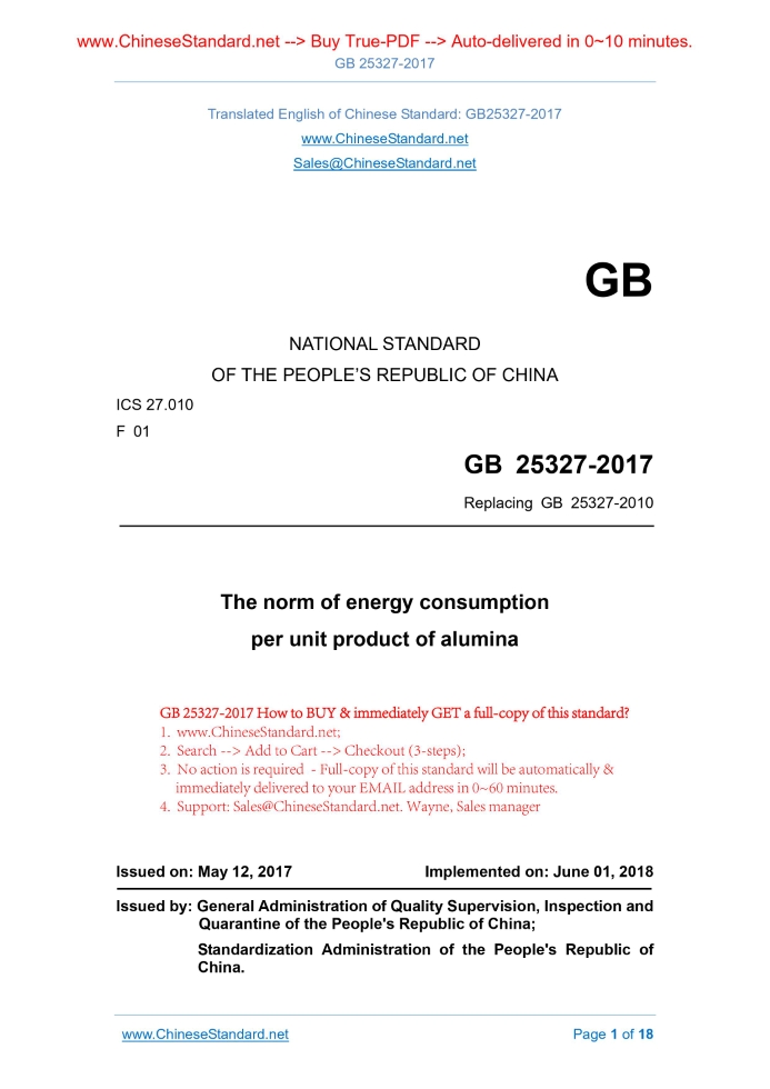 GB 25327-2017: The norm of energy consumption per unit products of alumina Delivery: 9 seconds. True-PDF full-copy in English & invoice will be downloaded + auto-delivered via email. See step-by-step procedure Status: Obsolete GB 25327: Historical versions
