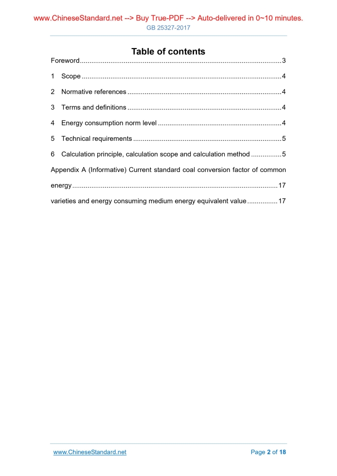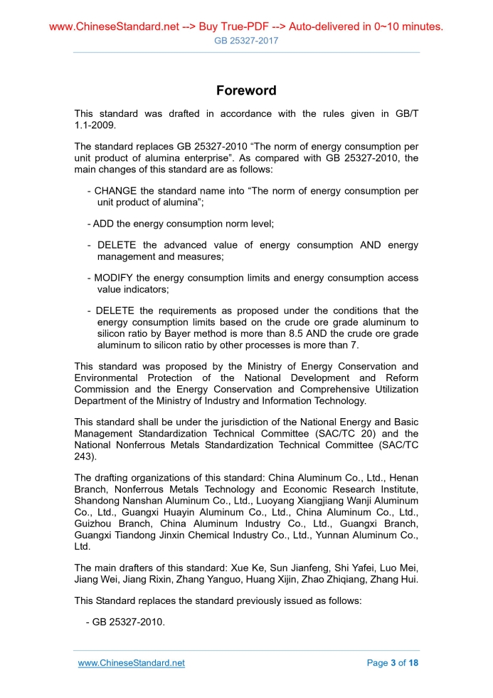 Similar standardsGB 25327-2017: The norm of energy consumption per unit products of alumina---This is an excerpt. Full copy of true-PDF in English version (including equations, symbols, images, flow-chart, tables, and figures etc.), auto-downloaded/delivered in 9 seconds, can be purchased online: https://www.ChineseStandard.net/PDF.aspx/GB25327-2017GB NATIONAL STANDARD OF THE PEOPLE’S REPUBLIC OF CHINA ICS 27.010 F 01 Replacing GB 25327-2010 The norm of energy consumption per unit product of alumina Issued on: MAY 12, 2017 Implemented on: JUNE 01, 2018 Issued by. General Administration of Quality Supervision, Inspection and Quarantine of the People's Republic of China; Standardization Administration of the People's Republic of China. 3. No action is required - Full-copy of this standard will be automatically & immediately delivered to your EMAIL address in 0~60 minutes. Table of ContentsForeword ... 3 1 Scope ... 4 2 Normative references ... 4 3 Terms and definitions ... 4 4 Energy consumption norm level ... 4 5 Technical requirements ... 5 6 Calculation principle, calculation scope and calculation method ... 5 Appendix A (Informative) Current standard coal conversion factor of common energy ... 17 varieties and energy consuming medium energy equivalent value ... 17ForewordThis standard was drafted in accordance with the rules given in GB/T 1.1-2009. The standard replaces GB 25327-2010 “The norm of energy consumption per unit product of alumina enterprise”. As compared with GB 25327-2010, the main changes of this standard are as follows. - CHANGE the standard name into “The norm of energy consumption per unit product of alumina”; - ADD the energy consumption norm level; - DELETE the advanced value of energy consumption AND energy management and measures; - MODIFY the energy consumption limits and energy consumption access value indicators; - DELETE the requirements as proposed under the conditions that the energy consumption limits based on the crude ore grade aluminum to silicon ratio by Bayer method is more than 8.5 AND the crude ore grade aluminum to silicon ratio by other processes is more than 7. This standard was proposed by the Ministry of Energy Conservation and Environmental Protection of the National Development and Reform Commission and the Energy Conservation and Comprehensive Utilization Department of the Ministry of Industry and Information Technology. This standard shall be under the jurisdiction of the National Energy and Basic Management Standardization Technical Committee (SAC/TC 20) and the National Nonferrous Metals Standardization Technical Committee (SAC/TC 243). The drafting organizations of this standard. China Aluminum Co., Ltd., Henan Branch, Nonferrous Metals Technology and Economic Research Institute, Shandong Nanshan Aluminum Co., Ltd., Luoyang Xiangjiang Wanji Aluminum Co., Ltd., Guangxi Huayin Aluminum Co., Ltd., China Aluminum Co., Ltd., Guizhou Branch, China Aluminum Industry Co., Ltd., Guangxi Branch, Guangxi Tiandong Jinxin Chemical Industry Co., Ltd., Yunnan Aluminum Co., Ltd. The main drafters of this standard. Xue Ke, Sun Jianfeng, Shi Yafei, Luo Mei, Jiang Wei, Jiang Rixin, Zhang Yanguo, Huang Xijin, Zhao Zhiqiang, Zhang Hui. This Standard replaces the standard previously issued as follows. - GB 25327-2010. The norm of energy consumption per unit product of alumina1 ScopeThis standard specifies the requirements, calculation principles, calculation scope and calculation method of the norm of energy consumption per unit product of alumina (hereinafter referred to as energy consumption). This standard applies to the calculation and evaluation of the energy consumption of alumina production, as well as the energy control for the newly built, reconstructed, and extended projects.2 Normative referencesThe following documents are essential to the application of this document. For the dated documents, only the versions with the dates indicated are applicable to this document; for the undated documents, only the latest version (including all the amendments) are applicable to this Standard. GB/T 2589 General principles for calculation of the comprehensive energy consumption GB/T 12723 General principles for establishing allowance of energy consumption per unit throughput GB 17167 General principle for equipping and managing of the measuring instrument of energy in organization of energy using3 Terms and definitionsThe terms and definitions as defined in GB/T 2589 and GB/T 12723 apply to this document.4 Energy consumption norm levelThe energy consumption norm level per unit alumina of the alumina production enterprise is as shown in Table 1, wherein the level 1 is the lowest energy consumption. Table 1 -- Energy consumption norm level per unit alumina Energy consumption norm level Process classification Energy consumption per unit alumina, kgce/t Level 1 Bayer method Process energy consumption ≤ 370 Comprehensive energy ≤ 400 compressed air, etc.), and waste heat resources. It includes the loss of the energy and energy consuming medium during the storage inside the enterprise, transfer, and metered supply (including export), as well as the energy sources which are used as raw materials, BUT it excludes the energy consumption for domestic purposes AND the energy consumption for the approved infrastructure projects. 6.1.2 Enterprise production energy consumption in the reporting period There are three calculation methods for the production energy consumption in the reporting period. Method 1. the production energy consumption of enterprise in the reporting period = the amount of energy purchased by the enterprise + the amount of energy stocked at the beginning of the period - the amount of energy exported by the enterprise - the energy consumed by enterprise infrastructure project - the energy consumed for domestic purposes of enterprise - the amount of energy stocked at the end of the period. Method 2. the production energy consumption of enterpri