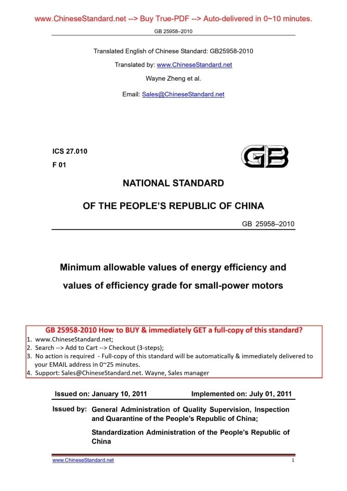 GB 25958-2010: Minimum allowable values of energy efficiency and values of efficiency grade for small-power motors Delivery: 9 seconds. True-PDF full-copy in English & invoice will be downloaded + auto-delivered via email. See step-by-step procedure Status: Obsolete