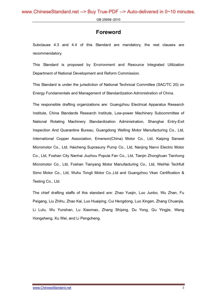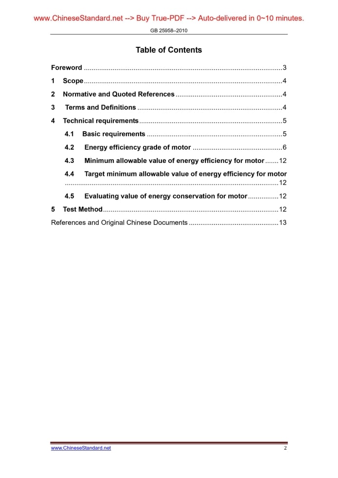 Similar standardsGB 25958-2010: Minimum allowable values of energy efficiency and values of efficiency grade for small-power motors---This is an excerpt. Full copy of true-PDF in English version (including equations, symbols, images, flow-chart, tables, and figures etc.), auto-downloaded/delivered in 9 seconds, can be purchased online: https://www.ChineseStandard.net/PDF.aspx/GB25958-2010 ICS 27.010 F 01 NATIONAL STANDARD Minimum allowable values of energy efficiency and values of efficiency grade for small-power motors Issued on. JANUARY 10, 2011 Implemented on. JULY 01, 2011 Issued by. General Administration of Quality Supervision, Inspection and Quarantine of the People’s Republic of China; Standardization Administration of the People’s Republic of China Table of ContentsForeword... 3 1 Scope... 4 2 Normative and Quoted References... 4 3 Terms and Definitions... 4 4 Technical requirements... 5 4.1 Basic requirements... 5 4.2 Energy efficiency grade of motor... 6 4.3 Minimum allowable value of energy efficiency for motor... 12 4.4 Target minimum allowable value of energy efficiency for motor ... 12 4.5 Evaluating value of energy conservation for motor... 12 5 Test Method... 12 References and Original Chinese Documents... 13ForewordSubclause 4.3 and 4.4 of this Standard are mandatory, the rest clauses are recommendatory. This Standard is proposed by Environment and Resource Integrated Utilization Department of National Development and Reform Commission. This Standard is under the jurisdiction of National Technical Committee (SAC/TC 20) on Energy Fundamentals and Management of Standardization Administration of China. The responsible drafting organizations are. Guangzhou Electrical Apparatus Research Institute, China Standards Research Institute, Low-power Machinery Subcommittee of National Rotating Machinery Standardization Administration, Shanghai Entry-Exit Inspection And Quarantine Bureau, Guangdong Welling Motor Manufacturing Co., Ltd, International Copper Association, Emerson(China) Motor Co., Ltd, Kaiping Sanwei Micromotor Co., Ltd, Haicheng Suprasuny Pump Co., Ltd, Nanjing Nanvi Electric Motor Co., Ltd, Foshan City Nanhai Jiuzhou Popula Fan Co., Ltd, Tianjin Zhonghuan Tianhong Micromotor Co., Ltd, Foshan Tianyang Motor Manufacturing Co., Ltd, WeiHai Techfull Simo Motor Co., Ltd, Wuhu Tongli Motor Co.,Ltd and Guangzhou Vkan Certification & Testing Co., Ltd. The chief drafting staffs of this standard are. Zhao Yuejin, Luo Junbo, Wu Zhan, Fu Peigang, Liu Zhihu, Zhao Kai, Luo Huaiping, Cui Hengdong, Luo Xingen, Zhang Chuanjia, Li Lulu, Wu Yunshan, Lu Xiaomao, Zhang Shiping, Du Yong, Qu Yingjie, Wang Hongsheng, Xu Wei, and Li Pengcheng. Minimum allowable values of energy efficiency and values of efficiency grade for small-power motors1 ScopeThis standard specifies energy efficiency grade, minimum allowable values of energy efficiency, target minimum allowable values of energy efficiency, evaluating values of energy conservation, and test method for small-power asynchronous motors (hereinafter referred to as “motor”). This standard is applicable to general purpose motors - small-power 3-phase asynchronous motor (10 W to 2200 W) powered by 50 Hz & 690 VAC and below voltage; capacitor running asynchronous motor (10 W to 2200 W); capacitor starting asynchronous motor (120 W to 3700 W), double-value capacitor asynchronous motor (250 W to 3000 W); and motor (6 W to 550 W) for air conditioning fan in room etc.2 Normative and Quoted ReferencesThe articles contained in the following documents have become this standard when they are quoted herein. For the dated documents so quoted, all the modifications (excluding corrections) or revisions made thereafter shall not be applicable to this Standard. For the undated documents so quoted, the latest editions shall be applicable to this Standard. GB/T 1032 Test procedures for three-phase induction motors GB/T 5171 General technical requirements for small power motors GB/T 9651-2008 Test procedures for single-phase induction motor3 Terms and DefinitionsFor the purposes of this document, the following terms and definitions apply. 3.1 general purpose motor The motor designed and manufactured in accordance with standard rated value. Its operating characteristics and mechanical structure apply to general operating conditions, and shall not be limited to a certain specified purpose or a certain type of purpose. 3.3 target minimum allowable values of energy efficiency for motors After this Standard has been implemented for certain years (Translator’s Note. see clause 4.4 for the exact number of years), the minimum standard value allowed for efficiency of motor. 3.4 evaluating values of energy conservation for motors The minimum standard value of motor efficiency which meets the requirements of energy conservation certification, under the testing conditions specified by this Standard4 Technical requirements4.1 Basic requirements Safety of motor shall be in accordance with GB 12350. Performance of motor shall be in accordance with GB/T 5171 and in compliance with relevant product standards. 4.2 Energy efficiency grade of motor Energy efficiency grade of motor is divided into 3 grades - Grade 1 is the highest grade of energy efficiency. Under the rated power output, the efficiency of each grade’s motor shall not be less than those specified in Tables 1 to 5. 4.3 Minimum allowable value of energy efficiency for motor Under the condition of rated power output, the minimum allowable values of the energy efficiency of motor shall not be less than Grade 3 specified in Tables 1 to 5. 4.4 Target minimum allowable value of energy efficiency for motor Under the condition of rated power output, the target minimum allowable values of the energy efficiency of motor shall not be less than Grade 2 specified in Tables 1 to 5.This value will be started to implement (Translator’s Note. 4.5 Evaluating value of energy conservation for motor Under the condition of rat