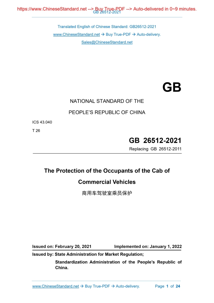 GB 26512-2021: The Protection of the Occupants of the Cab of Commercial Vehicles Delivery: 9 seconds. True-PDF full-copy in English & invoice will be downloaded + auto-delivered via email. See step-by-step procedure Status: Valid GB 26512: Historical versions