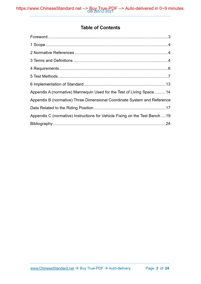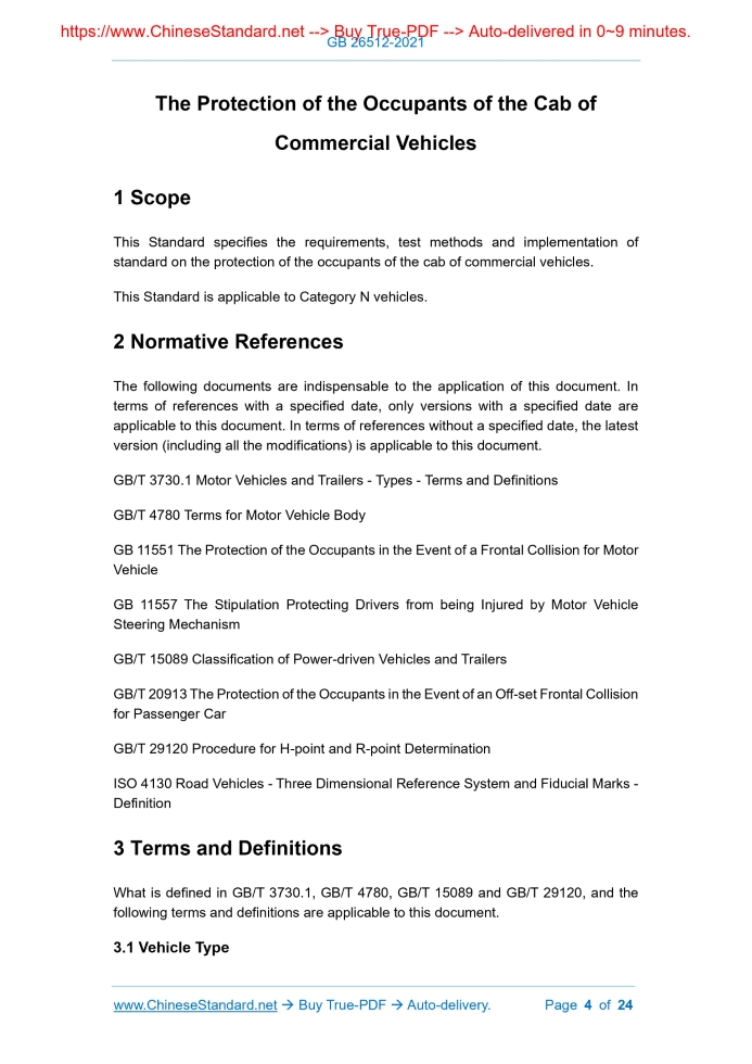 Similar standardsGB 26512-2021: The Protection of the Occupants of the Cab of Commercial Vehicles---This is an excerpt. Full copy of true-PDF in English version (including equations, symbols, images, flow-chart, tables, and figures etc.), auto-downloaded/delivered in 9 seconds, can be purchased online: https://www.ChineseStandard.net/PDF.aspx/GB26512-2021GB NATIONAL STANDARD OF THE PEOPLE’S REPUBLIC OF CHINA ICS 43.040 T 26 Replacing GB 26512-2011 The Protection of the Occupants of the Cab of Commercial Vehicles ISSUED ON: FEBRUARY 20, 2021 IMPLEMENTED ON: JANUARY 1, 2022 Issued by: State Administration for Market Regulation; Standardization Administration of the People’s Republic of China. Table of ContentsForeword ... 3 1 Scope ... 4 2 Normative References ... 4 3 Terms and Definitions ... 4 4 Requirements ... 6 5 Test Methods ... 7 6 Implementation of Standard ... 13 Appendix A (normative) Mannequin Used for the Test of Living Space ... 14 Appendix B (normative) Three Dimensional Coordinate System and Reference Data Related to the Riding Position ... 17 Appendix C (normative) Instructions for Vehicle Fixing on the Test Bench ... 19 Bibliography ... 24 The Protection of the Occupants of the Cab of Commercial Vehicles1 ScopeThis Standard specifies the requirements, test methods and implementation of standard on the protection of the occupants of the cab of commercial vehicles. This Standard is applicable to Category N vehicles.2 Normative ReferencesThe following documents are indispensable to the application of this document. In terms of references with a specified date, only versions with a specified date are applicable to this document. In terms of references without a specified date, the latest version (including all the modifications) is applicable to this document. GB/T 3730.1 Motor Vehicles and Trailers - Types - Terms and Definitions GB/T 4780 Terms for Motor Vehicle Body GB 11551 The Protection of the Occupants in the Event of a Frontal Collision for Motor Vehicle GB 11557 The Stipulation Protecting Drivers from being Injured by Motor Vehicle Steering Mechanism GB/T 15089 Classification of Power-driven Vehicles and Trailers GB/T 20913 The Protection of the Occupants in the Event of an Off-set Frontal Collision for Passenger Car GB/T 29120 Procedure for H-point and R-point Determination ISO 4130 Road Vehicles - Three Dimensional Reference System and Fiducial Marks - Definition3 Terms and DefinitionsWhat is defined in GB/T 3730.1, GB/T 4780, GB/T 15089 and GB/T 29120, and the following terms and definitions are applicable to this document. 3.1 Vehicle Type4 Requirements4.1 General Requirements 4.1.1 The design of the cab and its connection to the vehicle shall eliminate the risk of injuring the occupants in the cab in the event of an accident as much as possible. 4.1.2 Category N1 vehicles and Category N2 vehicles with a total mass of not more than 7,500 kg shall comply with the relevant content of Test A, Test C and Test D specified in 5.5, 5.7 and 5.8. Vehicle types that satisfy the requirements for frontal collision specified in GB 11557 or GB 11551 or GB/T 20913, and vehicles of Category N1 derived from M1 that satisfy the stipulations of GB 11551 or GB/T 20913 may be deemed as compliant with the requirements for frontal impact test (Test A). Test C and Test D are merely conducted on vehicles with a separate cab. 4.1.3 Category N3 vehicles and Category N2 vehicles with a total mass of more than 7,500 kg shall comply with the relevant content of Test A, Test B, Test C and Test D specified in 5.5, 5.6, 5.7 and 5.8. Test C and Test D are merely conducted on vehicles with a separate cab. 4.1.4 The frontal impact test (Test A) is merely conducted on cab-over engine vehicles. 4.1.5 In order to verify the compliance with 4.1.2 or 4.1.3, the vehicle manufacturer shall determine to use 1, 2, 3 or 4 cabs for the tests. The two stages of Test C shall be carried out on the same cab. 4.1.6 If the vehicle manufacturer can perform computer simulations or calculations on the strength of each component of the cab in accordance with the test conditions specified in the standard, or prove through other modes that the cab does not have deformations (intrusion into the living space) that would endanger the occupants after being subjected to Test A, Test B, Test C and Test D, then, Test A, Test B, Test C and Test D may not be carried out. 4.2 Living Space after the Test 4.2.1 After completing each test described in 4.1.2 or 4.1.3, there shall be a living space in the cab to accommodate the mannequin specified in Appendix A on the seat, and when the seat is in the middle position, the mannequin shall not come into contact with non-elastic components on the vehicle with a Shore A hardness of not less than 50. Non-elastic components that can be moved from the mannequin with a force less than 100 N without using any tools are not considered here. In order to facilitate the installation, the mannequin may be disassembled and put into the cab for assembly; the seat is allowed to be adjusted to the final position. After the assembly of the mannequin is completed, the “H” point and the “R” point of the seat shall coincide. The placement of the mannequin and the determination of the “R” point of the seat shall comply with the requirements of GB/T 29120; the reference data of the position of the f---the distance between the swing arms, f ≥ 1,000 mm; L---the length of the swing arms, L ≥ 3,500 mm. Figure 2 -- A-pillar Impact Test (Test B) 5.6.2 The impactor assembly shall be a rigid structure. The impactor is freely suspended by two swing arms rigidly fixed on it; the distance between the swing arms shall be not less than 1,000 mm (see f in Figure 2). The length of the swing arms, from the suspension axis to the geometric center of the impactor, shall be not less than 3,500 mm (see L in Figure 2). 5.6.3 The position where the impactor is suspended shall be such that it satisfies the follow