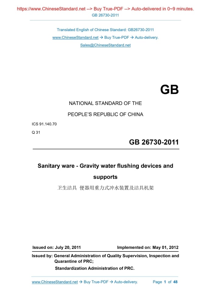 GB 26730-2011: Sanitary ware - Gravity water flushing devices and supports Delivery: 9 seconds. True-PDF full-copy in English & invoice will be downloaded + auto-delivered via email. See step-by-step procedure Status: Valid
