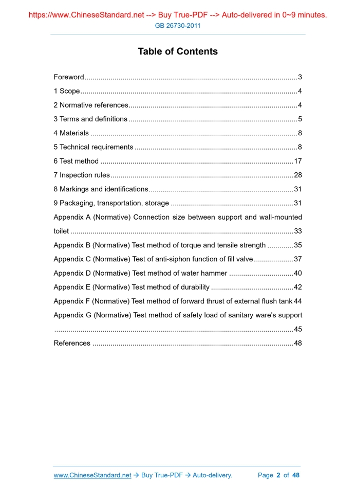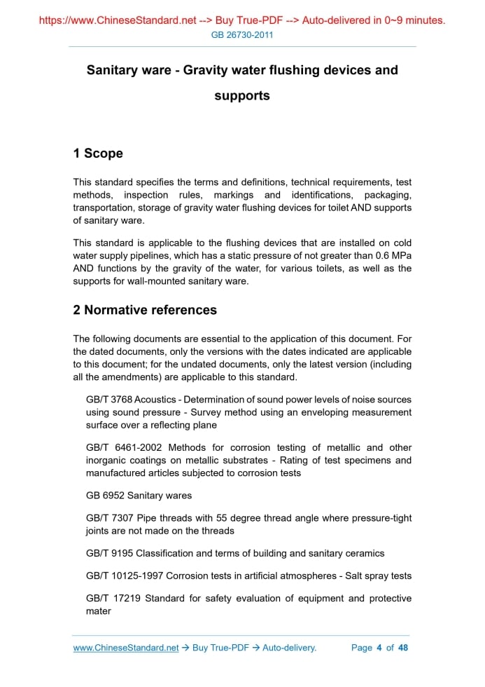 Similar standardsGB 26730-2011: Sanitary ware - Gravity water flushing devices and supports---This is an excerpt. Full copy of true-PDF in English version (including equations, symbols, images, flow-chart, tables, and figures etc.), auto-downloaded/delivered in 9 seconds, can be purchased online: https://www.ChineseStandard.net/PDF.aspx/GB26730-2011GB NATIONAL STANDARD OF THE PEOPLE’S REPUBLIC OF CHINA ICS 91.140.70 Q 31 Sanitary ware - Gravity water flushing devices and supports Issued on. JULY 20, 2011 Implemented on. MAY 01, 2012 Issued by. General Administration of Quality Supervision, Inspection and Quarantine of PRC; Standardization Administration of PRC. Table of ContentsForeword... 3 1 Scope... 4 2 Normative references... 4 3 Terms and definitions... 5 4 Materials... 8 5 Technical requirements... 8 6 Test method... 17 7 Inspection rules... 28 8 Markings and identifications... 31 9 Packaging, transportation, storage... 31 Appendix A (Normative) Connection size between support and wall-mounted toilet... 33 Appendix B (Normative) Test method of torque and tensile strength... 35 Appendix C (Normative) Test of anti-siphon function of fill valve... 37 Appendix D (Normative) Test method of water hammer... 40 Appendix E (Normative) Test method of durability... 42 Appendix F (Normative) Test method of forward thrust of external flush tank 44 Appendix G (Normative) Test method of safety load of sanitary ware's support ... 45 References... 481 ScopeThis standard specifies the terms and definitions, technical requirements, test methods, inspection rules, markings and identifications, packaging, transportation, storage of gravity water flushing devices for toilet AND supports of sanitary ware. This standard is applicable to the flushing devices that are installed on cold water supply pipelines, which has a static pressure of not greater than 0.6 MPa AND functions by the gravity of the water, for various toilets, as well as the supports for wall-mounted sanitary ware.2 Normative referencesThe following documents are essential to the application of this document. For the dated documents, only the versions with the dates indicated are applicable to this document; for the undated documents, only the latest version (including all the amendments) are applicable to this standard. GB/T 3768 Acoustics - Determination of sound power levels of noise sources using sound pressure - Survey method using an enveloping measurement surface over a reflecting plane GB/T 6461-2002 Methods for corrosion testing of metallic and other inorganic coatings on metallic substrates - Rating of test specimens and manufactured articles subjected to corrosion tests GB 6952 Sanitary wares GB/T 7307 Pipe threads with 55 degree thread angle where pressure-tight joints are not made on the threads GB/T 9195 Classification and terms of building and sanitary ceramics GB/T 10125-1997 Corrosion tests in artificial atmospheres - Salt spray tests GB/T 17219 Standard for safety evaluation of equipment and protective mater GB/T 23448 Flexible hose for sanitary tapware3 Terms and definitionsThe terms and definitions as established in GB/T 9195 AND the following terms and definitions apply to this document. 3.1 Flush tank A special flush tank, which is equipped with such accessories as fill valves, flush valves, driving devices, etc., for direct flushing of toilets or other sewage devices. 3.2 Fill valve A device used in the flush tank, to control the water level to a preset position. 3.3 Flush valve A device in the flush tank, that opens or closes the drain hole. 3.4 Affixes of flush tank The components other than the fill valve and the flush valve, which are used to manipulate or assist the flush tank to complete the flushing action, as well as the components for installing or fixing the flush tank or flush tank's accessories. 3.5 Inner flush tank A flush tank that does not have to bear external force, has no appearance requirements, only guarantees the flushing function. It is a flush tank usually set in a ceramic flush tank, OR a flush tank installed in other furniture in a hidden manner.4 Materials4.1 For all materials in the flushing device that are in direct contact with drinking water, they shall meet the requirements of GB/T 17219.Other materials shall meet the requirements of product performance. 4.2 When the toilet uses seawater, reclaimed water, rainwater or other water containing chemical components, the materials and seals used in the gravity flushing device for the toilet shall meet the corresponding requirements for use. The technical requirements and test methods may be agreed between the supplier and the buyer.5 Technical requirements5.1 General technical requirements 5.1.1 Surface quality 5.1.1.1 The outer surface of the metal parts shall not have defects such as shrinkage holes, blisters, cracks or pores; the inner cavity shall not have adhered molding sand. 5.1.1.2 The surface of the plastic part shall not have obvious ripples, weld marks, 5.1.1.4 The appearance quality of ceramic parts shall meet the requirements of GB 6952. 5.1.2 Corrosion resistance of coating on exterior parts After the acid salt spray test, the appearance level of the visible coating surface after installation shall meet the requirements of level 6 in GB/T 6461-2002. 5.1.3 Installation and removal All parts shall be easy to install and disassemble. After installation, all movable parts shall move flexibly without jamming. 5.1.4 Drive mode It shall not use the open-stop (intermittent) drain-close drive mode. 5.1.5 Water volume adjustment function The flushing device shall have the function of adjusting the water volume. For special products that require a fixed water consumption, they can be as required by the contract. 5.2 Technical requirements for fill valve 5.2.1 Thread 5.2.2 Water replenishment ratio 5.2.3 Inlet water flow Under the dynamic pressure of 0.05 MPa, the inlet water flow rate shall not be less than 0.05 L/s. Under the dynamic pre
