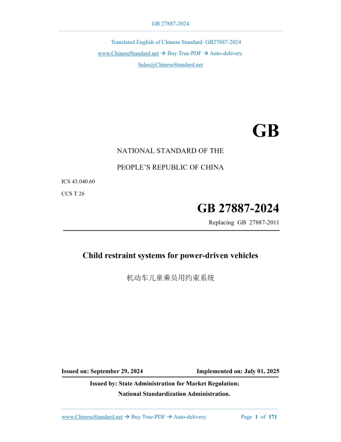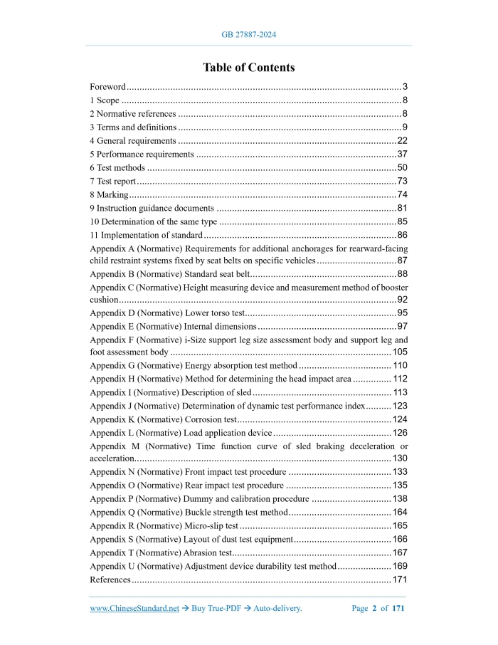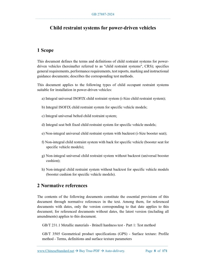 Similar standardsGB 27887-2024: Child restraint systems for power-driven vehicles---This is an excerpt. Full copy of true-PDF in English version (including equations, symbols, images, flow-chart, tables, and figures etc.), auto-downloaded/delivered in 9 seconds, can be purchased online: https://www.ChineseStandard.net/PDF.aspx/GB27887-2024GB NATIONAL STANDARD OF THE PEOPLE’S REPUBLIC OF CHINA ICS 43.040.60 CCS T 26 Replacing GB 27887-2011 Child restraint systems for power-driven vehicles Issued on. SEPTEMBER 29, 2024 Implemented on. JULY 01, 2025 Issued by. State Administration for Market Regulation; National Standardization Administration. Table of ContentsForeword... 3 1 Scope... 8 2 Normative references... 8 3 Terms and definitions... 9 4 General requirements... 22 5 Performance requirements... 37 6 Test methods... 50 7 Test report... 73 8 Marking... 74 9 Instruction guidance documents... 81 10 Determination of the same type... 85 11 Implementation of standard... 86 Appendix A (Normative) Requirements for additional anchorages for rearward-facing child restraint systems fixed by seat belts on specific vehicles... 87 Appendix B (Normative) Standard seat belt... 88 Appendix C (Normative) Height measuring device and measurement method of booster cushion... 92 Appendix D (Normative) Lower torso test... 95 Appendix E (Normative) Internal dimensions... 97 Appendix F (Normative) i-Size support leg size assessment body and support leg and foot assessment body... 105 Appendix G (Normative) Energy absorption test method... 110 Appendix H (Normative) Method for determining the head impact area... 112 Appendix I (Normative) Description of sled... 113 Appendix J (Normative) Determination of dynamic test performance index... 123 Appendix K (Normative) Corrosion test... 124 Appendix L (Normative) Load application device... 126 Appendix M (Normative) Time function curve of sled braking deceleration or acceleration... 130 Appendix N (Normative) Front impact test procedure... 133 Appendix O (Normative) Rear impact test procedure... 135 Appendix P (Normative) Dummy and calibration procedure... 138 Appendix Q (Normative) Buckle strength test method... 164 Appendix R (Normative) Micro-slip test... 165 Appendix S (Normative) Layout of dust test equipment... 166 Appendix T (Normative) Abrasion test... 167 Appendix U (Normative) Adjustment device durability test method... 169 References... 1711 ScopeThis document defines the terms and definitions of child restraint systems for power- driven vehicles (hereinafter referred to as "child restraint systems", CRS); specifies general requirements, performance requirements, test reports, marking and instructional guidance documents; describes the corresponding test methods. This document applies to the following types of child occupant restraint systems suitable for installation in power-driven vehicles. a) Integral universal ISOFIX child restraint system (i-Size child restraint system); b) Integral ISOFIX child restraint system for specific vehicle models; c) Integral universal belted child restraint system; d) Integral seat belt fixed child restraint system for specific vehicle models; e) Non-integral universal child restraint system with backrest (i-Size booster seat); f) Non-integral child restraint system with back for specific vehicle (booster seat for specific vehicle models); g) Non-integral universal child restraint system without backrest (universal booster cushion); h) Non-integral child restraint system without backrest for specific vehicle models (booster cushion for specific vehicle models).2 Normative referencesThe contents of the following documents constitute the essential provisions of this document through normative references in the text. Among them, for referenced documents with dates, only the version corresponding to that date applies to this document; for referenced documents without dates, the latest version (including all amendments) applies to this document. GB/T 231.1 Metallic materials - Brinell hardness test - Part 1.Test method GB/T 3505 Geometrical product specifications (GPS) - Surface texture. Profile method - Terms, definitions and surface texture parameters GB/T 4780 Terms for motor vehicle body GB 6675.3 Safety of toys - Part 3.Flammability GB 6675.4 Safety of toys - Part 4.Migration of certain elements GB 8410 Flammability of automotive interior materials GB/T 8427 Textiles - Tests for color fastness - Color fastness to artificial light. Xenon arc3 Terms and definitionsThe terms and definitions defined in GB/T 4780, GB 14166, GB 14167, as well as the following terms and definitions, apply to this document. 3.1 Child restraint system; CRS Child seat A device that reduces the damage to the wearer in a impact or sudden deceleration, by limiting the movement of the child's body, so that the child occupant can remain in a sitting or sleeping position. 3.2 Integral class A class of child restraint systems in which the child is restrained only by the components of the child restraint system and not directly by the vehicle's seat belts. Note. The components of the child restraint system include child harness belts, impact protection devices, etc. 3.3 Non-integral class A class of child restraint systems that directly restrain children in the child restraint system through the vehicle's seat belts. 3.4 Rigid fixture for the child restraint system ISOFIX An internationally common system that connects the child restraint system to the vehicle through two lower anchorages on the vehicle, two corresponding rigid connecting devices on the child restraint system, a device that limits the flipping of the child restraint system. 3.5 Built-in child restraint system A child restraint system that is an integral part of the vehicle or vehicle seat and is fixed to the vehicle. 3.6 Universal child restraint systems A product type of child restraint system that is applicable to all i-Size seats or all universal seats.4 General requirements4.1 Install