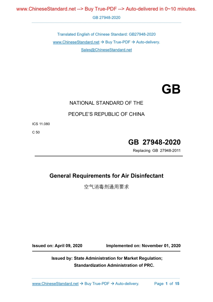 GB 27948-2020: General Requirements for Air Disinfectant Delivery: 9 seconds. True-PDF full-copy in English & invoice will be downloaded + auto-delivered via email. See step-by-step procedure Status: Valid GB 27948: Historical versions