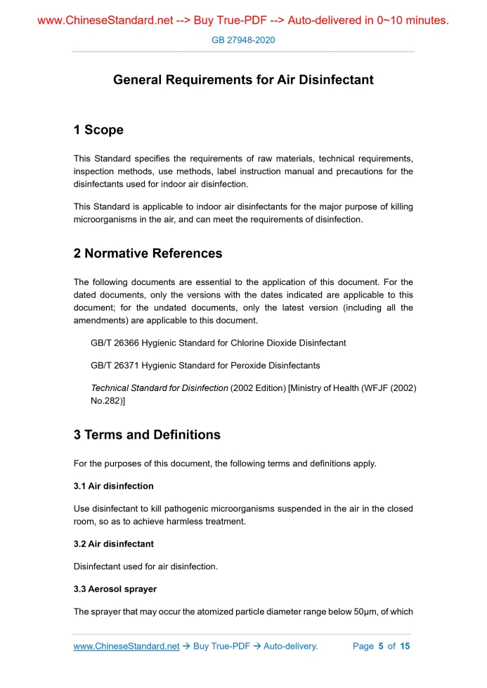 GB 27948-2020: General Requirements for Air Disinfectant---This is an excerpt. Full copy of true-PDF in English version (including equations, symbols, images, flow-chart, tables, and figures etc.), auto-downloaded/delivered in 9 seconds, can be purchased online: https://www.ChineseStandard.net/PDF.aspx/GB27948-2020NATIONAL STANDARD OF THE PEOPLE’S REPUBLIC OF CHINA ICS 11.080 C 50 Replacing GB 27948-2011 General Requirements for Air Disinfectant ISSUED ON: APRIL 09, 2020 IMPLEMENTED ON: NOVEMBER 01, 2020 Issued by: State Administration for Market Regulation; Standardization Administration of PRC. Table of ContentsForeword ... 3 1 Scope ... 5 2 Normative References ... 5 3 Terms and Definitions ... 5 4 Requirements of Raw Materials ... 6 5 Technical Requirements ... 6 6 Inspection Methods ... 7 7 Use Methods ... 7 8 Label, Instruction Manual and Precautions ... 7 Appendix A (Normative) Identification Test of the Air Disinfectant Neutralizer . 9 Appendix B (Normative) Metal Corrosion Test ... 12 General Requirements for Air Disinfectant1 ScopeThis Standard specifies the requirements of raw materials, technical requirements, inspection methods, use methods, label instruction manual and precautions for the disinfectants used for indoor air disinfection. This Standard is applicable to indoor air disinfectants for the major purpose of killing microorganisms in the air, and can meet the requirements of disinfection.2 Normative ReferencesThe following documents are essential to the application of this document. For the dated documents, only the versions with the dates indicated are applicable to this document; for the undated documents, only the latest version (including all the amendments) are applicable to this document. GB/T 26366 Hygienic Standard for Chlorine Dioxide Disinfectant GB/T 26371 Hygienic Standard for Peroxide Disinfectants Technical Standard for Disinfection (2002 Edition) [Ministry of Health (WFJF (2002) No.282)]3 Terms and DefinitionsFor the purposes of this document, the following terms and definitions apply. 3.1 Air disinfection Use disinfectant to kill pathogenic microorganisms suspended in the air in the closed room, so as to achieve harmless treatment. 3.2 Air disinfectant Disinfectant used for air disinfection. 3.3 Aerosol sprayer The sprayer that may occur the atomized particle diameter range below 50μm, of which 5.3.2 Metal corrosion The metal corrosion test shall be carried out, and the corrosion level shall be indicated in the instruction manual of the product.6 Inspection Methods6.1 Test of physical and chemical indicators It shall be carried out as per the provisions of relevant standard. 6.2 Evaluation method of disinfection effect Test according to the relevant provisions of Technical Standard of Disinfection (2002 Edition); thereof, the identification test method of air disinfectant neutralizer can refer to Appendix A. 6.3 Safety inspection method 6.3.1 Inspection methods of toxicological indicators Test according to the relevant provisions of Technical Standard of Disinfection (2002 Edition). 6.3.2 Inspection method of metal corrosion Inspect according to Appendix B.7 Use MethodsDisinfection may be conducted by aerosol spray, heating vaporization fumigation or gas fumigation.8 Label, Instruction Manual and Precautions8.1 The label and instruction manual of the product shall comply with the requirements of the relevant specifications and standards of the disinfectant product label instruction manual, and shall indicate that it can only be used for air disinfection under unmanned conditions. 8.2 When preparing and using the air disinfectant, pay attention to the personal protection; wear the protective mark, protective glasses and protective gloves. If necessary, use the comprehensive respirator. If inadvertently contact, immediately useAppendix A(Normative) Identification Test of the Air Disinfectant Neutralizer A.1 Neutralizer test for liquid impact sampling method A.1.1 Scope of application This method is suitable for evaluation test of 1m3 aerosol cabinet disinfection effect, the sampler is a liquid impact sampler. A.1.2 Preparation of bacterial suspension Take the fresh culture (18h~24h) of the nutrient agar medium slant of Staphylococcus albicans (8032) (3rd generation to 8th generation); use a 5.0mL pipette to take 3.0mL~5.0mL of nutrient broth into the slant test tube; and repeat pressure-vacuum; wash off the bacterial lawn; filter by sterile absorbent cotton; then dilute with nutrient broth to a test bacterial suspension with a concentration of 5×103 CFU/mL ~ 3×104 CFU/mL. A.1.3 Neutralizer identification tests are conducted in three groups A.1.3.1 Group 1: According to the amount of disinfectant required in the instruction manual, spray hard water in a 1m3 aerosol cabinet; after affecting to the disinfection time, immediately use a liquid impact sampler containing 10mL of neutralizer for sampling (sampling volume is consistent with the sampling volume of the pre-setting disinfection effect identification test); then affect for 10min. Pipette 0.1mL of the test bacterial suspension in the above neutralizer solution for counting the live bacteria culture. A.1.3.2 Group 2: According to the amount of disinfectant required in the instruction manual, spray the air disinfectant in a 1m3 aerosol cabinet. After affecting to the disinfection time, immediately use a liquid impact sampler containing 10mL of neutralizer for sampling (sampling volume is consistent with the sampling volume of the pre-setting disinfection effect identification test); then affect for 10min. Pipette 0.1mL of the test bacterial suspension in the above neutralization product solution for counting the live bacteria culture. A.1.3.3 Group 3: According to the amount of disinfectant required in the instruction manual, spray hard water in a 1m3 aerosol cabinet. After affecting to the disinfection time, immediately use a liquid impact sampler containing 10mL of sampling liquid for sampling (