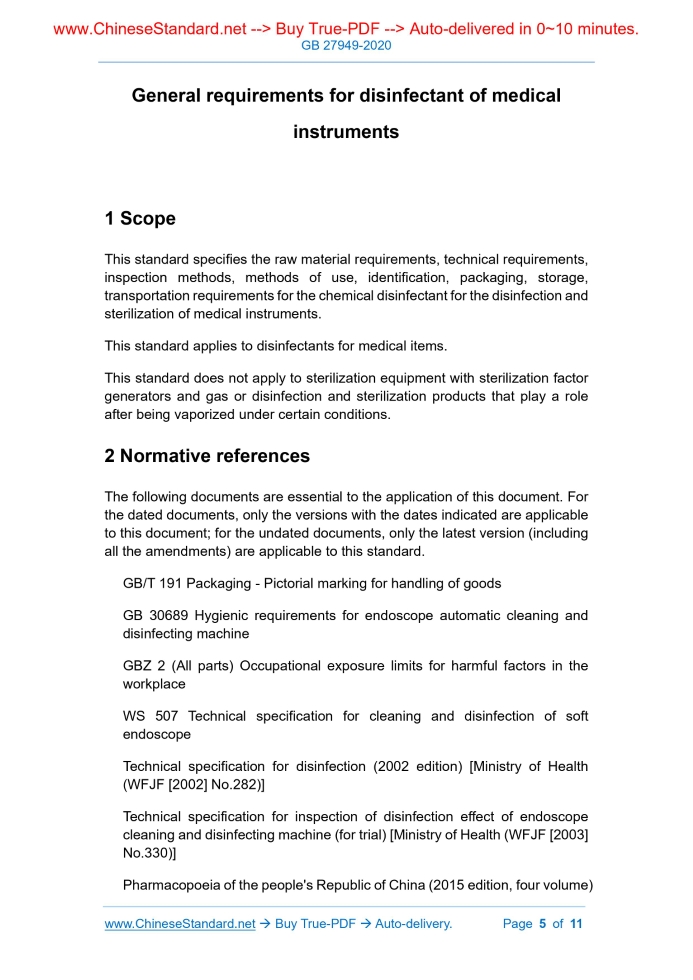 Similar standardsGB 27949-2020: General requirements for disinfectant of medical instruments---This is an excerpt. Full copy of true-PDF in English version (including equations, symbols, images, flow-chart, tables, and figures etc.), auto-downloaded/delivered in 9 seconds, can be purchased online: https://www.ChineseStandard.net/PDF.aspx/GB27949-2020NATIONAL STANDARD OF THE PEOPLE’S REPUBLIC OF CHINA ICS 11.080 C 50 Replacing GB/T 27949-2011 General requirements for disinfectant of medical instruments ISSUED ON: APRIL 09, 2020 IMPLEMENTED ON: NOVEMBER 01, 2020 Issued by: State Administration of Market Regulation; Standardization Administration of PRC. Table of ContentsForeword ... 3 1 Scope ... 5 2 Normative references ... 5 3 Terms and definitions ... 6 4 Raw material requirements ... 6 5 Technical requirements ... 6 6 Inspection methods ... 9 7 Method of use ... 10 8 Markings ... 11 9 Packaging, storage and transportation ... 11 General requirements for disinfectant of medical instruments1 ScopeThis standard specifies the raw material requirements, technical requirements, inspection methods, methods of use, identification, packaging, storage, transportation requirements for the chemical disinfectant for the disinfection and sterilization of medical instruments. This standard applies to disinfectants for medical items. This standard does not apply to sterilization equipment with sterilization factor generators and gas or disinfection and sterilization products that play a role after being vaporized under certain conditions.2 Normative referencesThe following documents are essential to the application of this document. For the dated documents, only the versions with the dates indicated are applicable to this document; for the undated documents, only the latest version (including all the amendments) are applicable to this standard. GB/T 191 Packaging - Pictorial marking for handling of goods GB 30689 Hygienic requirements for endoscope automatic cleaning and disinfecting machine GBZ 2 (All parts) Occupational exposure limits for harmful factors in the workplace WS 507 Technical specification for cleaning and disinfection of soft endoscope Technical specification for disinfection (2002 edition) [Ministry of Health (WFJF [2002] No.282)] Technical specification for inspection of disinfection effect of endoscope cleaning and disinfecting machine (for trial) [Ministry of Health (WFJF [2003] No.330)] Pharmacopoeia of the people's Republic of China (2015 edition, four volume) 5.5.2 Requirements for simulated field test 5.5.2.1 Sterilizer At the minimum action concentration specified in the instruction manual and the dose of 50% of the shortest action time, if there is no growth of viable bacteria [Bacillus subtilis black variant (ATCC9372) spores] on the simulated medical item to be tested, it shall determine that the simulated field sterilization test of the medical item is qualified. 5.5.2.2 High-level disinfectant At the minimum action concentration specified in the instruction manual and the dose of the shortest action time, if the killing or logarithmic value of the spores of Bacillus subtilis black variant (ATCC9372) on the simulated medical item to be tested is not less than 3.00, it shall determine that the simulated field sterilization test of the medical item is qualified. 5.5.2.3 Intermediate-level disinfectant At the minimum action concentration specified in the instruction manual and the dose of the shortest action time, if the killing or logarithmic value of the Mycobacterium (ATCC19977) on the simulated medical item to be tested is not less than 3.00, it shall determine that the simulated field sterilization test of the medical item is qualified. 5.5.2.4 Low-level disinfectant Among the Staphylococcus aureus (ATCC6538), Pseudomonas aeruginosa (ATCC15422), Candida albicans (ATCC10231), select the microorganism with the strongest resistance to the tested disinfectant as the experimental microorganism. At the minimum action concentration specified in the instruction manual and the dose of the shortest action time, if the killing or extinction log- value of the microorganisms tested on the simulated medical item shall not be less than 3.00, it shall determine that the simulated field sterilization test of the medical item is qualified. 5.6 Requirements for disinfectants used in conjunction with disinfection instruments The special purpose disinfectants used in conjunction with the relevant disinfection and sterilization devices, such as disinfectants for endoscopes, disinfectants for dialysis machine’s pipelines, etc., shall meet the requirements of corresponding disinfection and sterilization devices such as WS507, GB 30689 as well as relevant national standards. It shall verify the simulated disinfection and sterilization effects used in conjunction with related equipment. It is determined according to the relevant test methods in the "Technical specifications for disinfection" (2002 edition).7 Method of use7.1 General 7.1.1 Medical items are preferred to be handled by thermal disinfection and sterilization. 7.1.2 The method of use shall comply with the standards and specifications of various types of disinfectants. 7.1.3 Before disinfecting or sterilizing the newly launched medical items, it shall first remove the oil stains and protective films; then use detergent to wash it to remove the grease; dry it. 7.1.4 Before disinfection or sterilization of contaminated medical items after use, they shall be fully cleaned and dried; the shaft joint shall be opened during treatment to fully expose it to disinfectant. 7.1.5 The sterilant which needs to be diluted before use as well as the high and intermediate level disinfectant shall be diluted by purified water, to avoid the influence of calcium, magnesium and other impurities on the disinfection effect. 7.2 Soak disinfection 7.2.1 Immerse the medical item to be treated in the disinfectant to make it completely submerged; then cover t
