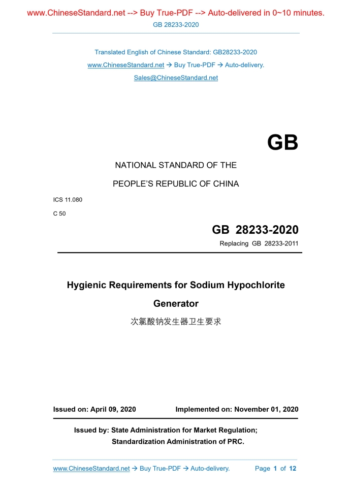 GB 28233-2020: Hygienic Requirements for Sodium Hypochlorite Generator Delivery: 9 seconds. True-PDF full-copy in English & invoice will be downloaded + auto-delivered via email. See step-by-step procedure Status: Valid GB 28233: Historical versions