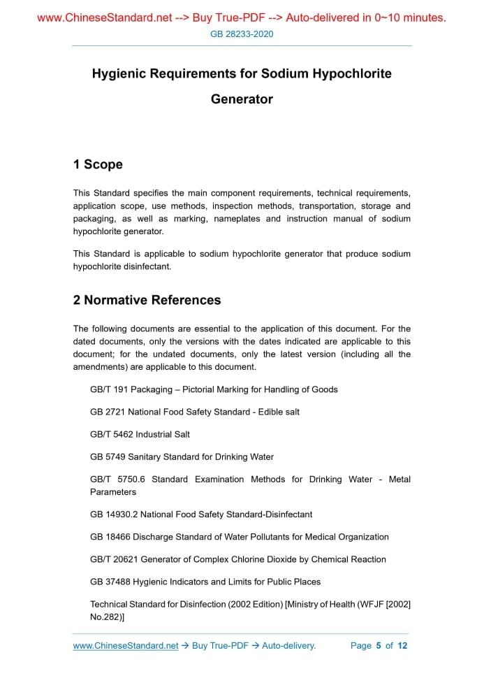 Similar standardsGB 28233-2020: Hygienic Requirements for Sodium Hypochlorite Generator---This is an excerpt. Full copy of true-PDF in English version (including equations, symbols, images, flow-chart, tables, and figures etc.), auto-downloaded/delivered in 9 seconds, can be purchased online: https://www.ChineseStandard.net/PDF.aspx/GB28233-2020GB NATIONAL STANDARD OF THE PEOPLE’S REPUBLIC OF CHINA ICS 11.080 C 50 Replacing GB 28233-2011 Hygienic Requirements for Sodium Hypochlorite Generator ISSUED ON: APRIL 09, 2020 IMPLEMENTED ON: NOVEMBER 01, 2020 Issued by: State Administration for Market Regulation; Standardization Administration of PRC. Table of ContentsForeword ... 3 1 Scope ... 5 2 Normative References ... 5 3 Terms and Definitions ... 6 4 Main Component Requirements ... 6 5 Technical Requirements ... 6 6 Application Scope ... 8 7 Use Methods ... 8 8 Inspection Methods ... 10 9 Transportation, Storage and Packaging ... 11 10 Marking, Nameplate and Instruction Manual ... 11 Hygienic Requirements for Sodium Hypochlorite Generator1 ScopeThis Standard specifies the main component requirements, technical requirements, application scope, use methods, inspection methods, transportation, storage and packaging, as well as marking, nameplates and instruction manual of sodium hypochlorite generator. This Standard is applicable to sodium hypochlorite generator that produce sodium hypochlorite disinfectant.2 Normative ReferencesThe following documents are essential to the application of this document. For the dated documents, only the versions with the dates indicated are applicable to this document; for the undated documents, only the latest version (including all the amendments) are applicable to this document. GB/T 191 Packaging – Pictorial Marking for Handling of Goods GB 2721 National Food Safety Standard - Edible salt GB/T 5462 Industrial Salt GB 5749 Sanitary Standard for Drinking Water GB/T 5750.6 Standard Examination Methods for Drinking Water - Metal Parameters GB 14930.2 National Food Safety Standard-Disinfectant GB 18466 Discharge Standard of Water Pollutants for Medical Organization GB/T 20621 Generator of Complex Chlorine Dioxide by Chemical Reaction GB 37488 Hygienic Indicators and Limits for Public Places Technical Standard for Disinfection (2002 Edition) [Ministry of Health (WFJF [2002] No.282)] Sanitation and Safety Evaluation Specifications for Drinking Water Disinfectants and Disinfection Equipment (Trial Implementation) [Ministry of Health (WJDF [2005] No.336)]3 Terms and DefinitionsFor the purpose of this document, the following terms and definitions apply. 3.1 Sodium hypochlorite generator A device that uses salt or industrial salt solution electrolysis to produce sodium hypochlorite disinfectant. 3.2 Sodium hypochlorite disinfectant A disinfectant with sodium hypochlorite as the main component, which is directly produced by the sodium hypochlorite generator and does not contain any added substances. 3.3 Available chlorine The amount of chlorine equivalent to the oxidizing ability of chlorine-containing disinfectants, which is a symbol of the oxidizing ability of chlorine-containing disinfectants.4 Main Component Requirements4.1 Electrode requirements Titanium, platinum, ruthenium, iridium and other metals and their coated electrodes shall be used to prepare sodium hypochlorite disinfectant. Graphite electrodes and lead dioxide electrodes shall not be used. 4.2 Display system Instruments, switches, indicators, signs, etc. shall be installed firmly, reliably and safely. The voltage, current, power, flow and other parameters shall be displayed on the display screen.5 Technical Requirements5.1 Equipment requirements 5.1.1 It shall include some structures such as automatic salt melting, rectifying power Disinfection (2002 Edition). 8.3 Flowrate It shall be performed in accordance with the provisions of GB/T 20621. 8.4 Inspection of lead, copper and cadmium content It shall be performed in accordance with the provisions of GB/T 5750.6. 8.5 Microbial killing effect It shall be performed in accordance with the provisions of Technical Standard for Disinfection (2002 Edition).9 Transportation, Storage and Packaging9.1 Transportation There shall be measures such as sun protection and rain protection during transportation; loading and unloading shall be avoided upside down; or storage and transportation shall be performed according to the order contract. 9.2 Storage The products shall be stored in a cool, dry place and a clean room with good ventilation. 9.3 Packaging 9.3.1 The package marking shall comply with the requirements of the relevant specifications and standards of the label instructions of the disinfection product. 9.3.2 The graphic marking shall meet the requirements of GB/T 191.10 Marking, Nameplate and Instruction Manual10.1 Marking 10.1.1 Rated value, available chlorine content and range. 10.1.2 Mark the use scope and use method of the product in accordance with the provisions of Clauses 6 and 7. 10.1.3 Safety protection requirements for production environment, use environment, and disinfection operators. ......Source: Above contents are excerpted from the full-copy PDF -- translated/reviewed by: www.ChineseStandard.net / Wayne Zheng et al. Tips & Frequently Asked Questions:Question 1: How long will the true-PDF of English version of GB 28233-2020 be delivered?Answer: The full copy PDF of English version of GB 28233-2020 can be downloaded in 9 seconds, and it will also be emailed to you in 9 seconds (double mechanisms to ensure the delivery reliably), with PDF-invoice.Question 2: Can I share the purchased PDF of GB 28233-2020_English with my colleagues?Answer: Yes. The purchased PDF of GB 28233-2020_English will be deemed to be sold to your employer/organization who actually paid for it, including your colleagues and your employer's intranet.Question 3: Does the price include tax/VAT?Answer: Yes. Our tax invoice, downloaded/delivered in 9 seconds, includes all 