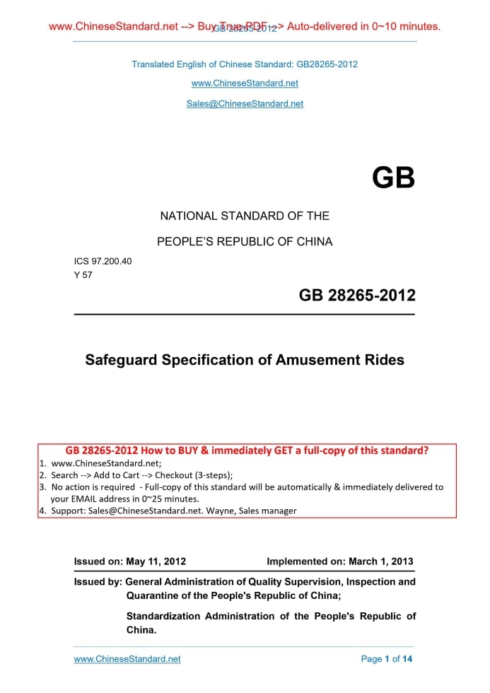 GB 28265-2012: Safeguard Specification of Amusement Rides Delivery: 9 seconds. True-PDF full-copy in English & invoice will be downloaded + auto-delivered via email. See step-by-step procedure Status: Valid