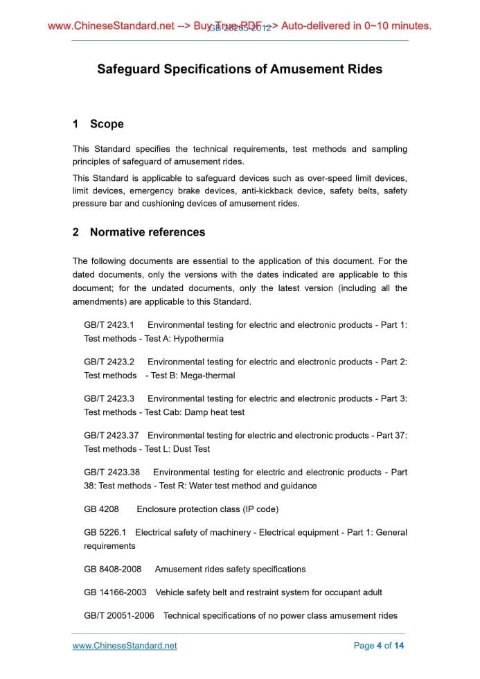Similar standardsGB 28265-2012: Safeguard Specification of Amusement Rides---This is an excerpt. Full copy of true-PDF in English version (including equations, symbols, images, flow-chart, tables, and figures etc.), auto-downloaded/delivered in 9 seconds, can be purchased online: https://www.ChineseStandard.net/PDF.aspx/GB28265-2012GB NATIONAL STANDARD OF THE PEOPLE’S REPUBLIC OF CHINA ICS 97.200.40 Y 57 Safeguard Specification of Amusement Rides Issued on. MAY 11, 2012 Implemented on. MARCH 1, 2013 Issued by. General Administration of Quality Supervision, Inspection and Quarantine of the People's Republic of China; Standardization Administration of the People's Republic of China. Table of ContentsForeword... 3 1 Scope... 4 2 Normative references... 4 3 Terms and definitions... 5 4 Technical Requirements... 6 5 Test methods... 9 6 Sampling principles... 13ForewordClauses 4.1.1, 4.4.4, 4.4.5, 4.5 of this Standard are mandatory, the rest are recommended. This Standard is drafted in accordance with the rules given in GB/T 1.1-2009. This Standard shall be under the jurisdiction of National Standardization Technical Committee of Ropeway and Amusement Rides (SAC/TC 250). Drafting organization of this Standard. Chinese Special Equipment Inspection and Research Institute. Chief drafting staffs of this Standard. Xiao Yuan, Ma Wenfei, Zheng Zhitao, Fu Hengsheng, E Lijun, Pang Ang. Safeguard Specifications of Amusement Rides1 ScopeThis Standard specifies the technical requirements, test methods and sampling principles of safeguard of amusement rides. This Standard is applicable to safeguard devices such as over-speed limit devices, limit devices, emergency brake devices, anti-kickback device, safety belts, safety pressure bar and cushioning devices of amusement rides.2 Normative referencesThe following documents are essential to the application of this document. For the dated documents, only the versions with the dates indicated are applicable to this document; for the undated documents, only the latest version (including all the amendments) are applicable to this Standard. GB/T 2423.1 Environmental testing for electric and electronic products - Part 1. Test methods - Test A. Hypothermia GB/T 2423.2 Environmental testing for electric and electronic products - Part 2. Test methods - Test B. Mega-thermal GB/T 2423.3 Environmental testing for electric and electronic products - Part 3. Test methods - Test Cab. Damp heat test GB/T 2423.37 Environmental testing for electric and electronic products - Part 37. Test methods - Test L. Dust Test GB/T 2423.38 Environmental testing for electric and electronic products - Part 38.Test methods - Test R. Water test method and guidance GB 4208 Enclosure protection class (IP code) GB 5226.1 Electrical safety of machinery - Electrical equipment - Part 1.General requirements3 Terms and definitionsThe following terms and definitions are applicable to this document. 3.1 Safeguard In safety functions, the guards or protection devices that protect people from existing harm or imminent harm. 3.2 Electric devices The devices that achieve specified safety functions through coordinating mechanical devices, electronics and electrical components. 3.3 Mechanical devices The devices that achieve specified safety functions through mechanical devices. 3.4 Fault The status of a characteristic that can not perform a specified function. 3.5 Trigger threshold The physical quantity to trigger the safeguard. 3.6 Display error The value difference between measurement value and safeguard’s display value. 3.7 Action error When safeguard triggers, the value difference between its actual physical quantity and trigger threshold.4 Technical Requirements4.1 Basic Functions 4.1.1 The safeguard shall be applicable to amusement rides’ condition requirements; when the physical quantities which act on safeguard are reaching to its trigger threshold, the safeguard shall act as required. 4.2 Alarm function 4.2.1 The safeguard shall be equipped with automatic alarm function; when it fails, it shall be able to alert sound or light alarm signal. 4.2.2 The alarm signal shall be triggered by safeguard’s action; the sound alarm signal shall has apparent difference with amusement rides’ environmental noise. The alarm sound shall pass the tests specified by 5.14; all sound level shall not be lower than 75dB (A). The light alarm signal shall use red color; it shall be clearly visible within the range of the operating personnel. 4.3 Safety requirements of mechanical devices The mechanical devices shall meet the requirements of 7.4 ~ 7.7 in GB 8408-2008, in which, the axis, the pin and the important welds that relate directly to personal safety, shall pass the test specified by 5.2.1 and 6.3. 4.4 Safety and environmental suitability requirements of electric devices 4.4.1 The electric devices shall meet the requirements specified by GB 5226.1; and the safeguard, which uses programmable devices, shall also meet the requirements specified by GB/T 20438.2. 4.5 Error determination of safeguard 4.5.1 For safeguard with display function, in laboratory condition, with respect to the action values, the display error shall not exceed ± 3%; when using whole amusement rides to conduct the test, it shall not exceed ± 5%. 4.5.2 When testing under the laboratory condition, the action error of electric devices shall not exceed ± 3%; the action error of mechanical devices shall not exceed ± 5%. 4.6 Flexible restraining devices 4.6.1 The safety belt (containing components such as lock) shall meet the requirements in 7.6.7 of GB 8408-2008, and shall pass the test specified by 5.2.3. 4.6.2 The elastic ropes which protect personal safety directly, shall specify the restriction of the breaking force, usage count and failure time; the elastic ropes for bungee shall meet the requirements specified in Part 4 of GB/T 20051-2006 at the same time, and shall be able to pass the tests specified by 5.2.4 and 5.3.3. 4.9 Emergency b
